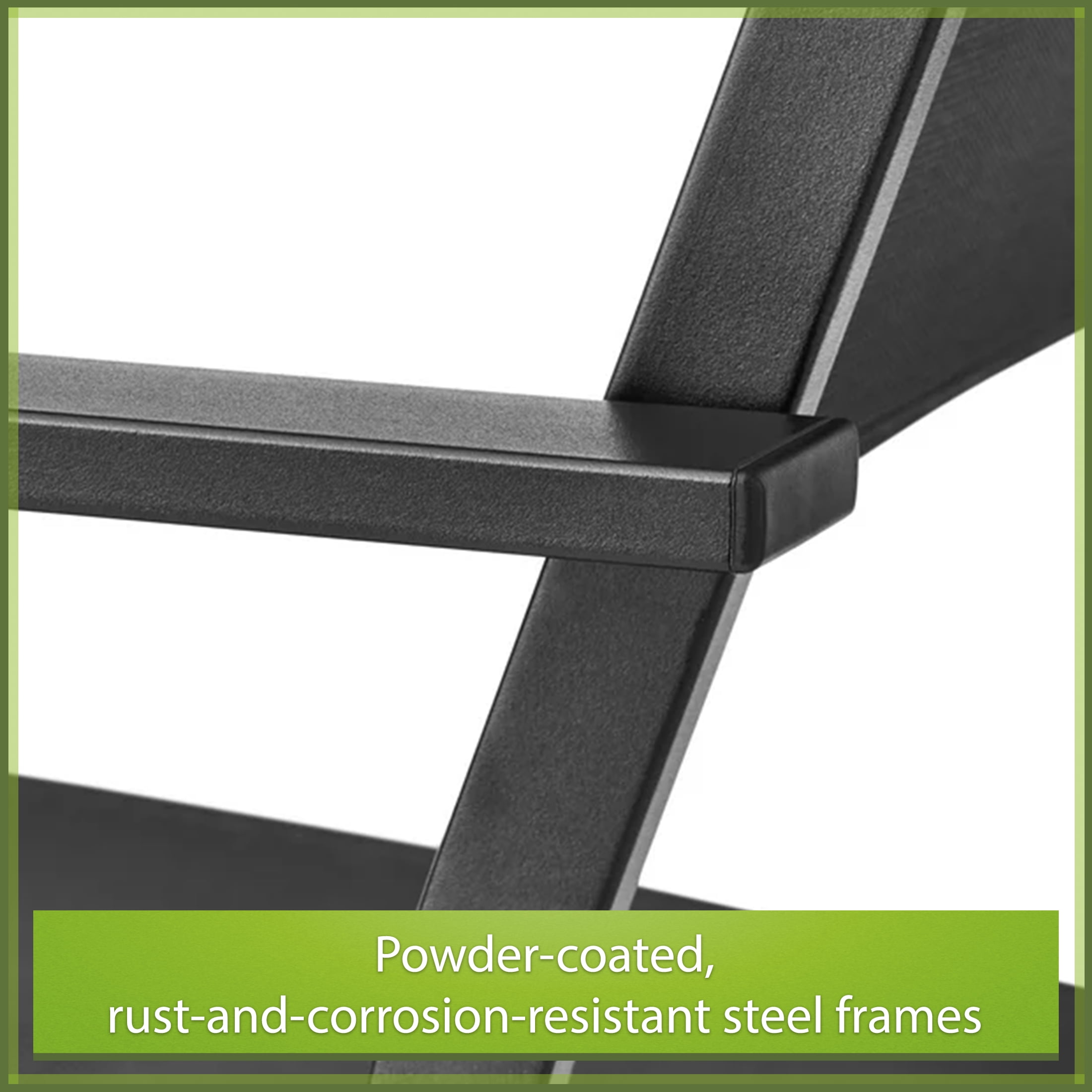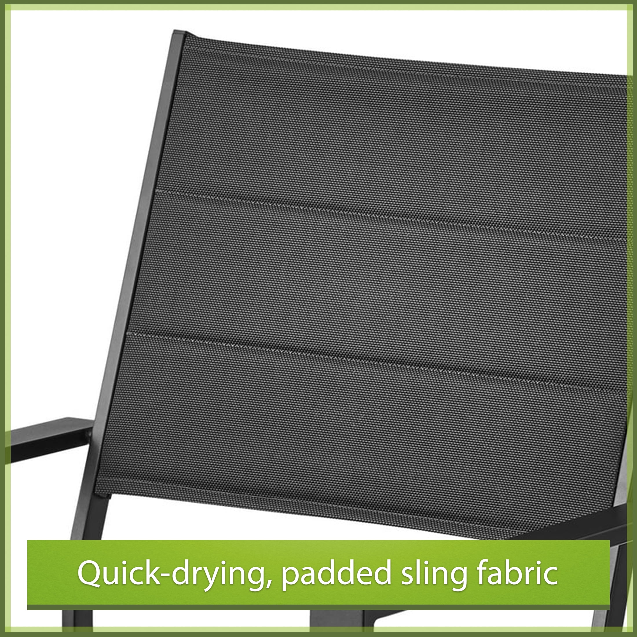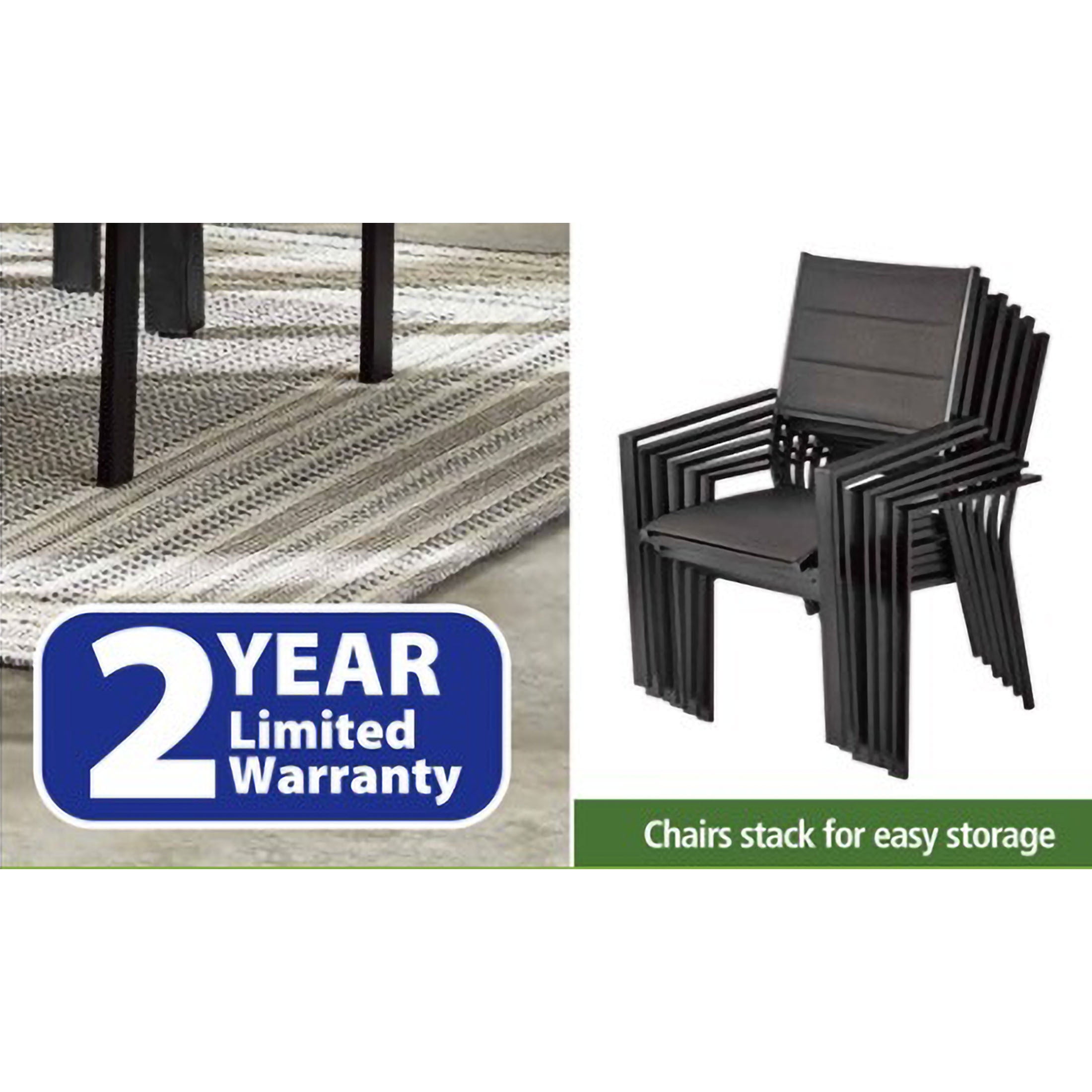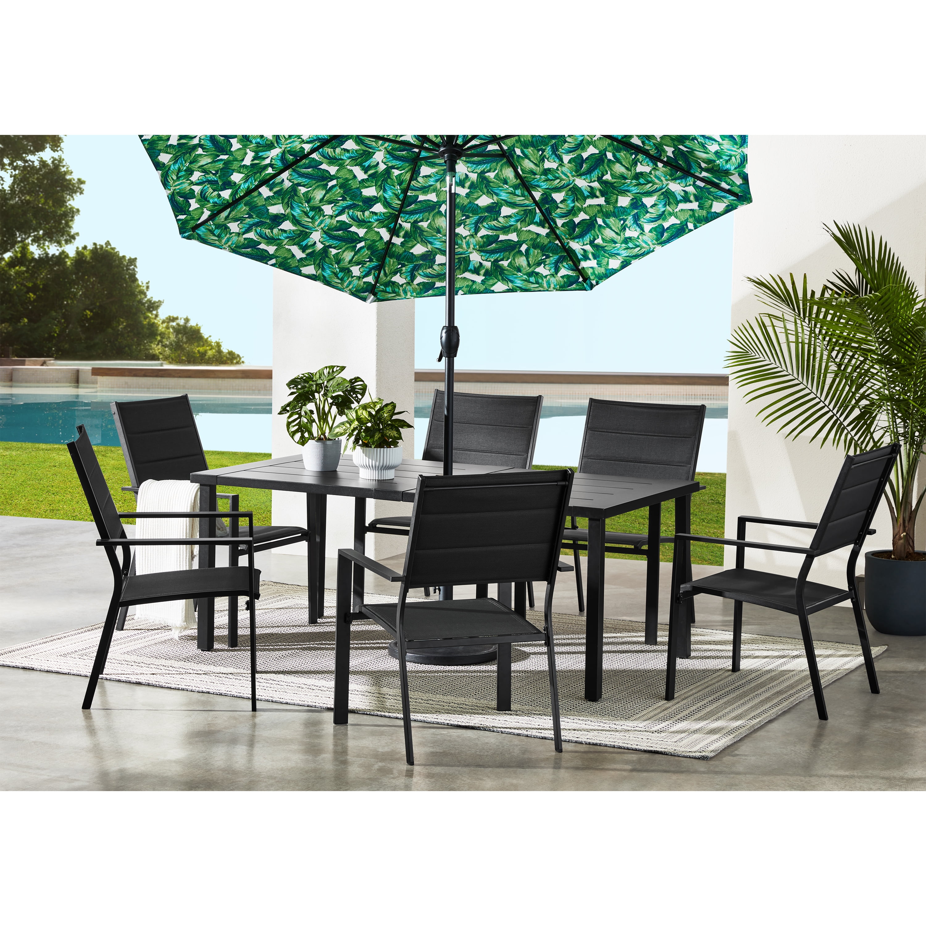 Mainstays Dashwood 7-Piece Outdoor Dining Set, Black Set includes 6 chairs and one metal slat top dining table with 1.5″ umbrella hole (umbrella not included) E-coated and powder-coated finish for rust-resistant durability Padded sling on chair back to extend wear and durability Stackable chairs for easy storage Assembly required Assembled product dimensions: Chair 26.97″ x 25.98″ x 37.99″; 15.56 lbs.; Dining table 70.08″ x 39.37″ x 28.54″ H; 70.75 lbs Dining chair weight capacity: 350 lbs Arrives in 1 box, shipping dimensions: 46.02″ x 42.13″ x 15.16″; 203 lbs Site to store pickup note: This item is packaged in 1 large box that may not fit into a standard-sized vehicle. Please make sure you have a large car or truck for store pickup.