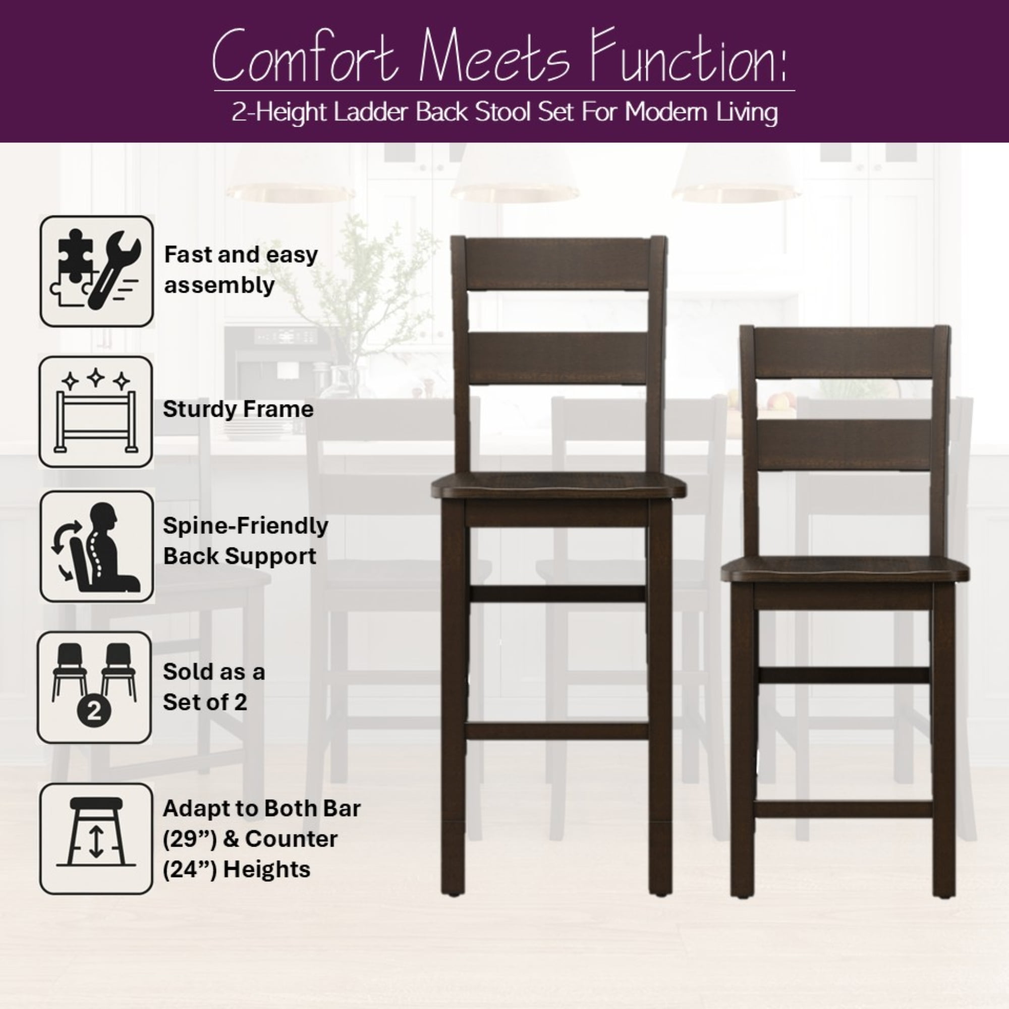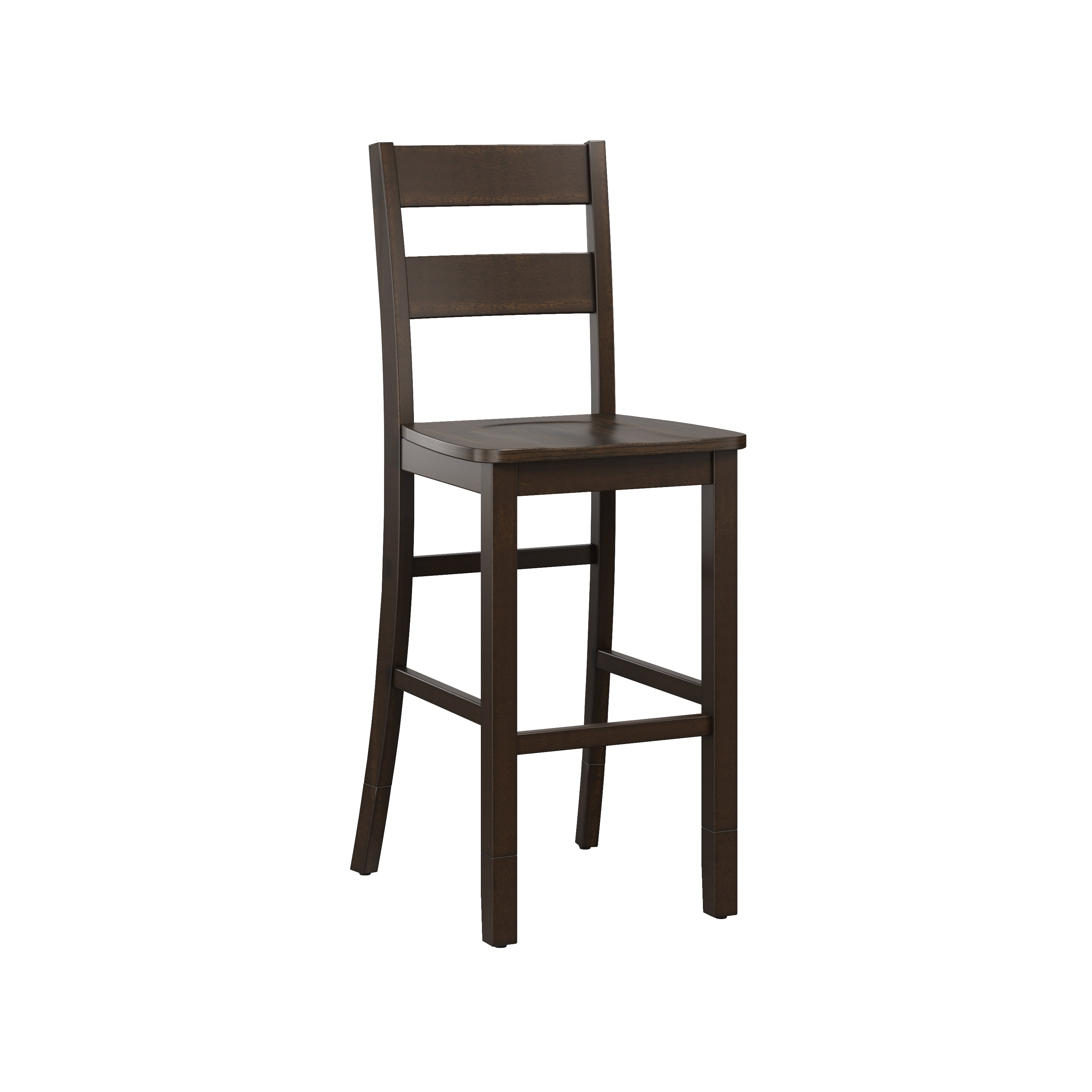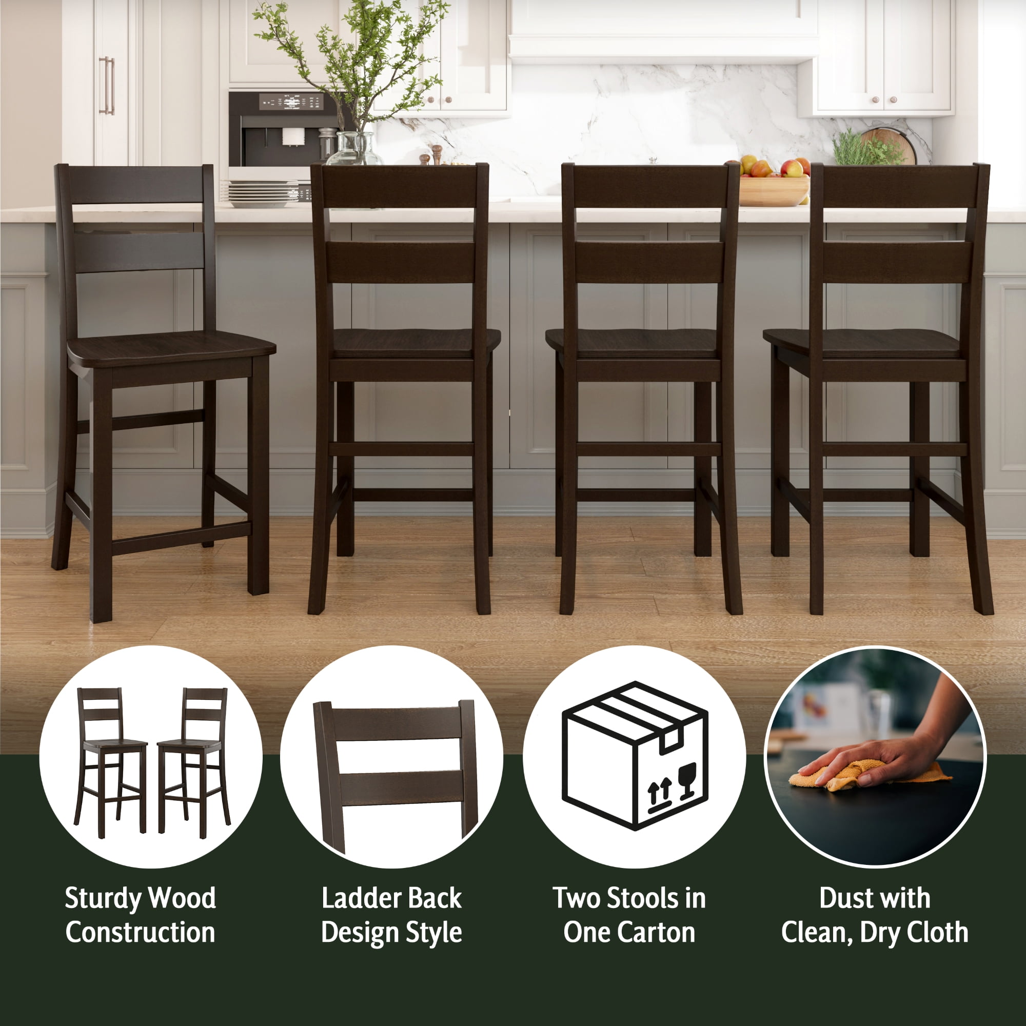 Introduce a blend of casual elegance and functional design to your bar, kitchen or dining space with these wood barstools. The utility of these adjustable stools allows you to easily switch between counter(24″) and bar(29″) height seating. Using wood leg extensions for height adjustment, transition these indoor barstools to create your dream dining or entertainment space. These barstools feature a high ladder back, smooth wood seat and footrest for support in a classic, versatile deep brown wood. Sold as a set of 2; assembly required.