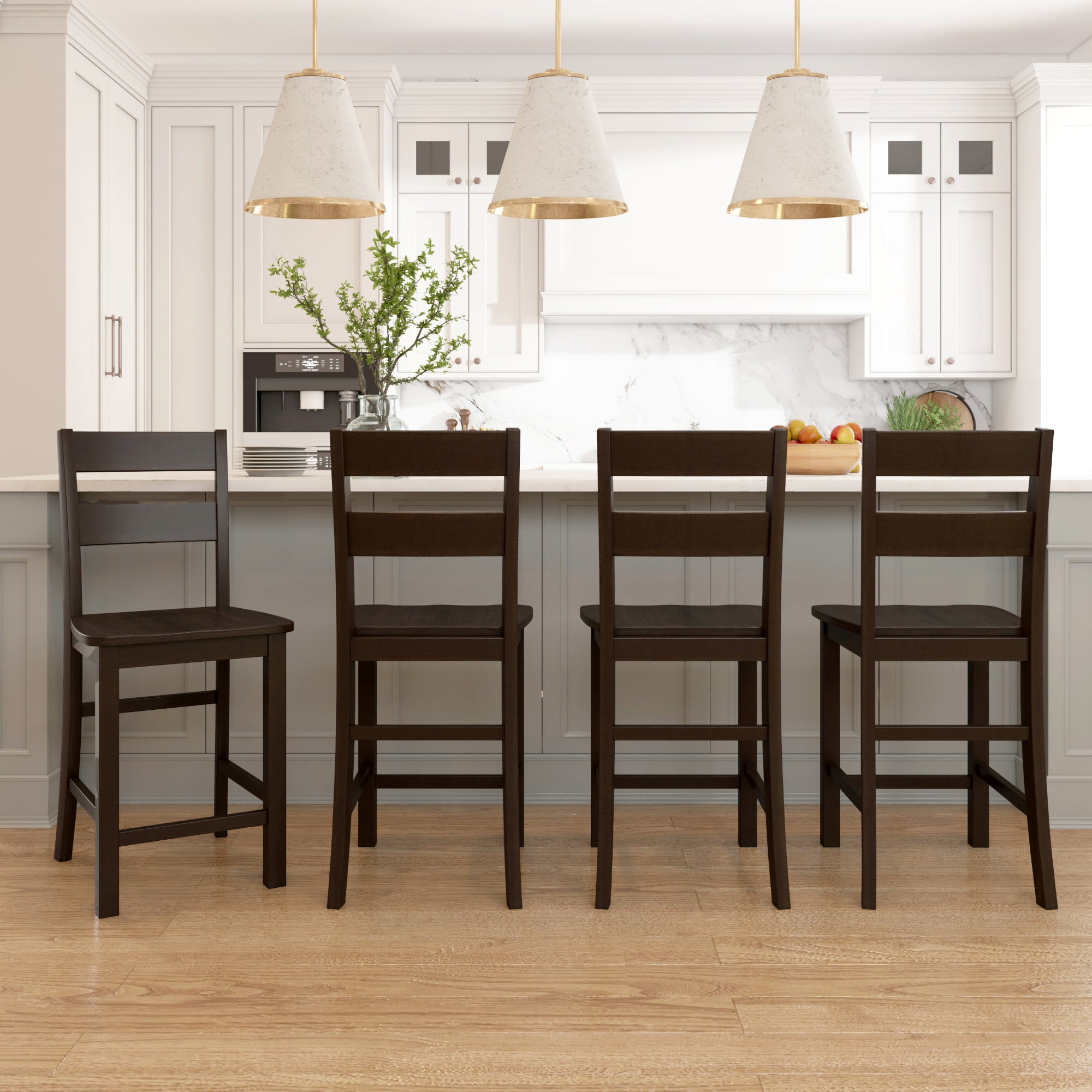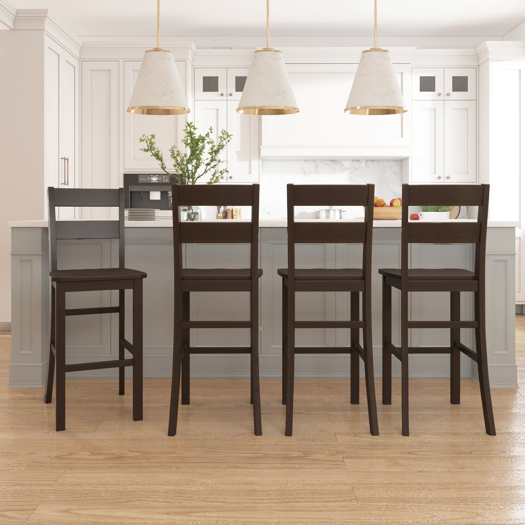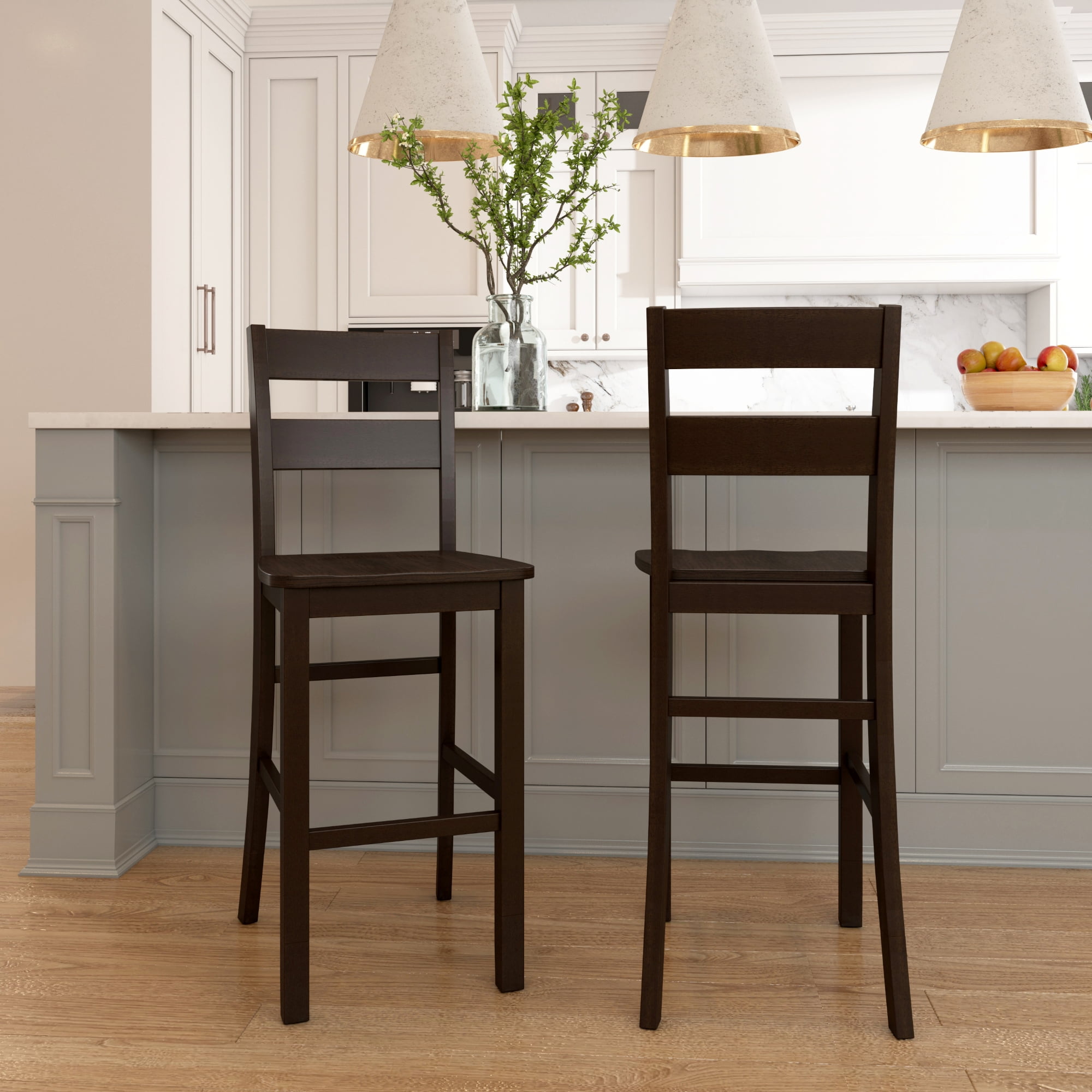 Introduce a blend of casual elegance and functional design to your bar, kitchen or dining space with these wood barstools. The utility of these adjustable stools allows you to easily switch between counter(24″) and bar(29″) height seating. Using wood leg extensions for height adjustment, transition these indoor barstools to create your dream dining or entertainment space. These barstools feature a high ladder back, smooth wood seat and footrest for support in a classic, versatile deep brown wood. Sold as a set of 2; assembly required.