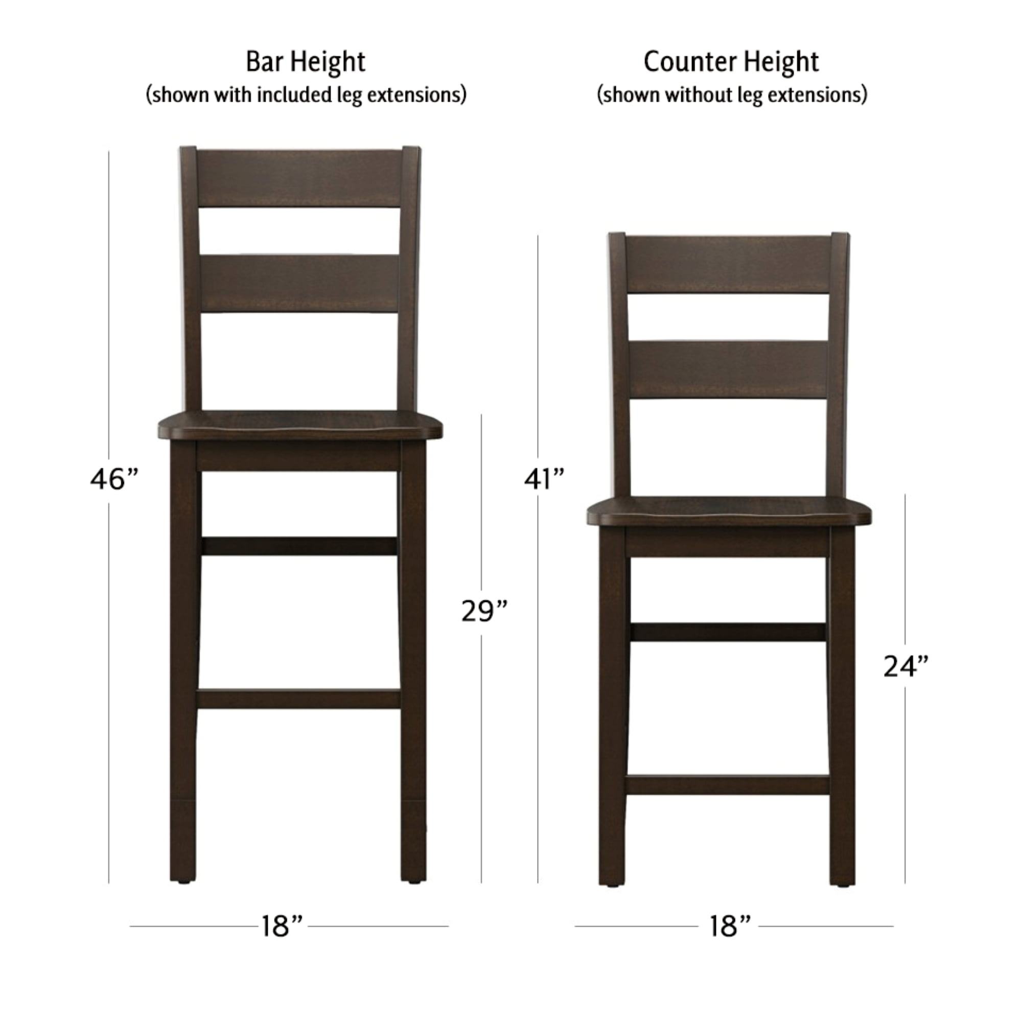 Set of 2 modern indoor wooden adjustable height barstools Wooden leg extensions allow you to easily transition from counter height to bar height and vice versa Bar Stool Configuration Dimensions: 18″W x 20″D x 46″H, 29″ Seat Height Counter Stool Configuration Dimensions: 18″W x 20″D x 41″H, 24″ Seat Height Simple ladder-back design for a clean-line silhouette Assembly required Ships two stools in one box Spot or wipe clean Recommended weight limit: 250lbs For residential use only
