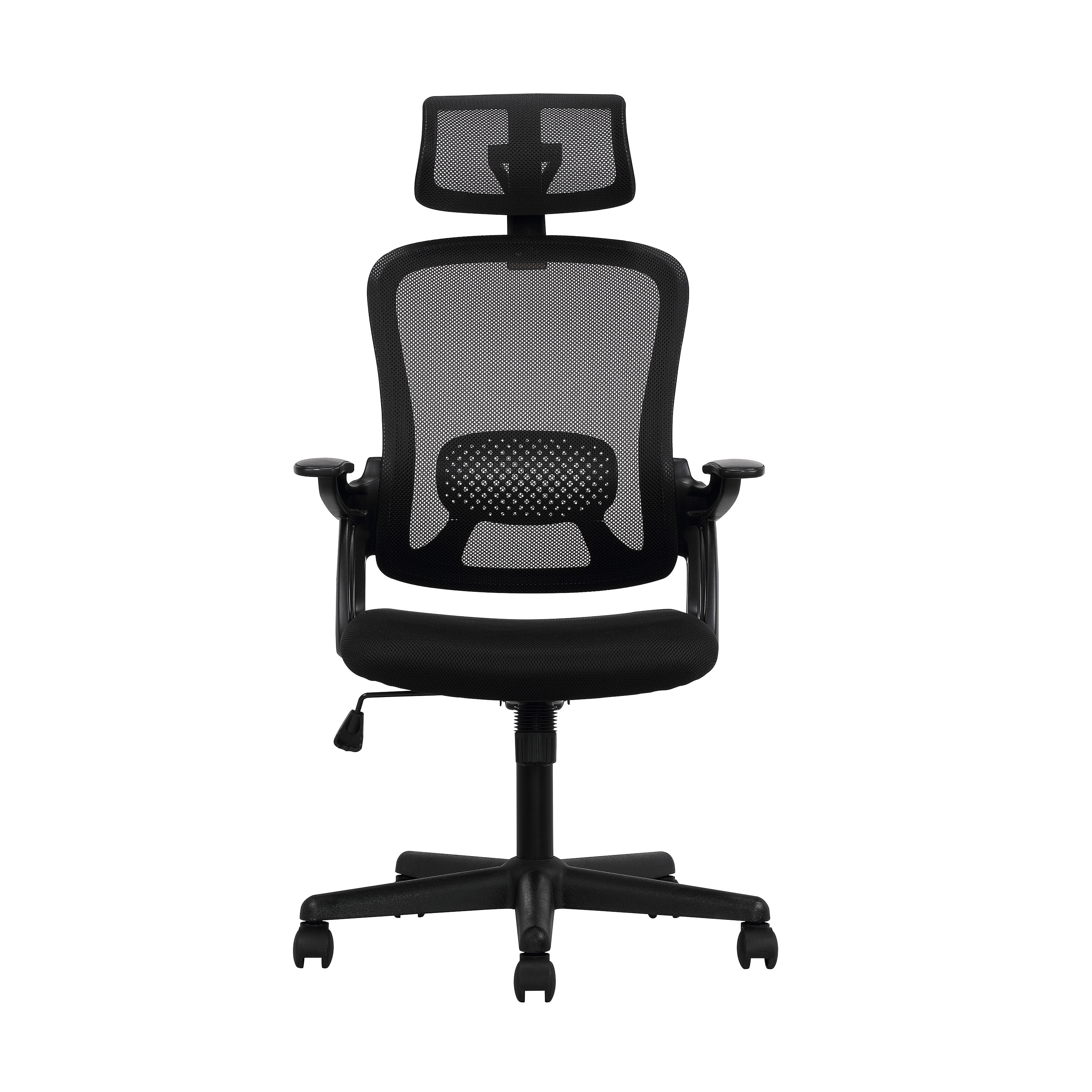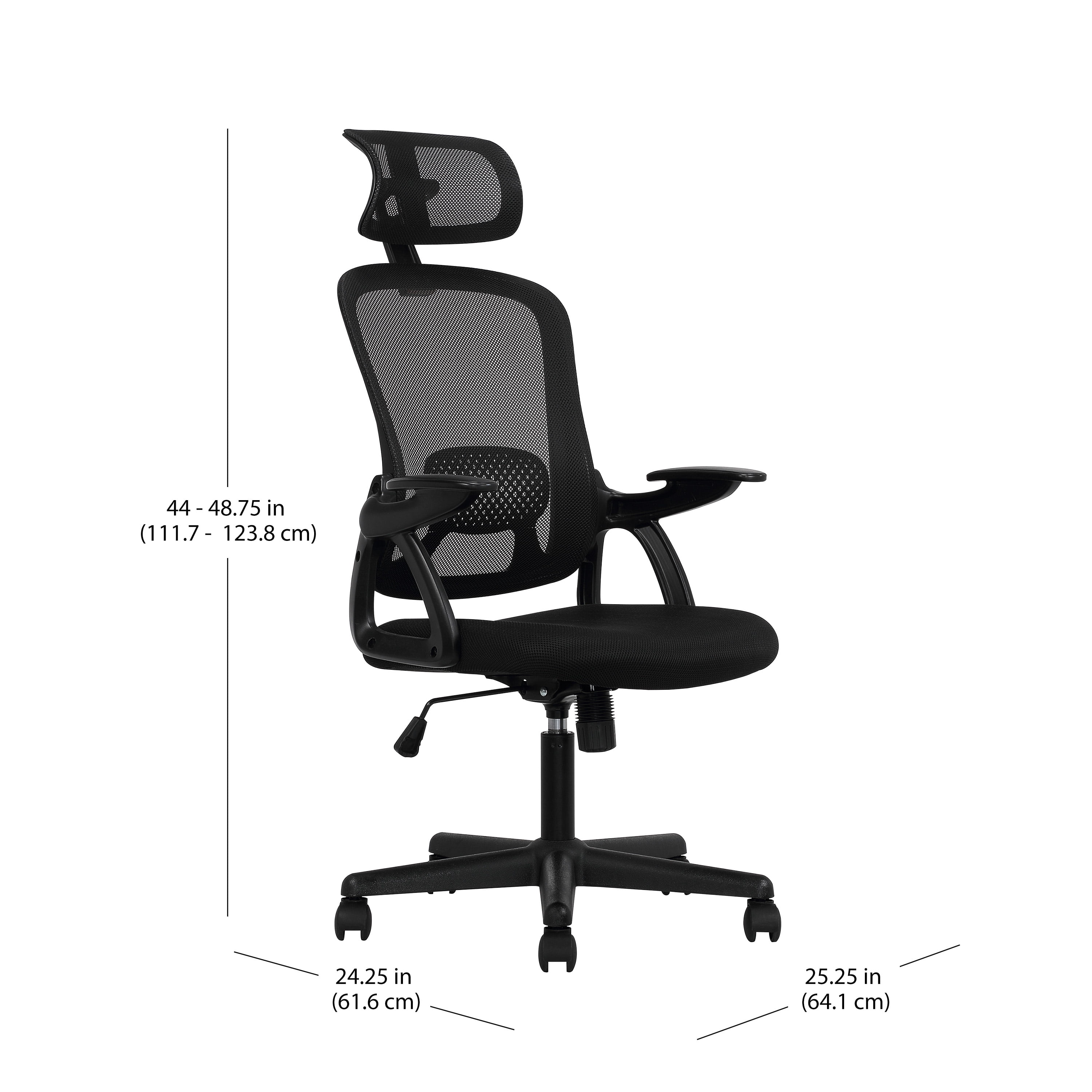 The Mainstays Ergonomic Office Chair is the perfect chair to get you through your workday. The chair back features a breathable mesh fabric and lower lumbar support panel. The nylon panel contours to your lower back providing a nice lower lumbar support and helping improve posture. The adjustable headrest is included for added neck and head support. The customizable height adjustment allows you to position the headrest to fit your needs and help relieve any shoulder or back tension. Nylon armrests are ergonomically positioned for additional arm support while you type or work. The seat is generously padded with high-density foam that contours to your body and creates a luxurious seating surface. Underneath the chair you will find the pneumatic gas-lift seat-height control and tension/tilt knob that help with customizing the chair to fit your needs. The durable nylon base is scuff proof and sits atop five dual caster wheels that allow you to move effortlessly around the room. The sleek black fabric and simple, classic look of this chair makes it a great fit in any workspace. Whether you are an adult who works from home, have a studio for working on your craft or you go into a commercial office space, the Mainstays Ergonomic Task Chair with Adjustable Headrest will fit nicely with any room decor and enhance the look of your workspace.