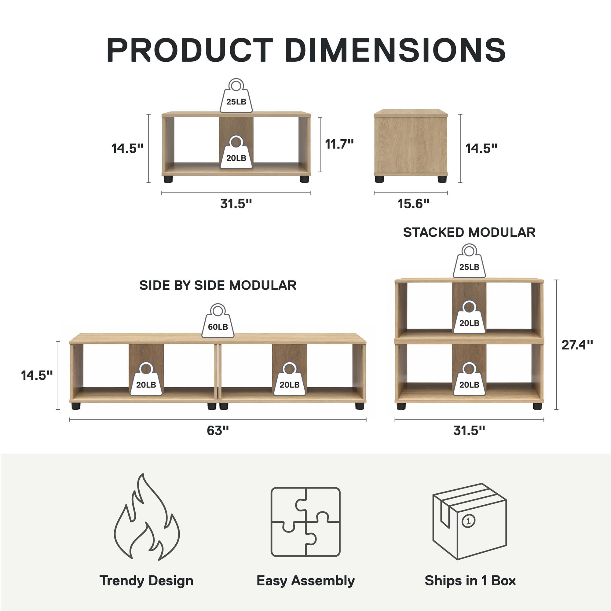 MODERN STYLE AND VERSATILITY: Modern and versatile, the Mainstays TV Console with neutral woodgrain finishes seamlessly blends into contemporary spaces AFFORDABLE AND ADAPTABLE: Constructed from engineered wood, the assembled unit can be used side-by-side or stacked to accommodate most flat screen TVs up to 70″ or up to 32″ ADAPT TO ANY EVENT: Versatile for movie nights, series binges; Flexible expandable design with stylish open storage organizes various entertainment setups easily SPECS AND ASSEMBLY: Ships flat in one box; Requires two adults for assembly. Assembled side-by-side: 63″ W x 15.55″ D x 14.59″ H; Assembled stacked: 31.5″ W x 15.55″ D x 27.58″ H; Weight: 43 lbs. 1-YEAR LIMITED WARRANTY INCLUDED: US and Canadian call centers offer assistance for parts, assembly, and warranty queries