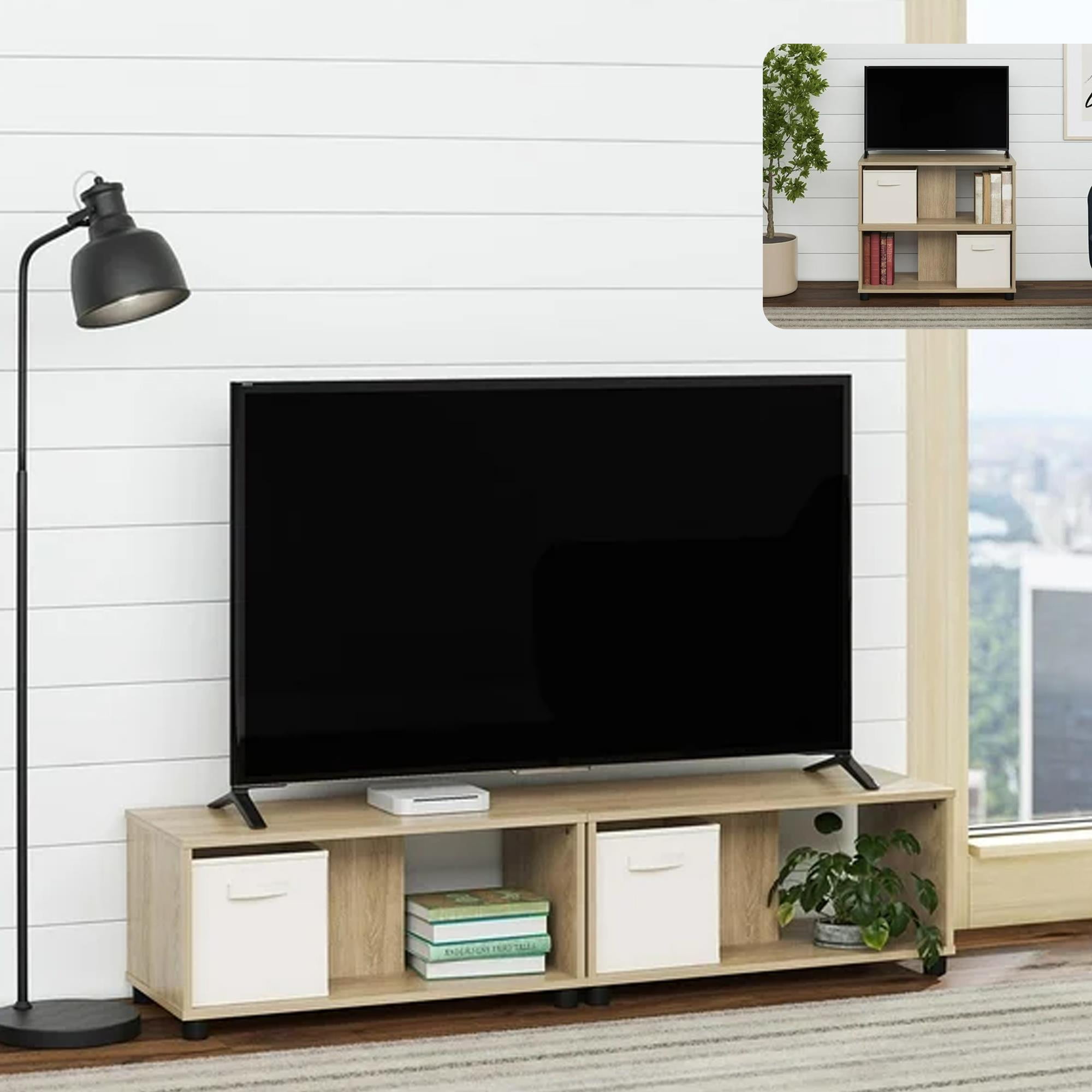 Take entertainment to the next level with the Mainstays Expandable Side-by-Side or Stacking TV Stand – the epitome of modern style and versatility for your living room. Available in several neutral woodgrain finishes, this minimalistic unit seamlessly blends into any contemporary space. Crafted from durable engineered wood, the TV Console is designed to hold TVs up to 70 inches, making it the perfect centerpiece for your entertainment needs. Want more flexibility? Use it side by side to accommodate larger TVs or stack the two sections to create a stylish setup with handy open storage for TVs up to 32 inches. Whether you’re hosting a movie night or binge-watching your favorite series, this console adapts to your needs. Finished on all sides, the Mainstays Expandable Side by Side or Stacking TV Stand is not only a functional organizer but also a chic modern addition to your living space.
