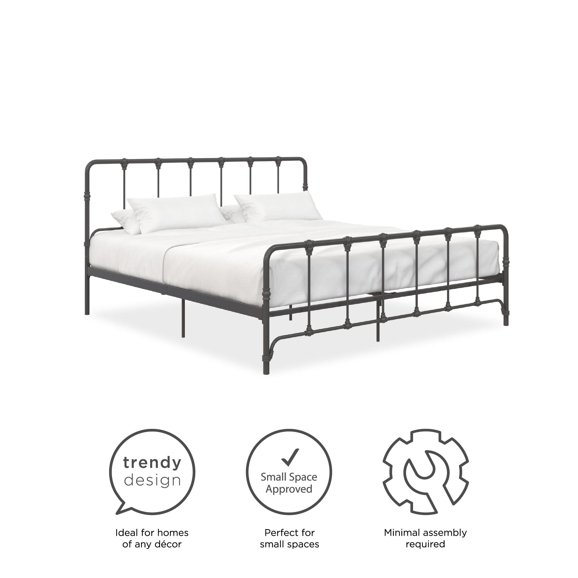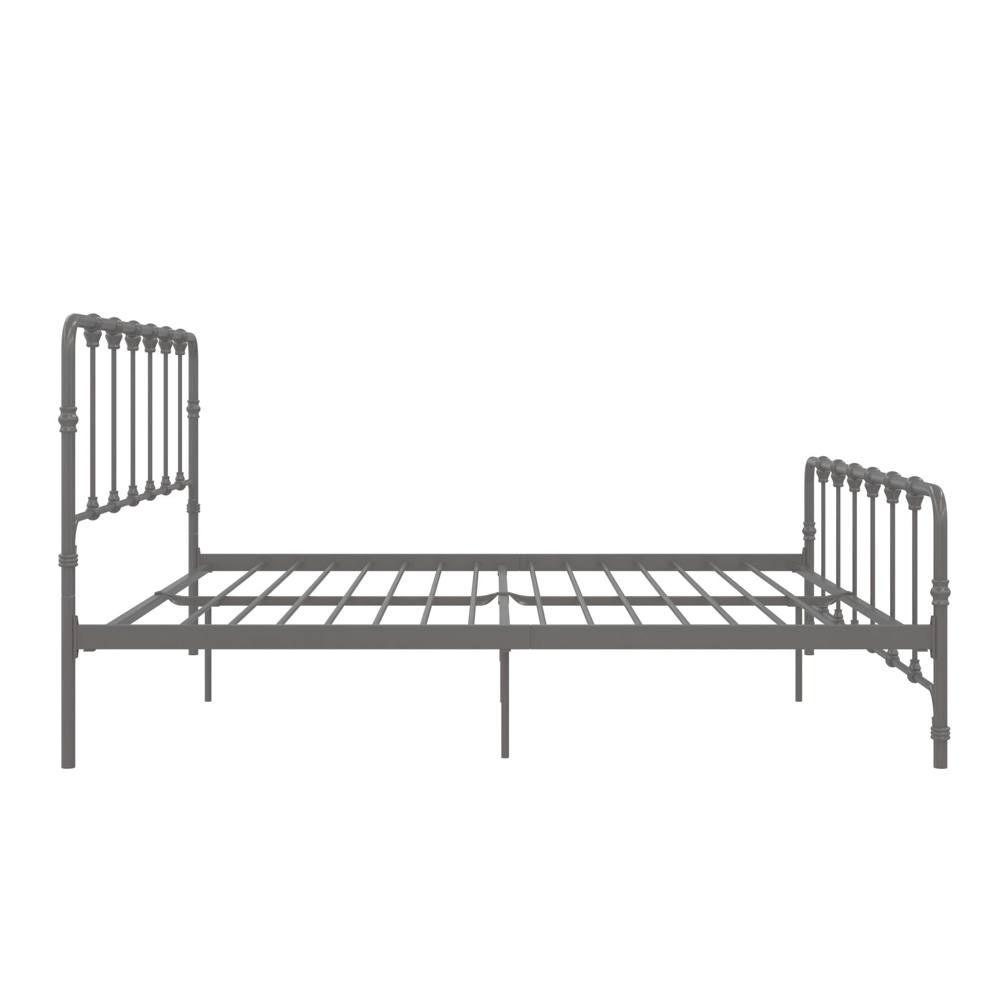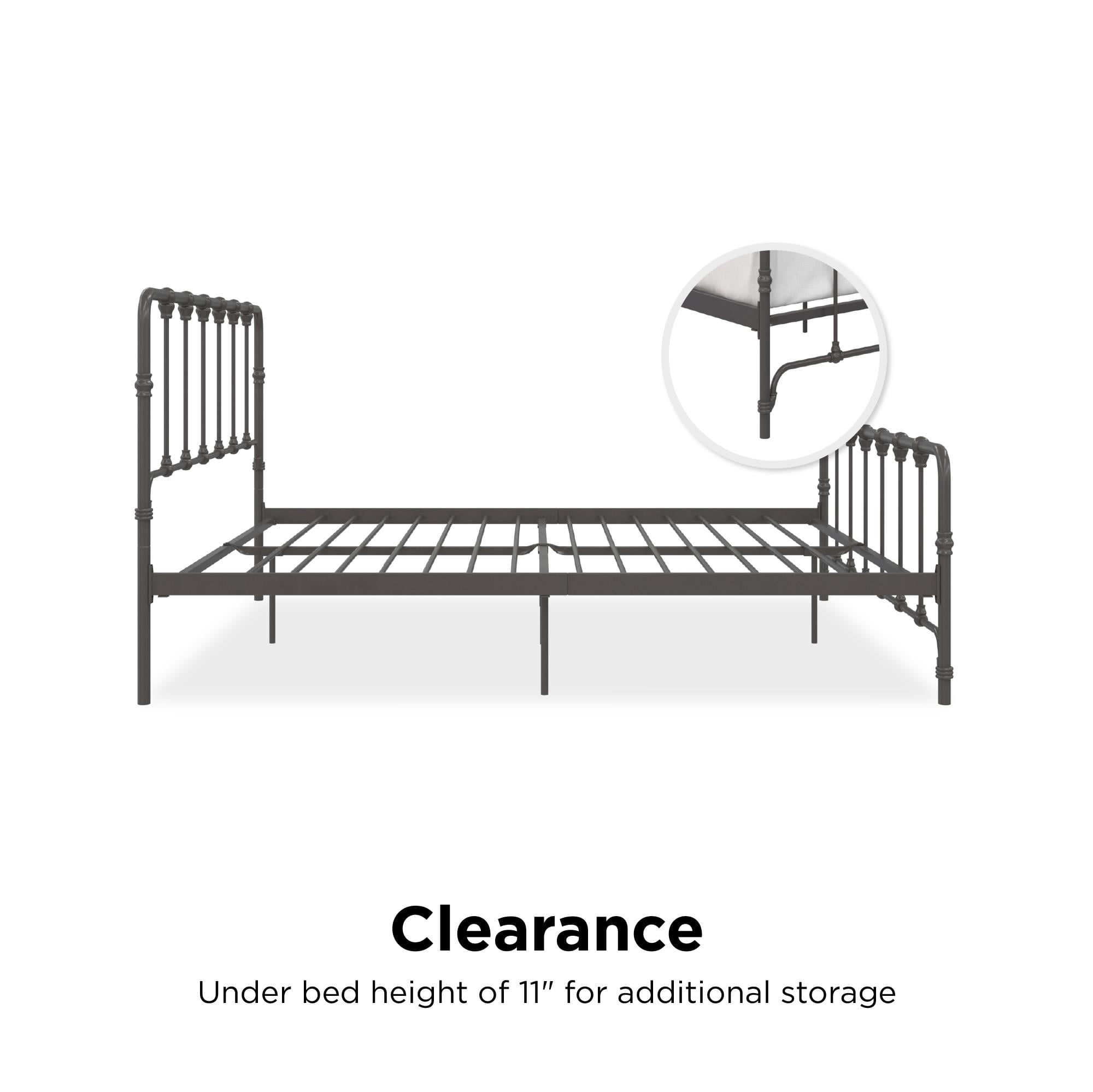 With the Mainstays Farmhouse Metal Bed you get a little bit of everything in one trendy package. The curved metal frame is reminiscent of a modern industrial style, while the details in the headboard and footboard bring a touch of vintage design. This combination makes it the perfect bed frame to fit seamlessly in any bedroom decor. Thanks to its versatile design, this bed can complement any room, from a child’s bedroom to a guest bedroom and even your master bedroom. Built with a strong metal frame that includes extra center legs and center metal slats, this Farmhouse bed will stay in your home for many years. With an 11-inch under-bed clearance, it is the ideal solution for small space living. Available in a variety of colors and sizes, the Mainstays Farmhouse Metal Bed is the bed frame you have been looking for. No additional box spring or foundation is required. Mattress sold separately.