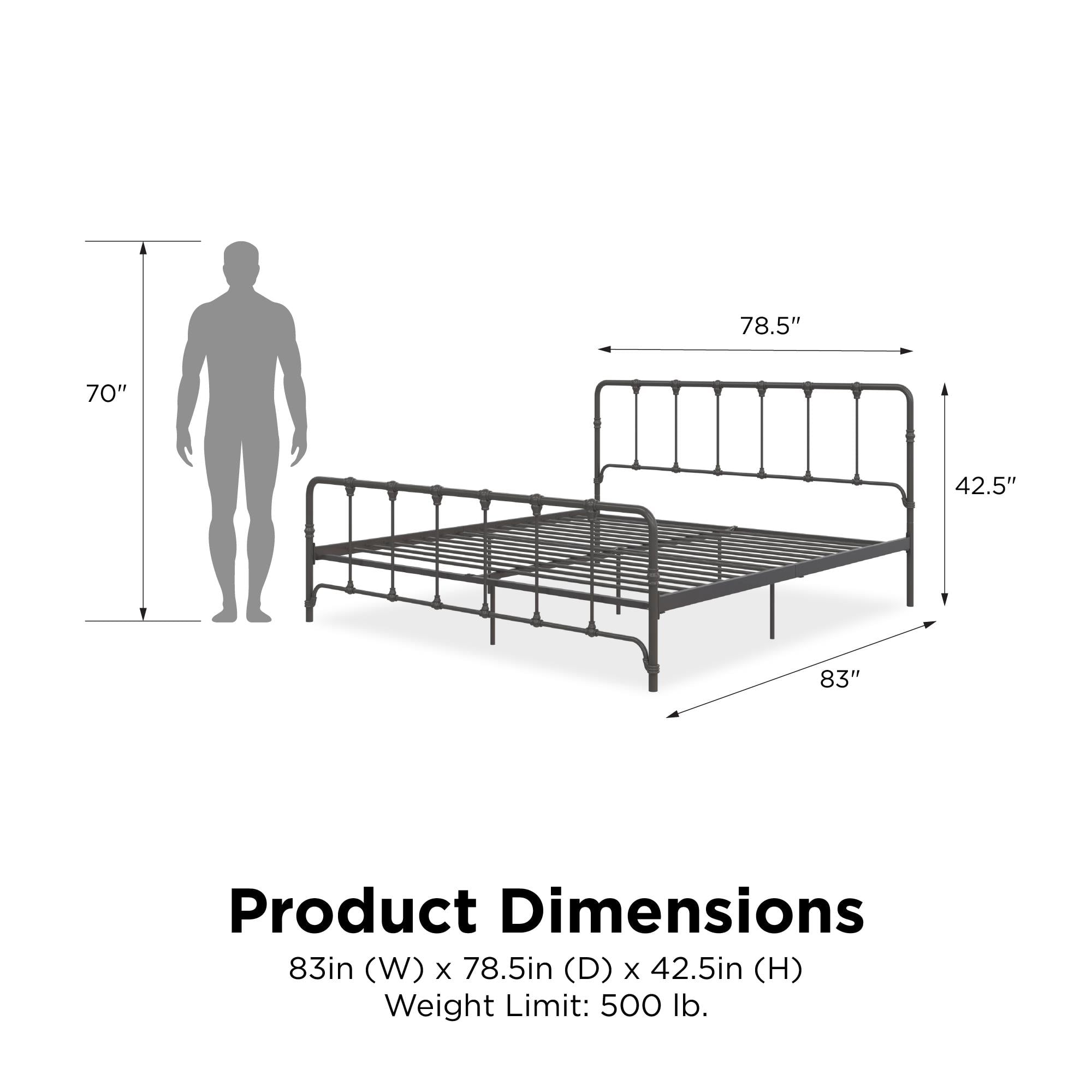 Vintage design with a modern flair that can blend perfectly into any bedroom decor. Built in a strong metal frame that includes extra center legs and secured metal slats. No additional box spring or foundation required. Ideal for small space – 11-inch clearance to allow for under-bed storage. Ships in one easy-to-handle box. Quick and easy assembly required. Available in multiple colors and sizes. Product dimensions: 83″L x 78.5″W x 42.5″H. Weight limit: 500 lbs. Net weight: 57 lbs. Shipping dimensions: 82″L x 36″W x 4″H. Gross weight: 76 lbs.