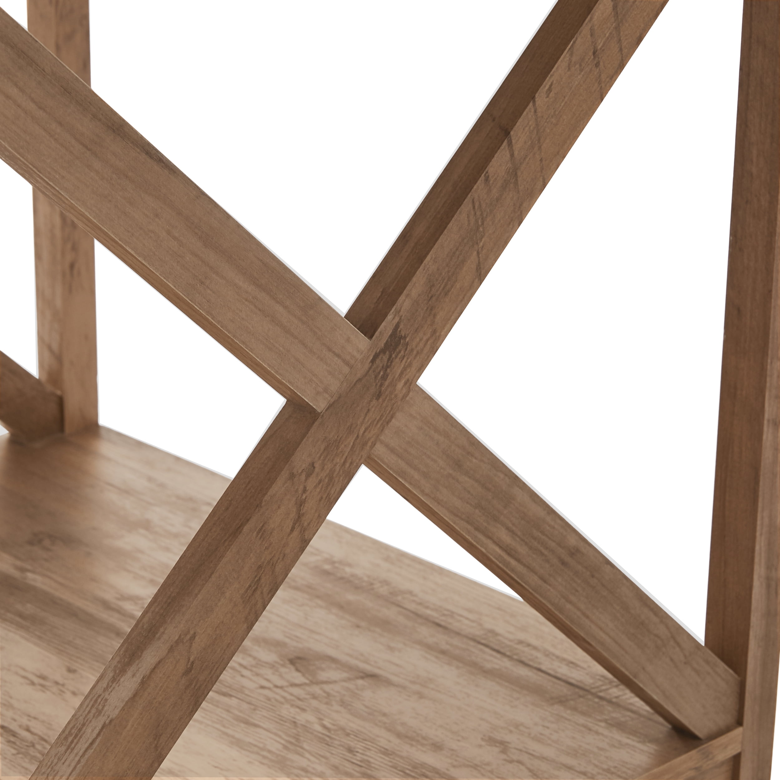 With a simple, rustic-inspired design, the Mainstays Farmhouse Side Table brings style and function to your living room, den or office. The top surface of this sturdy end table has a natural wood look that can support up to 66 pounds and a bottom shelf for additional storage and display options. The X-brace design on each end adds stability and creates a cozy, country atmosphere. Complete the look with other pieces from the collection including the Mainstays Farmhouse Coffee Table and TV Stand for TVs up to 50″ (sold separately).