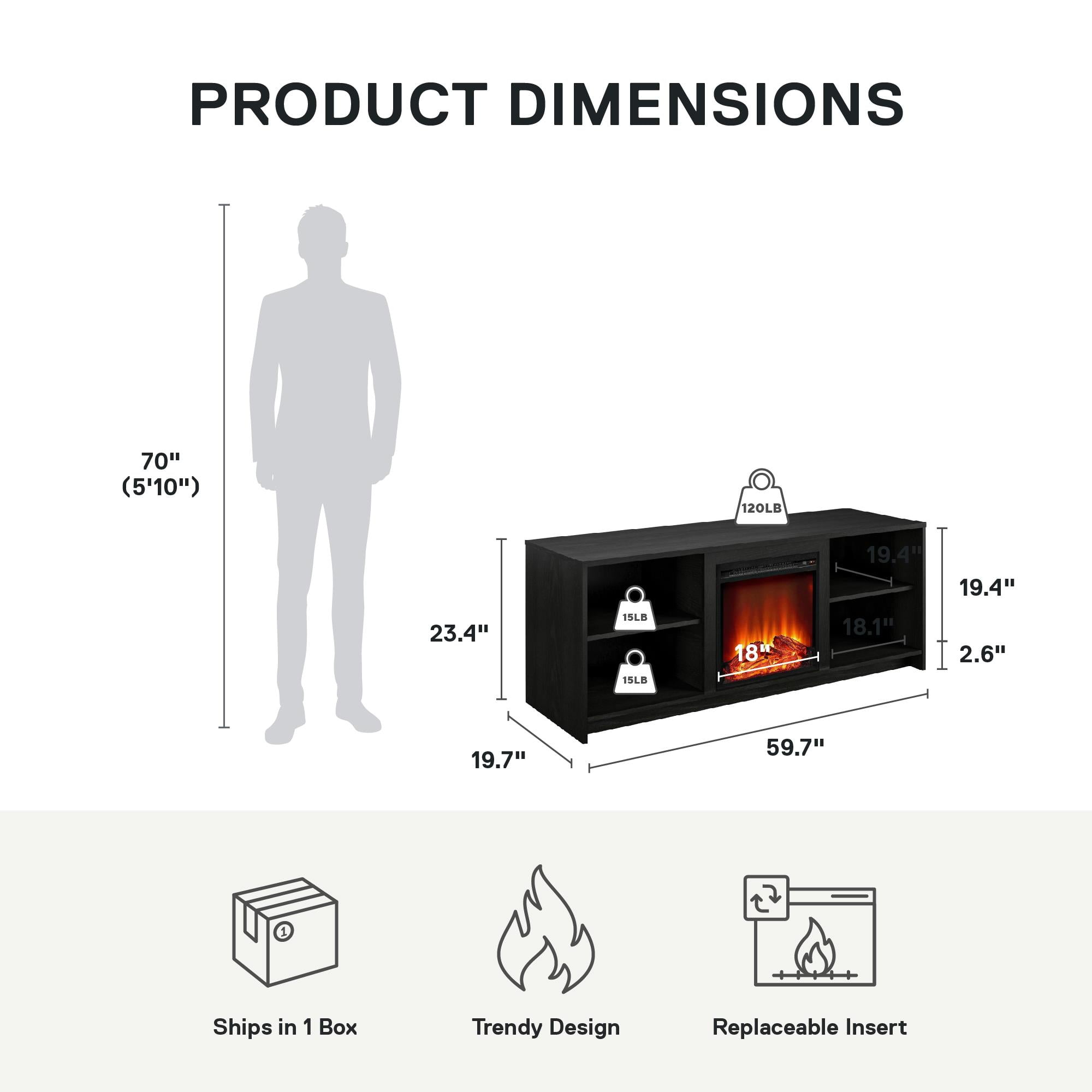 Get the warm and relaxing ambiance of a crackling fireplace minus the maintenance with the Mainstays Courtland Electric Fireplace TV Stand. This TV stand with fireplace can accommodate most TVs up to 65″ wide or up to 120 lbs. The neutral finish on the laminated engineered wood will coordinate seamlessly with your existing decor. The 18″ electric fireplace heater insert can heat a room up to 400 sq. ft. and plugs into a standard 120V outlet. The flame effect can be used with or without heat so you can enjoy the fireplace all year long. A cool-touch tempered glass front guarantees safety for both children and pets. On each side of the fireplace insert are two shelves, one adjustable so you can organize your media components and video game consoles. The wire management makes it easy to plug in your devices and keeps cords tangle-free. The TV Stand ships flat to your door in one box and requires assembly by two adults upon opening. Parts are conveniently labeled for easy assembly. Assembled dimensions: 59.69″ W x 19.69″ D x 23.43″ H.