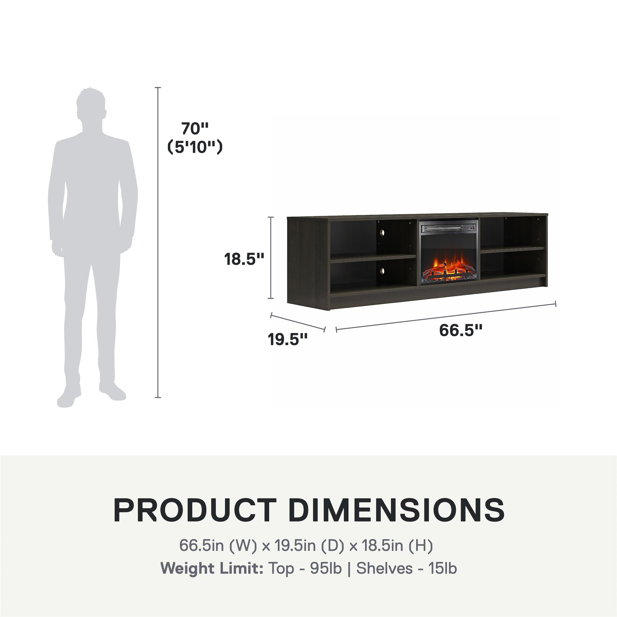 MODERN ENTERTAINMENT UPGRADE: Upgrade with the Mainstays Electric Fireplace TV Stand for a modern and affordable home entertainment boost VERSATILE TV SUPPORT: Constructed from engineered wood; Supports most 75″ flat-screen TVs (95 lbs.), ample storage with 4 shelves (2 adjustable), and wire management NATURAL AMBIANCE ADDITION: Built-in electric fireplace with realistic LED flames, grate, log set, and tempered glass for cozy, modern charm EFFICIENT HEATING SOLUTION: Heats 400 sq ft; Flame without heat option; Front on/off switch; No remote SHIPPING & DIMENSIONS: Ships in one box; TV Stand requires assembly, firebox is fully assembled; Dimensions: 66.85″ W x 19.57″ D x 18.58″ H. Assembled weight: 92 lbs. WARRANTY: 1-Year Limited Warranty Included