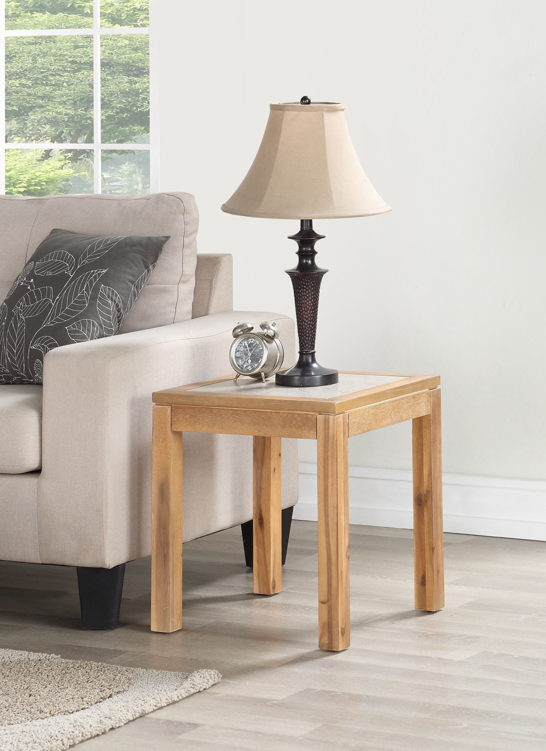 The Mainstays Glenmore Faux Concrete Top End Table adds a great modern yet rustic atmosphere to your living area. It features a light wood finish with a gray faux concrete top with hollow core construction that is lightweight but durable. The contemporary design will bring a homey touch to any decor, from modern to traditional farmhouse style. Sturdy and lightweight for easy moving, this end table is ideal for placement in your living room, office or entertainment area. The spacious surface accommodates lamps, plants, books, beverages and more. The Mainstays Glenmore Faux Concrete Top End Table is sure to be a stylish addition to any living space. Table Dimensions: 17″ W x 17″ D x 19″ H, 15 lbs.