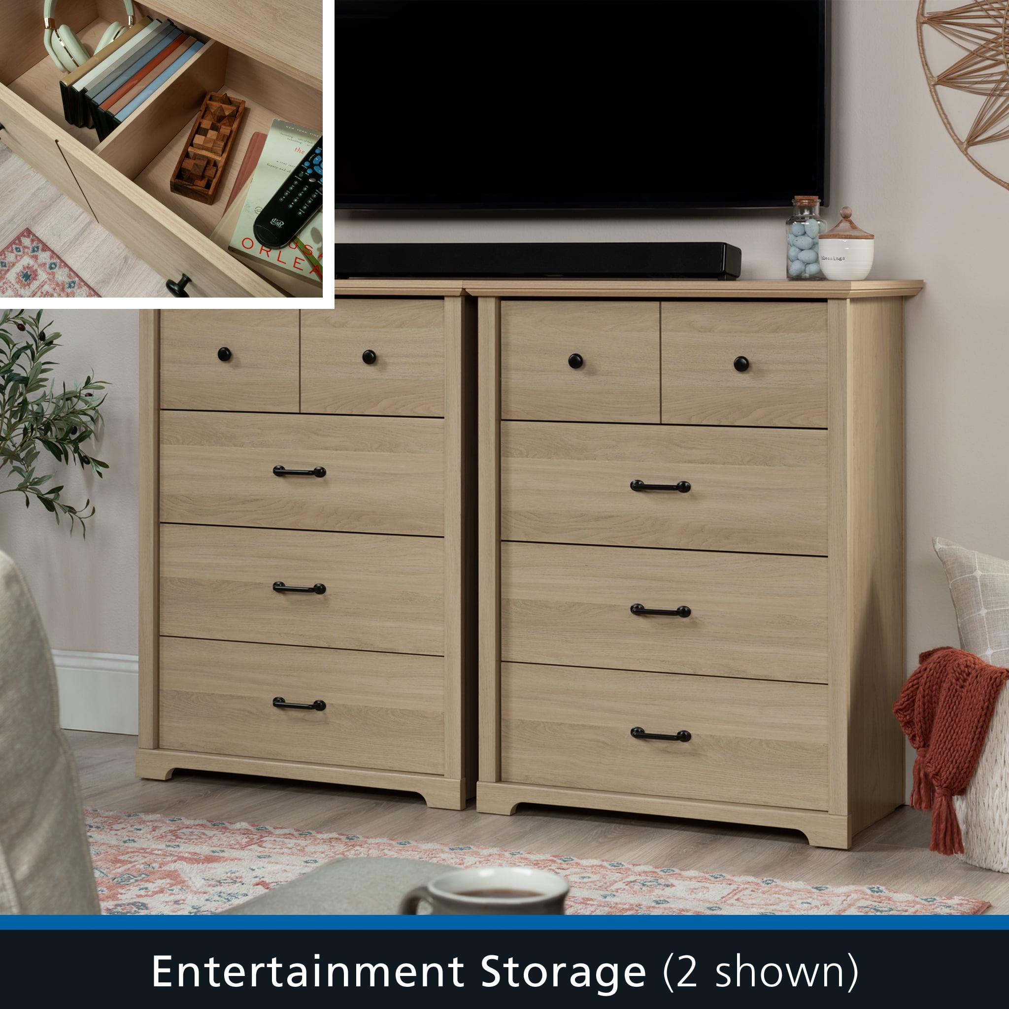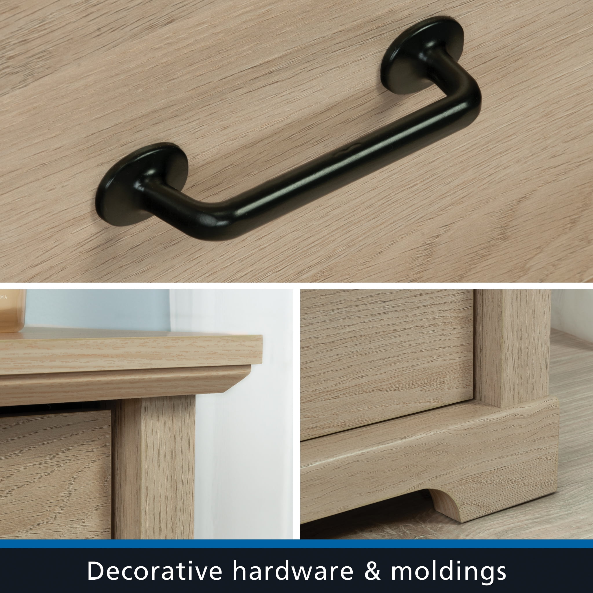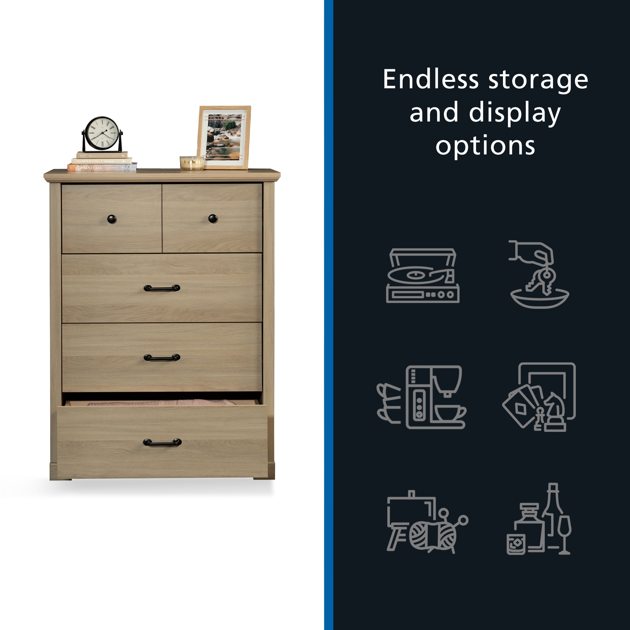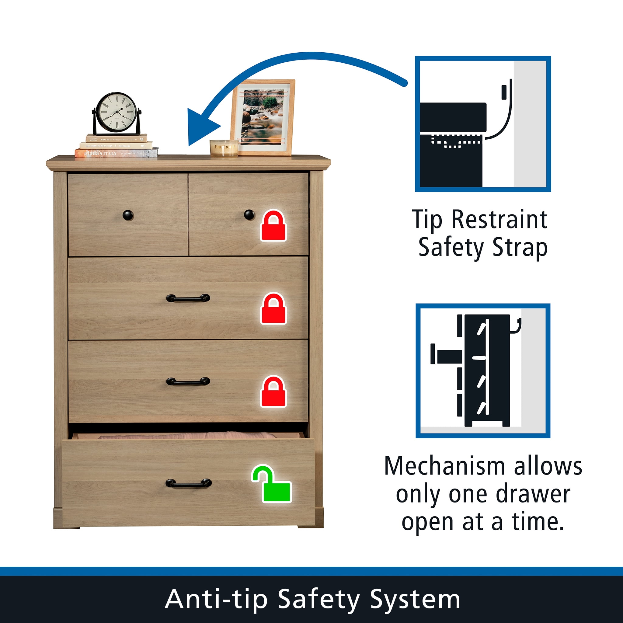 Elevate bedroom fashion without skimping on organization with the Mainstays® 4-drawer chest from the Harrington collection. Blending transitional style with practical functionality, this bedroom chest of drawers features clean, modern lines that offer a timeless appeal. Crafted with four spacious drawers, this dresser with drawers provides ample storage for all the wardrobe essentials. Each drawer glides smoothly on metal runners and includes safety stops for reliable, hassle-free access. The top drawer is thoughtfully designed with a built-in divider, perfect for keeping smaller items neatly organized. The round, contrasting black drawer pulls add a touch of visual sophistication. Safety is a priority with the integrated interlocking mechanism that allows only one drawer to open at a time, reducing the risk of accidental tipping. This item is suitable for various age groups. Finished in a versatile Washed Oak, this 4-drawer dresser complements any décor, seamlessly blending into traditional or modern spaces.
