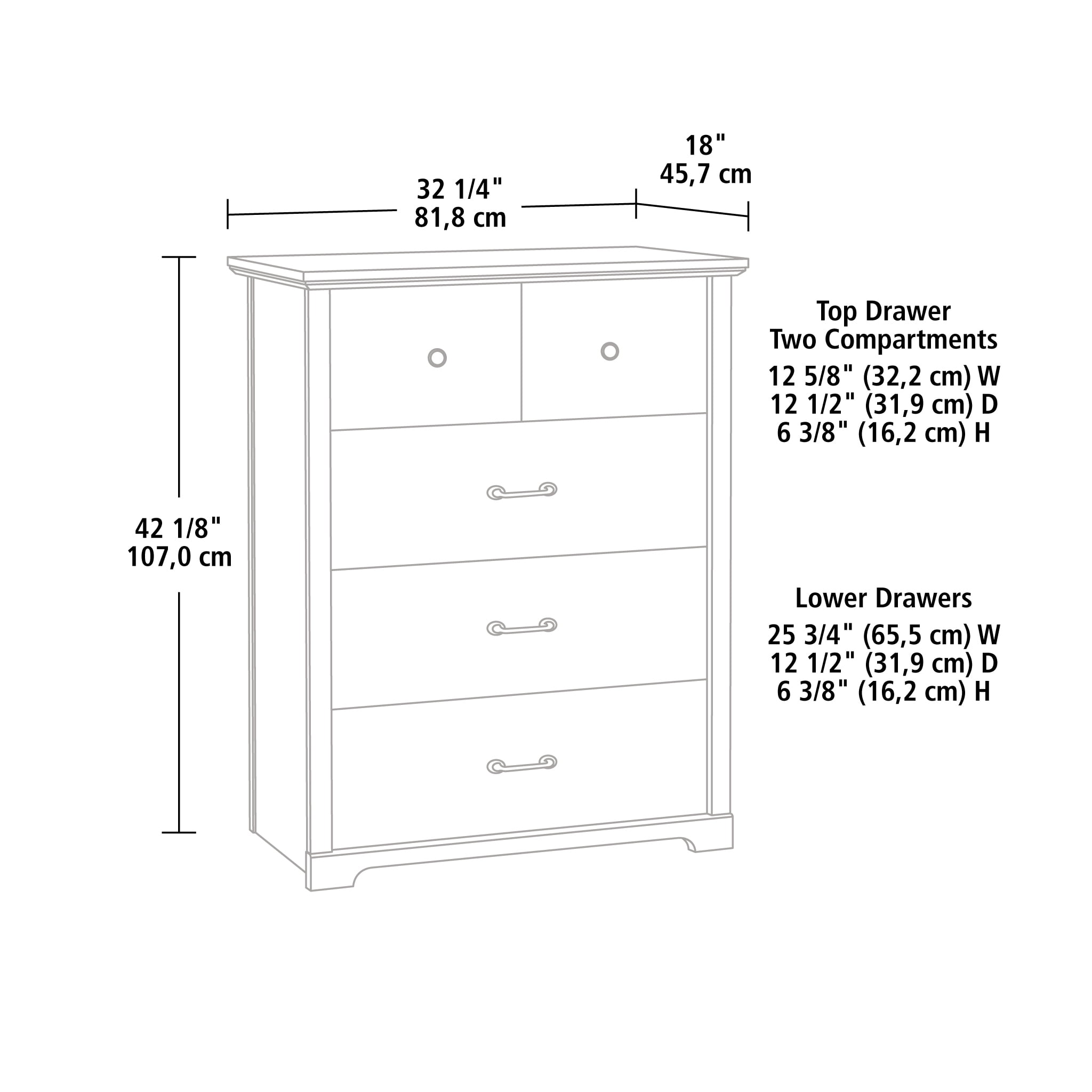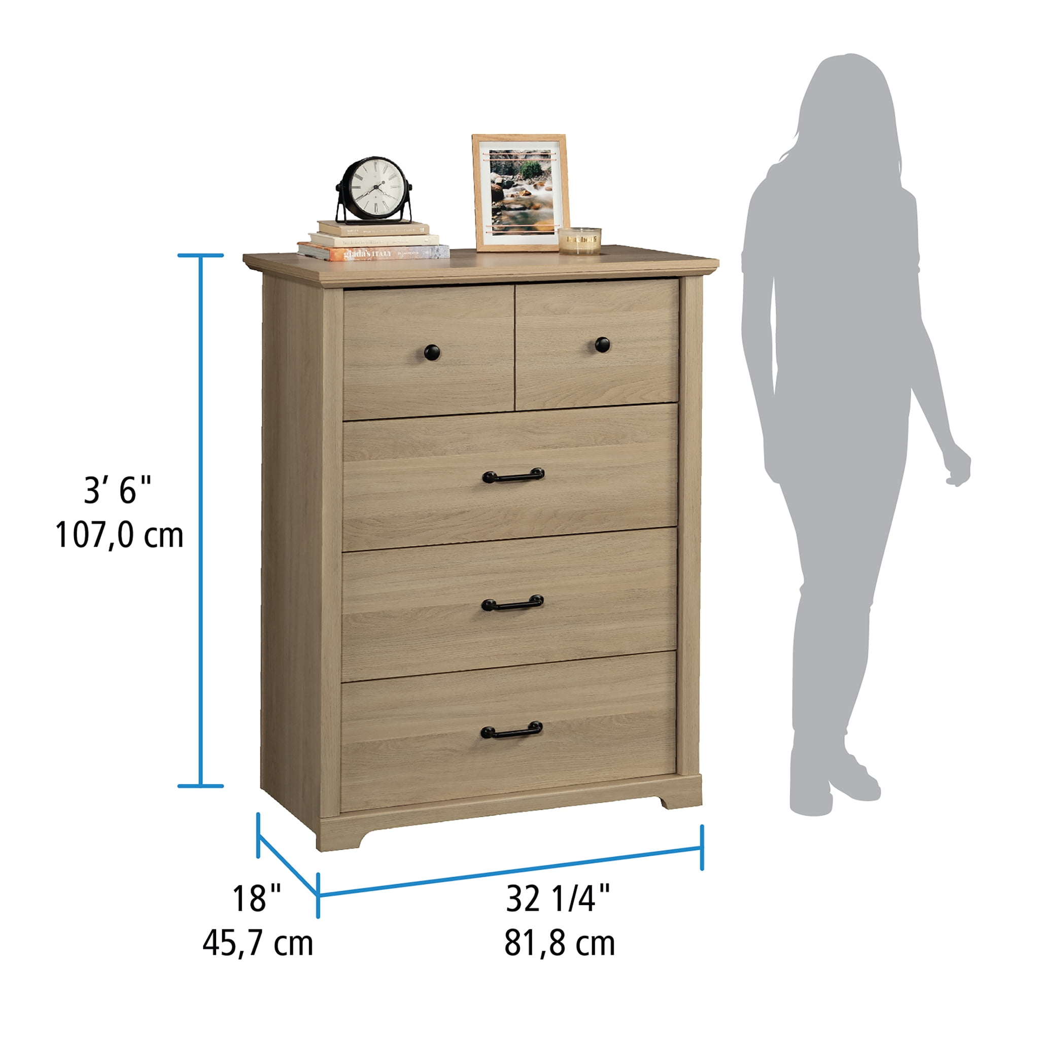 Assembled Dimensions: L: 32.21″ x W: 18.03″ x H: 42.13″ Four spacious drawers feature metal runners and safety stops Drawer divider in top drawer provides built-in organization An interlocking safety mechanism allows only one drawer open at a time Washed Oak finish This item is suitable for various age groups. Assembly required Model #: 437275 Box Dimensions: L: 46.77″ x W: 20.67″ x H: 8.78″ For additional questions or any issues, please contact the manufacturer at 1-800-523-3987. Be sure to check out the Mainstays Harrington collection for more great items!