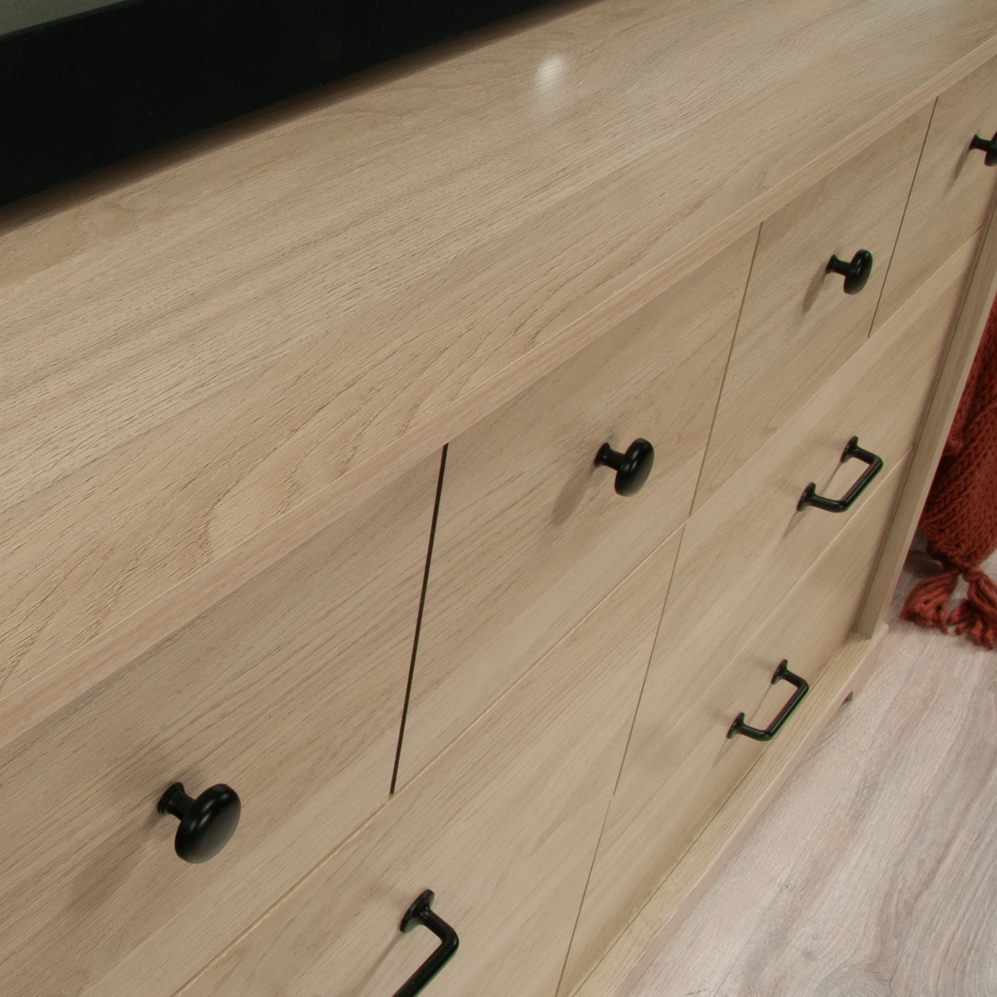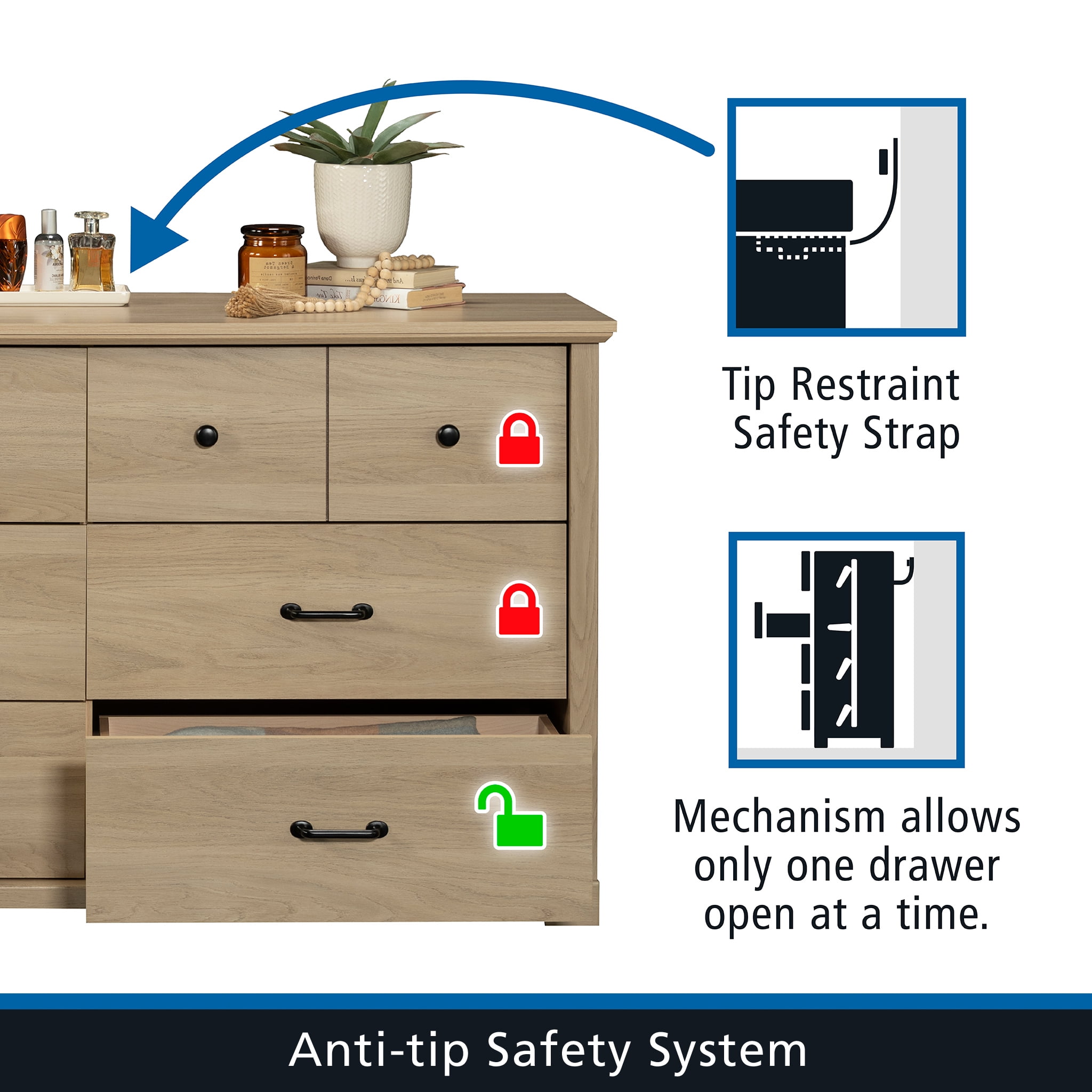Timeless style meets practical functionality with the enduring charm of the Mainstays® Harrington 6-drawer dresser. Featuring a neutral Washed Oak finish paired with sleek, black hardware, this double dresser will easily adapt to evolving design aesthetics while maintaining its classic appeal. This traditional framed bedroom dresser offers six spacious drawers, providing ample storage for a variety of wardrobe essentials. Each drawer is equipped with metal runners and safety stops, ensuring smooth and reliable operation. The top drawer includes built-in dividers for enhanced organization, while the rounded, contrasting drawer pulls add a touch of visual sophistication. Designed with safety in mind, this dresser with drawers features an interlocking mechanism that allows only one drawer to open at a time on each side, reducing the risk of accidental tipping. This item is suitable for various age groups.