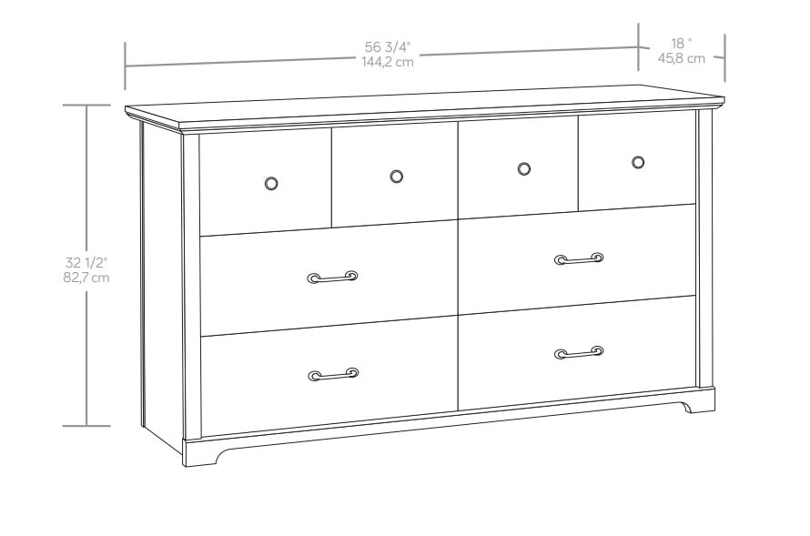 Assembled Dimensions: L: 56.77″ x W: 18.03″ x H: 32.56″ Six spacious drawers feature metal runners and safety stops Drawer divider in top drawers An interlocking safety mechanism allows only one drawer open at a time on each side Washed Oak finish This item is suitable for various age groups. Assembly required Model #: 437276 Box Dimensions: L: 62.05″ x W: 21.26″ x H: 8.27″ For additional questions or any issues, please contact the manufacturer at 1-800-523-3987. Be sure to check out the Mainstays Harrington collection for more great items!