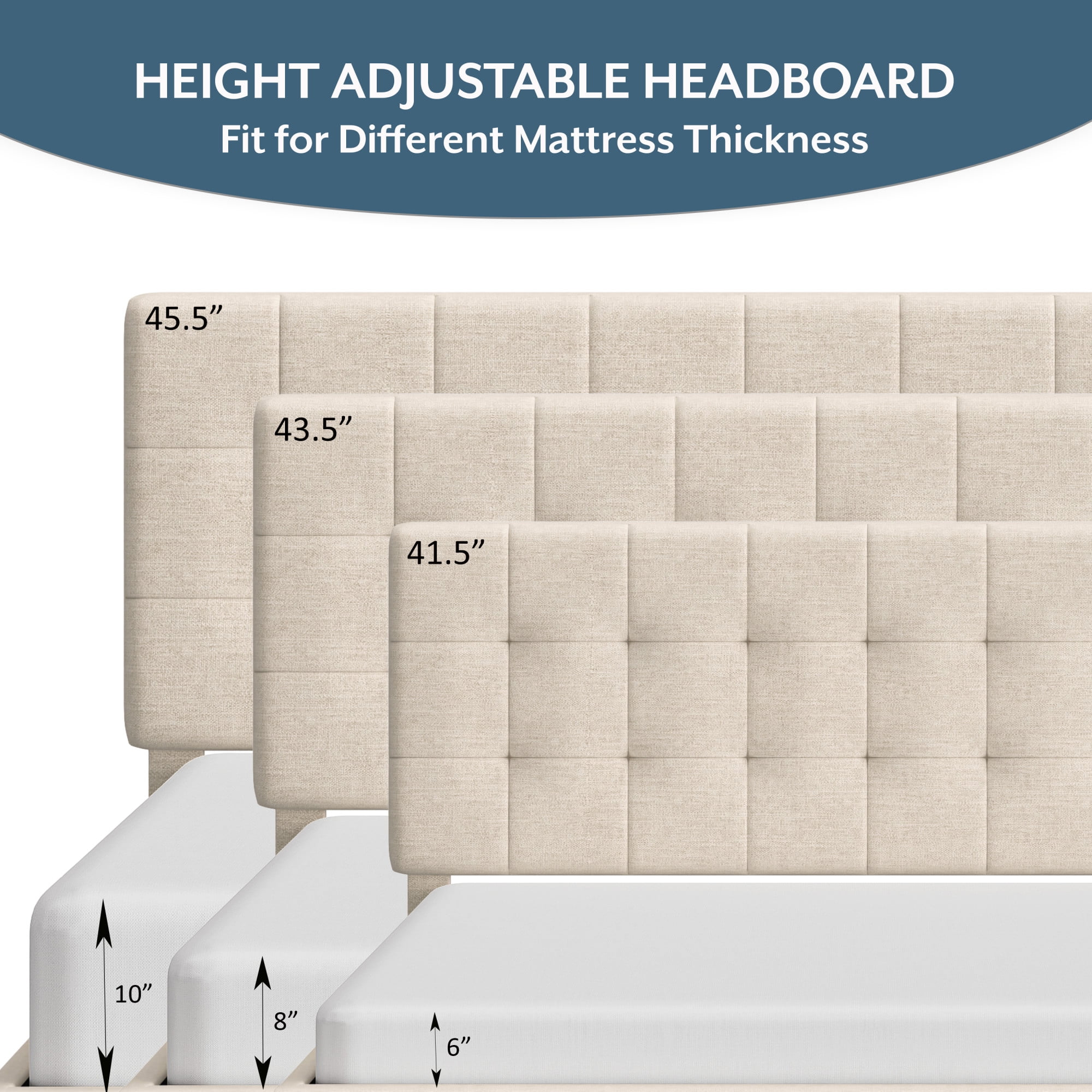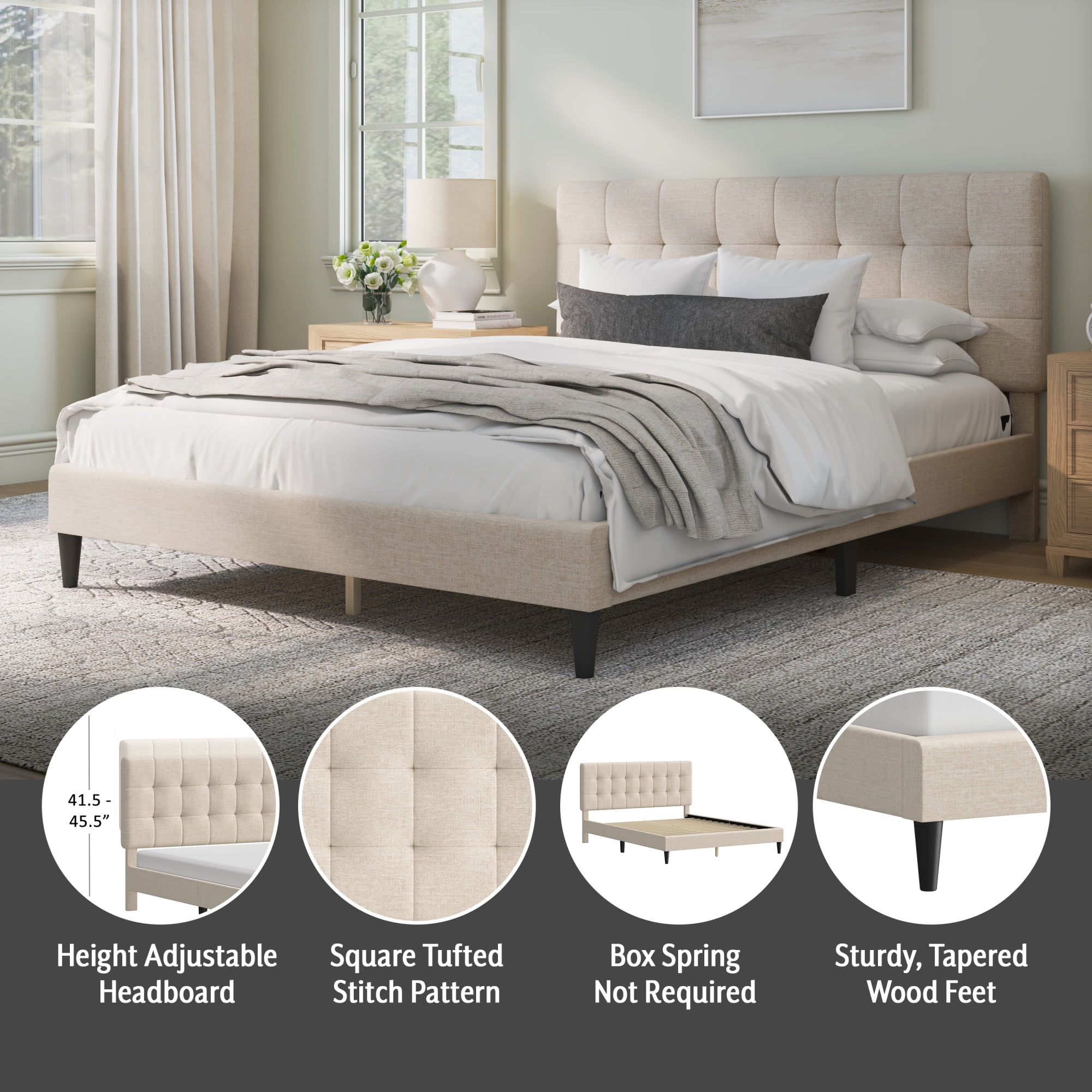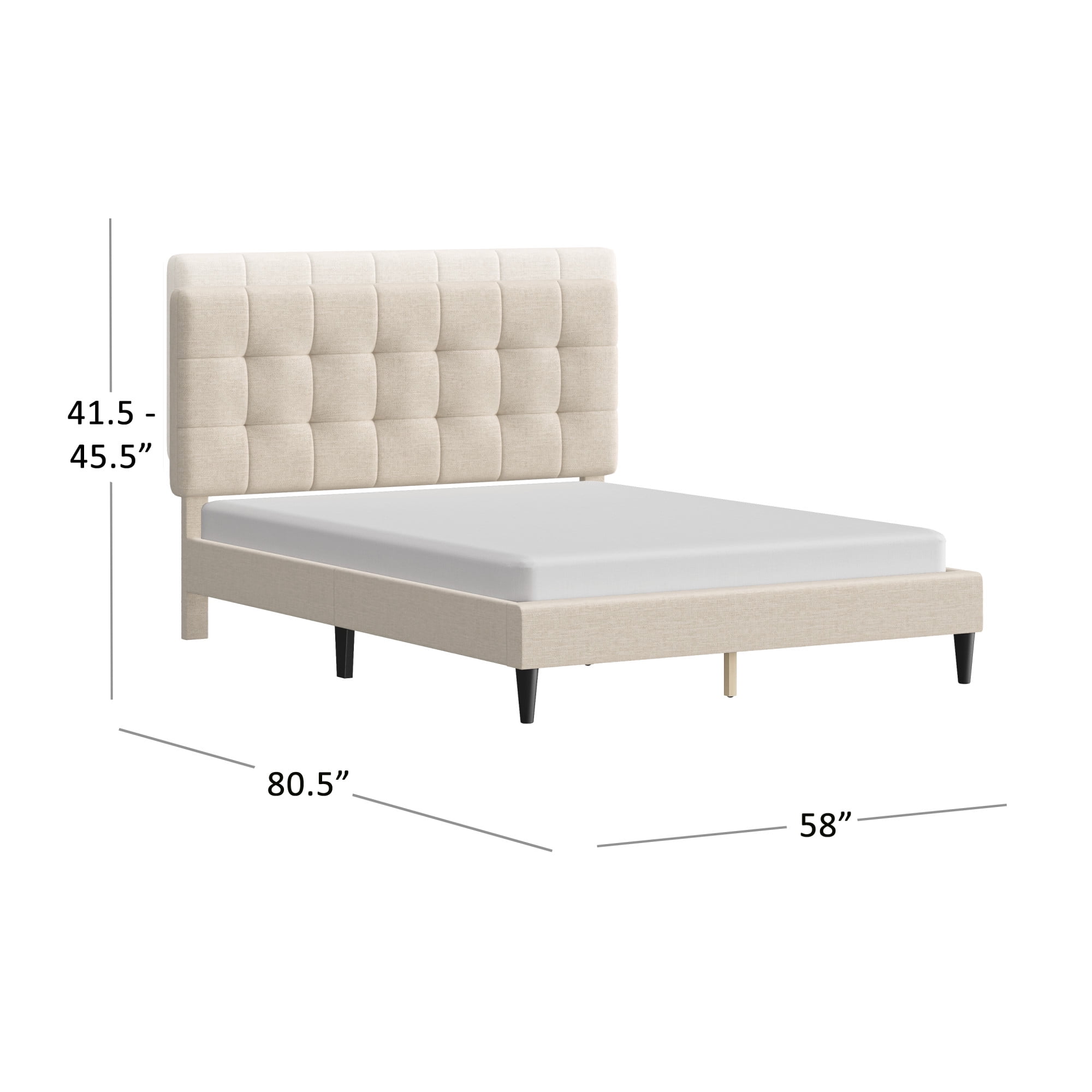Contemporary modern adult platform bed features eye-catching square tufted headboard Headboard is adjustable with three height options for a customized look Wooden construction upholstered in 100% polyester in ivory; Tapered legs finished in black Overall Dimensions: 41.5-45.5H x 58W x 80.5L Assembly required Item will ship in one box; Most bed components inside the headboard Mattress-ready bed means no box spring or other foundation is required Spot or wipe clean 500 lb. Recommended weight capacity For residential use only