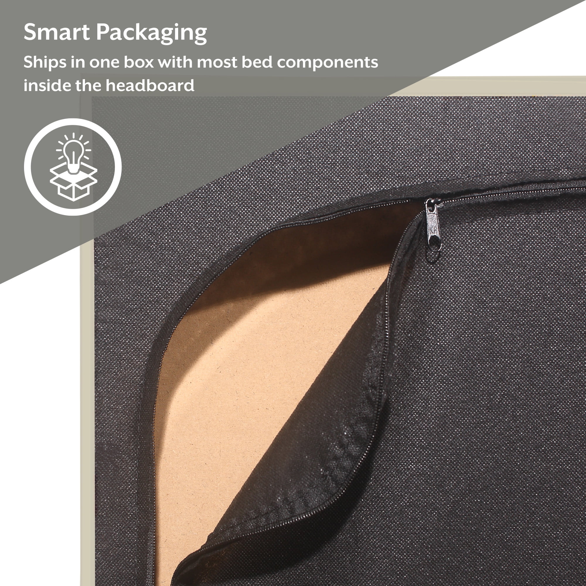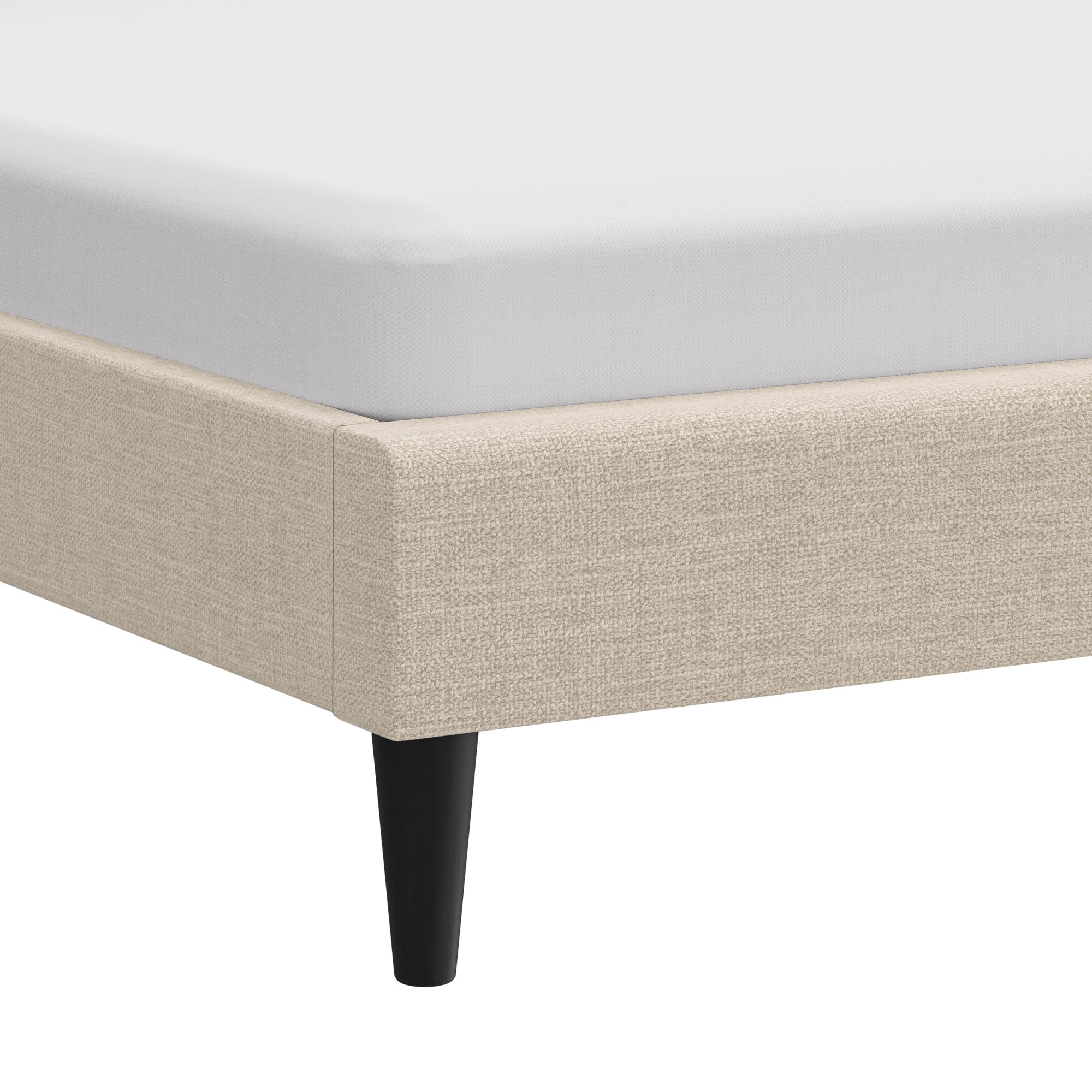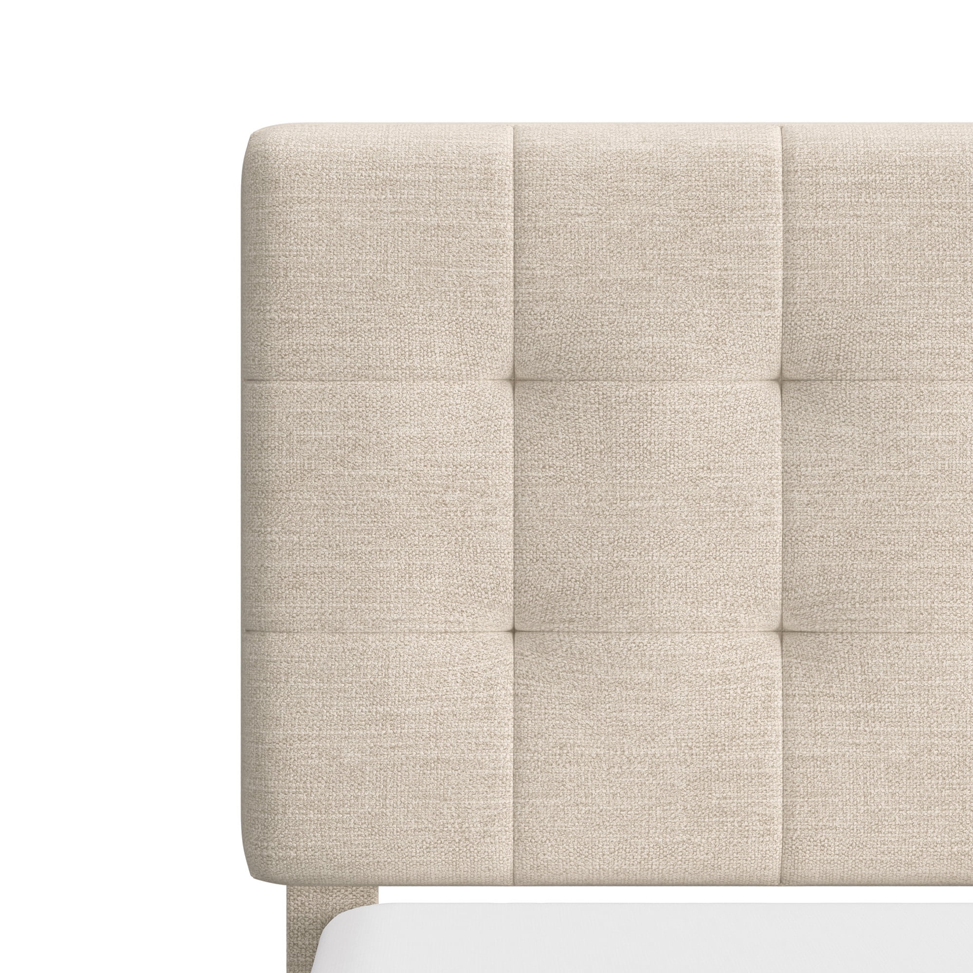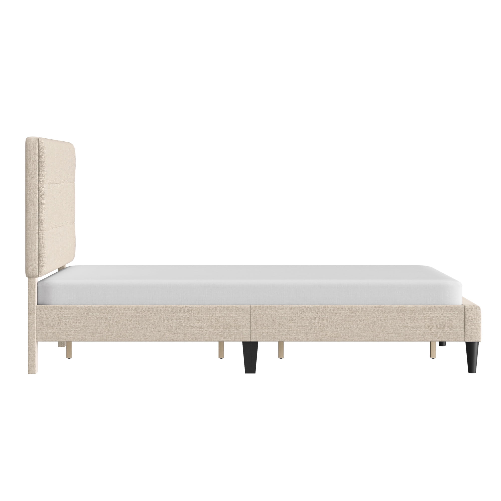 Contemporary modern adult platform bed features eye-catching square tufted headboard Headboard is adjustable with three height options for a customized look Wooden construction upholstered in 100% polyester in ivory; Tapered legs finished in black Overall Dimensions: 41.5-45.5H x 58W x 80.5L Assembly required Item will ship in one box; Most bed components inside the headboard Mattress-ready bed means no box spring or other foundation is required Spot or wipe clean 500 lb. Recommended weight capacity For residential use only