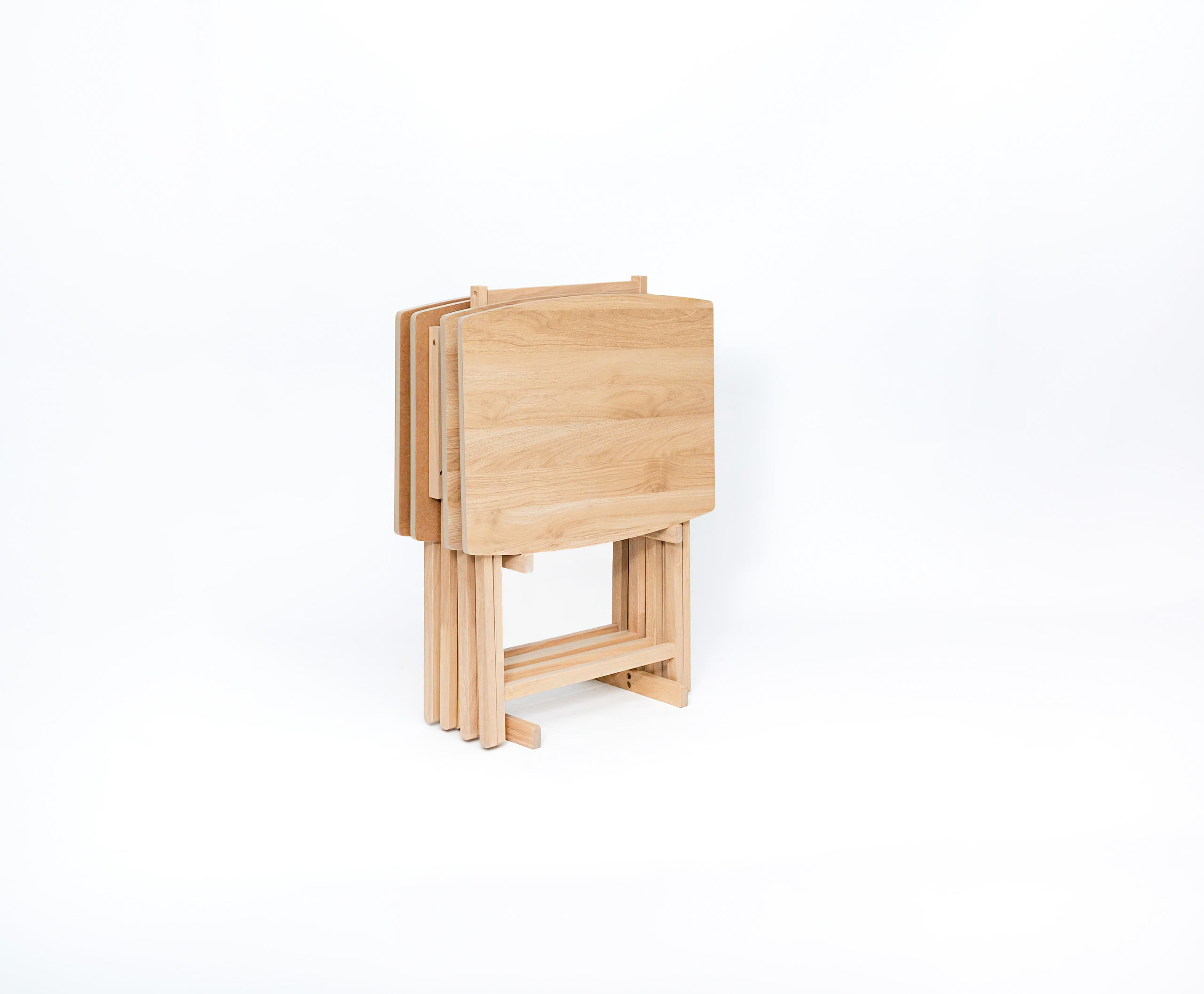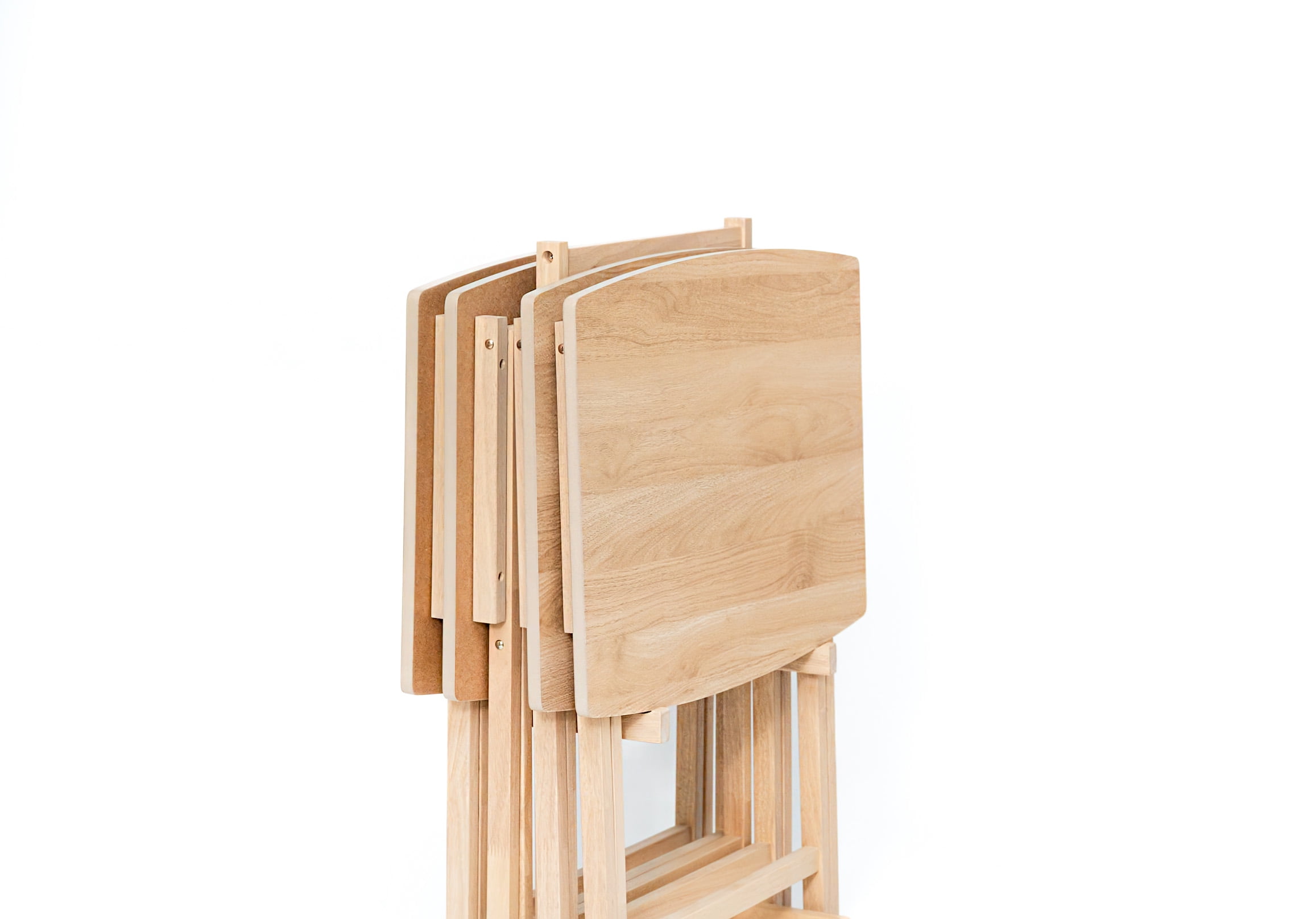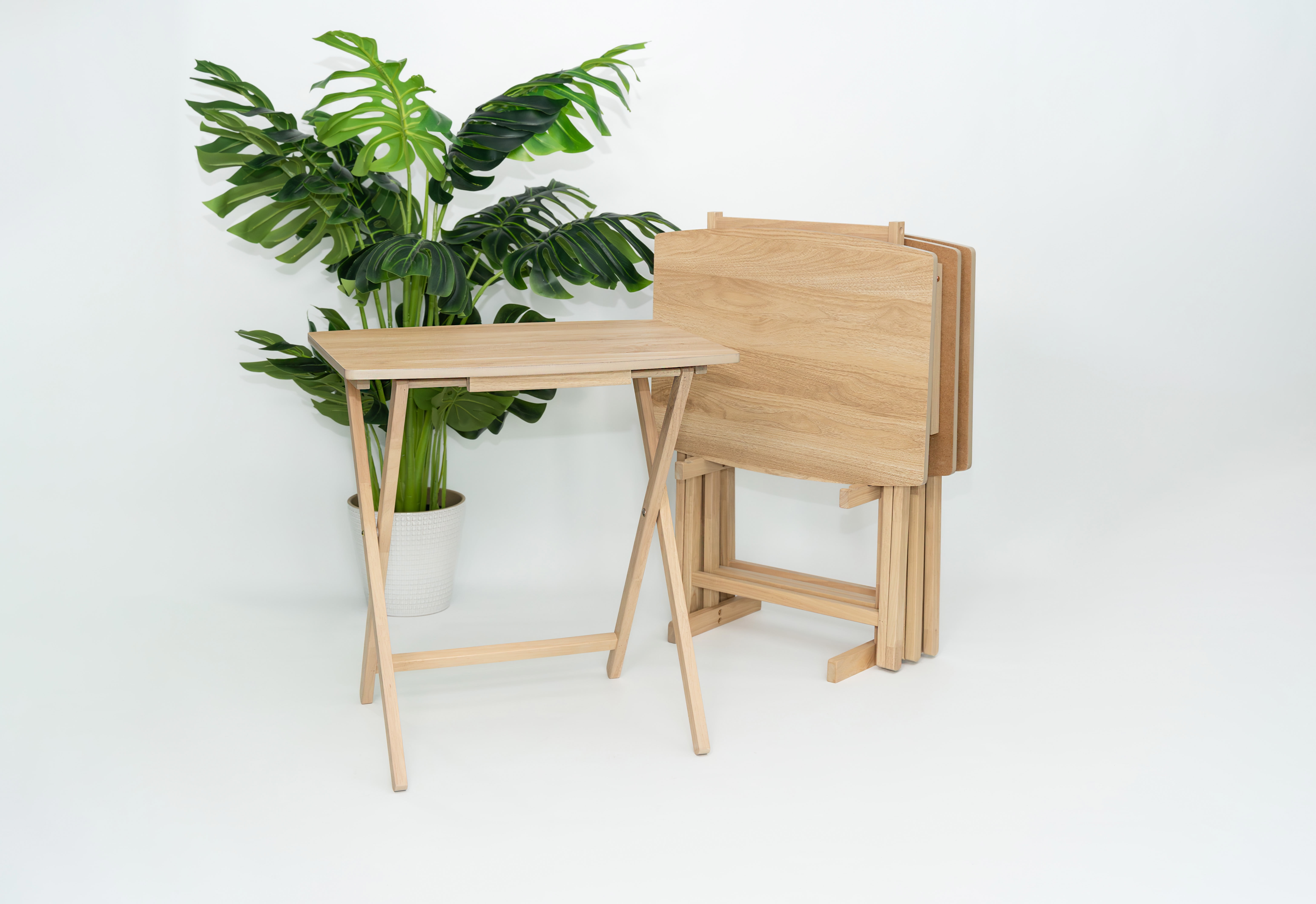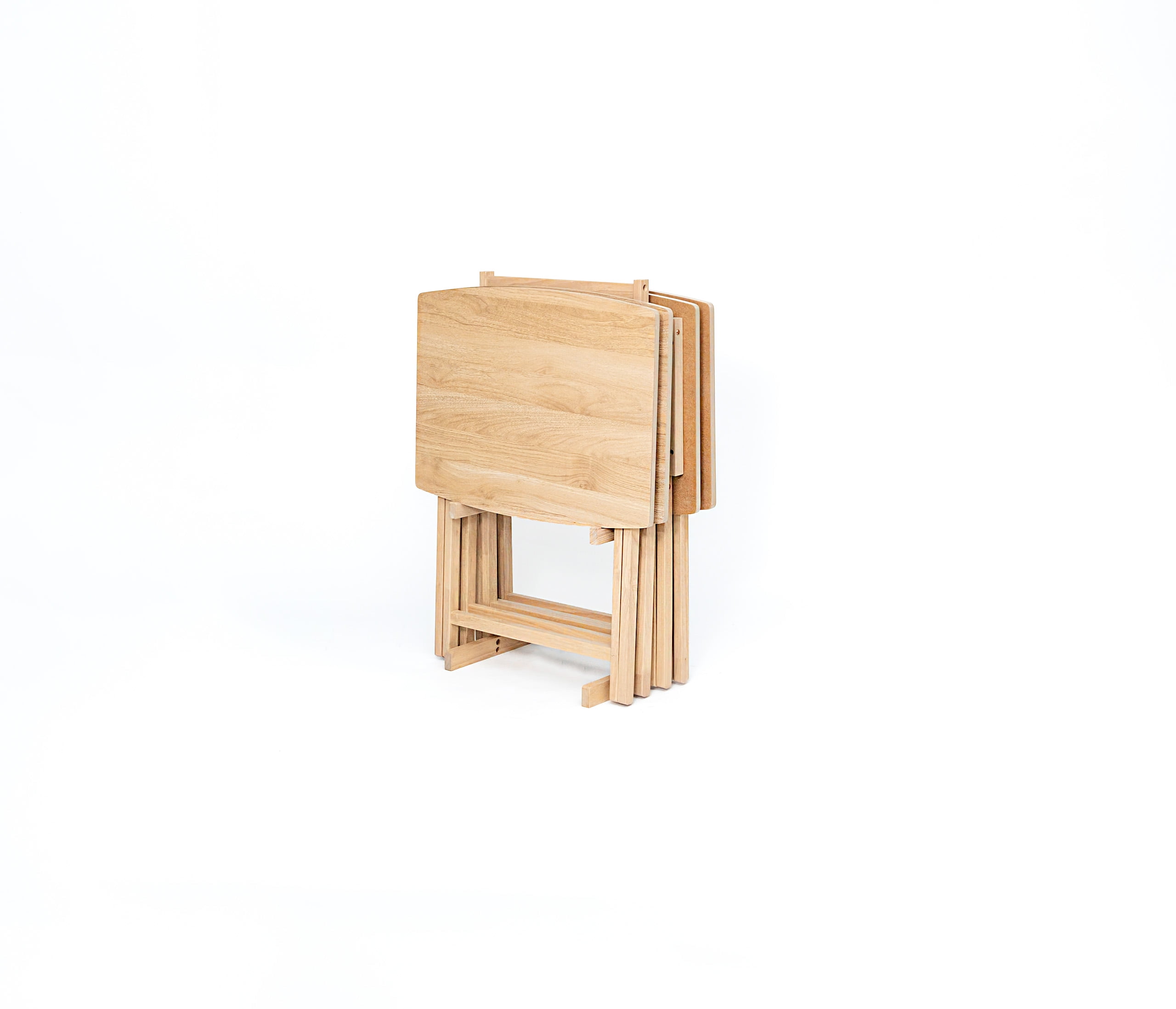Mainstays 5 Pieces Indoor XL Oversized Tray Table Set The tables in this set feature an XL oversized design, providing ample surface area for a variety of activities, from dining to working or entertaining guests. Mainstays Tables Natural Finish: The Natural finish adds a touch of elegance to your living space, effortlessly complementing various interior styles. Mainstays Tables Sturdy Rubberwood Legs: Crafted with durable rubberwood legs, these tables offer stability and longevity, ensuring they withstand the test of time.