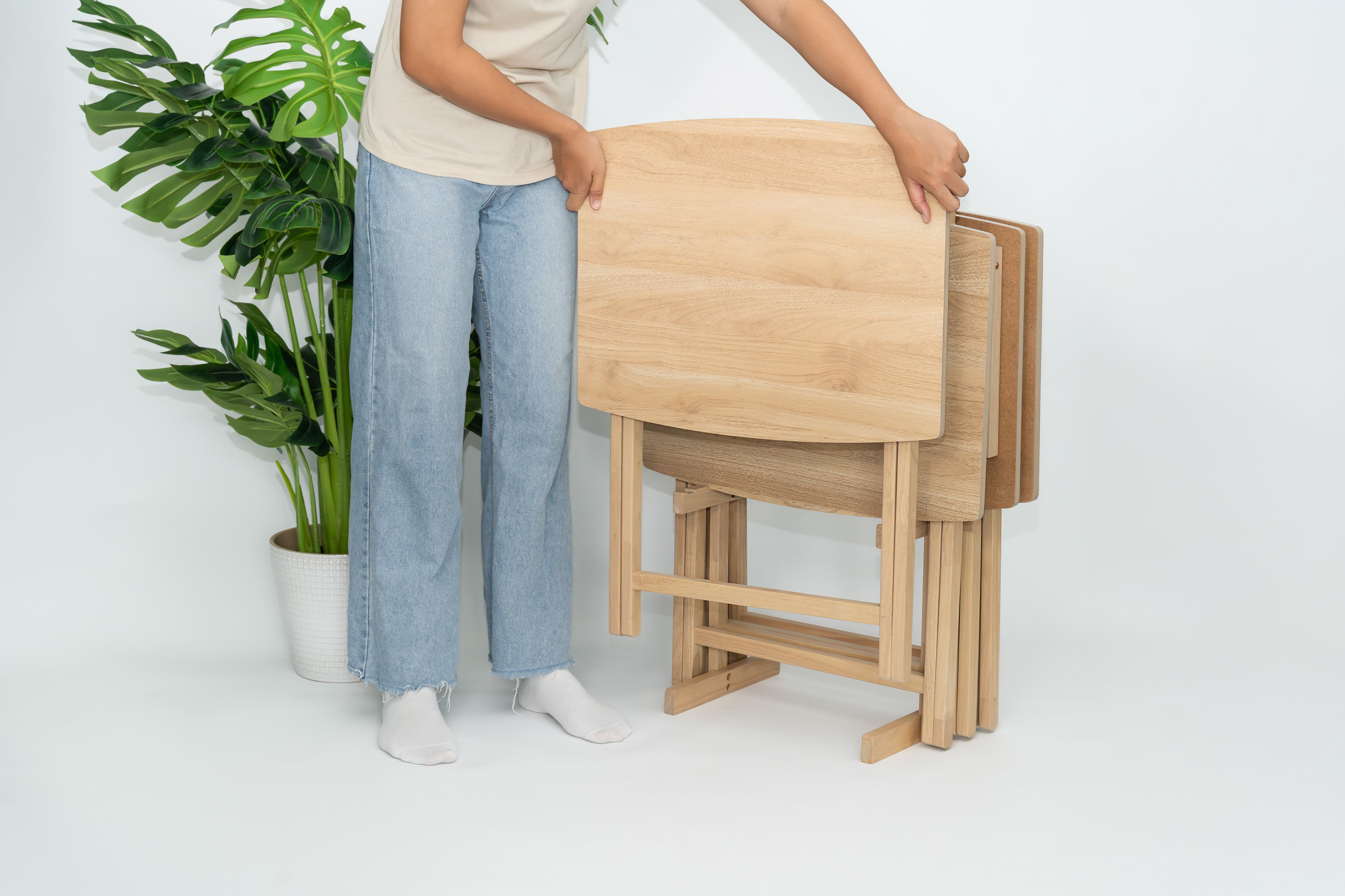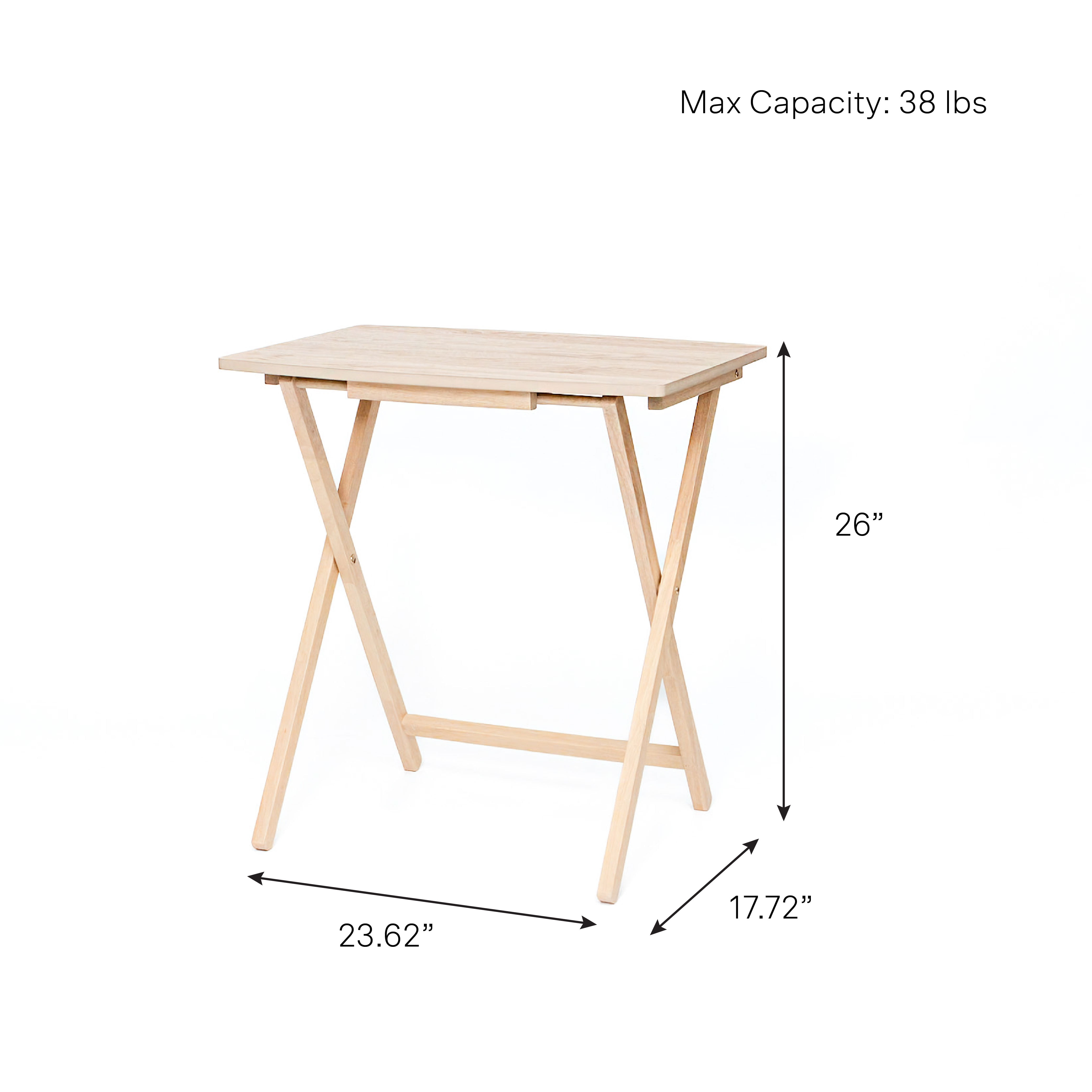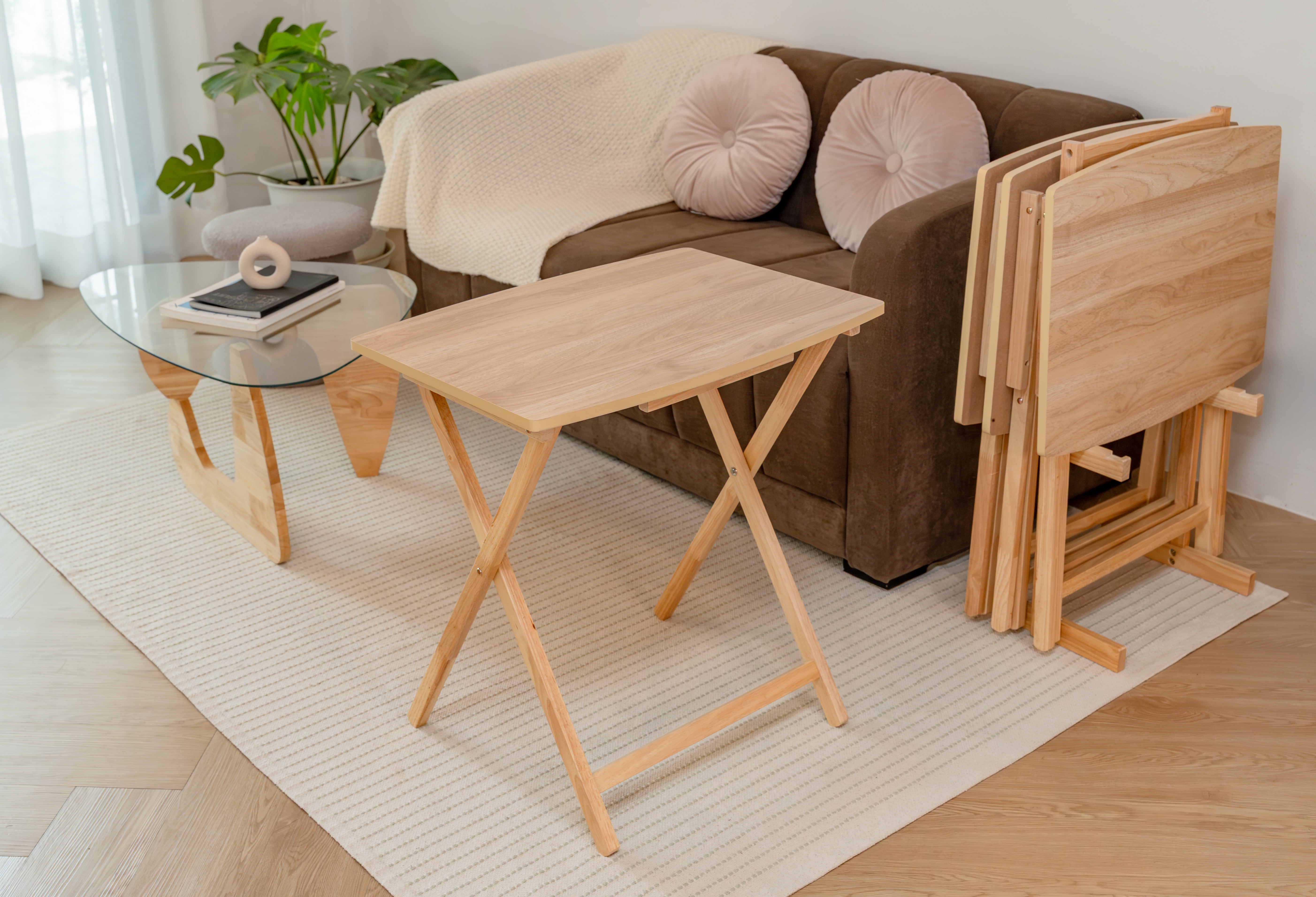 Mainstays 5 Pieces Indoor XL Oversized Tray Table Set The tables in this set feature an XL oversized design, providing ample surface area for a variety of activities, from dining to working or entertaining guests. Mainstays Tables Natural Finish: The Natural finish adds a touch of elegance to your living space, effortlessly complementing various interior styles. Mainstays Tables Sturdy Rubberwood Legs: Crafted with durable rubberwood legs, these tables offer stability and longevity, ensuring they withstand the test of time.