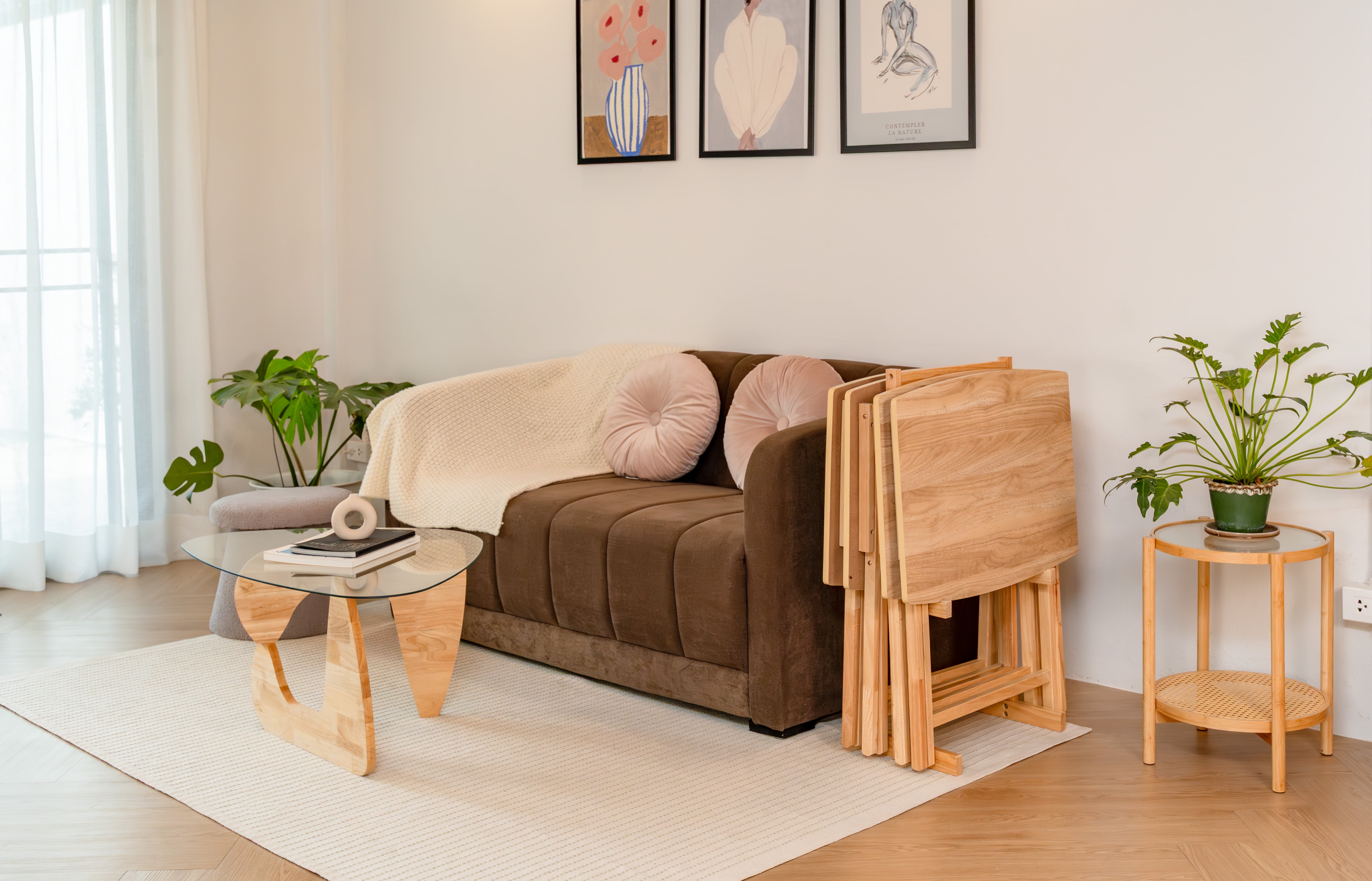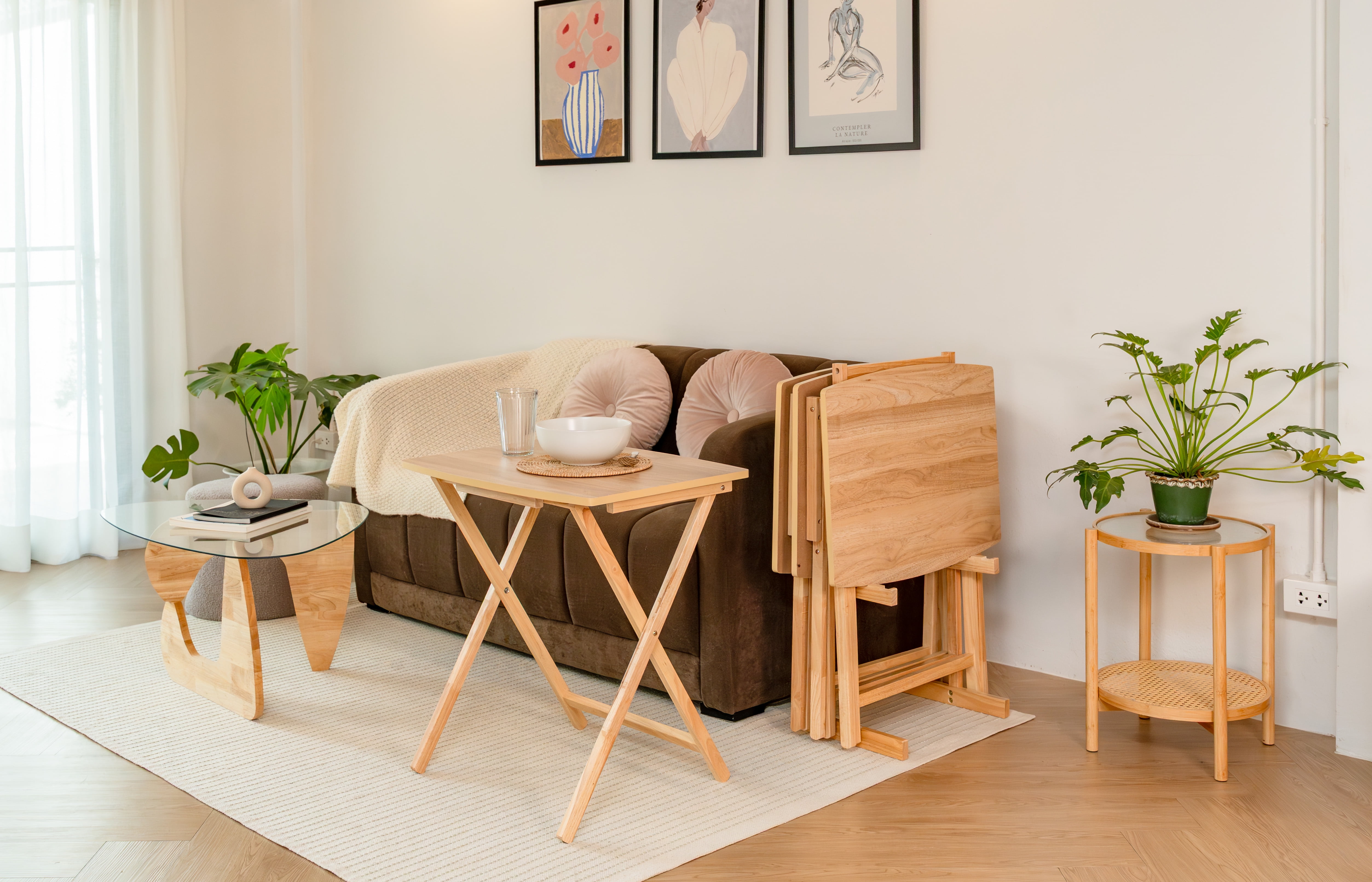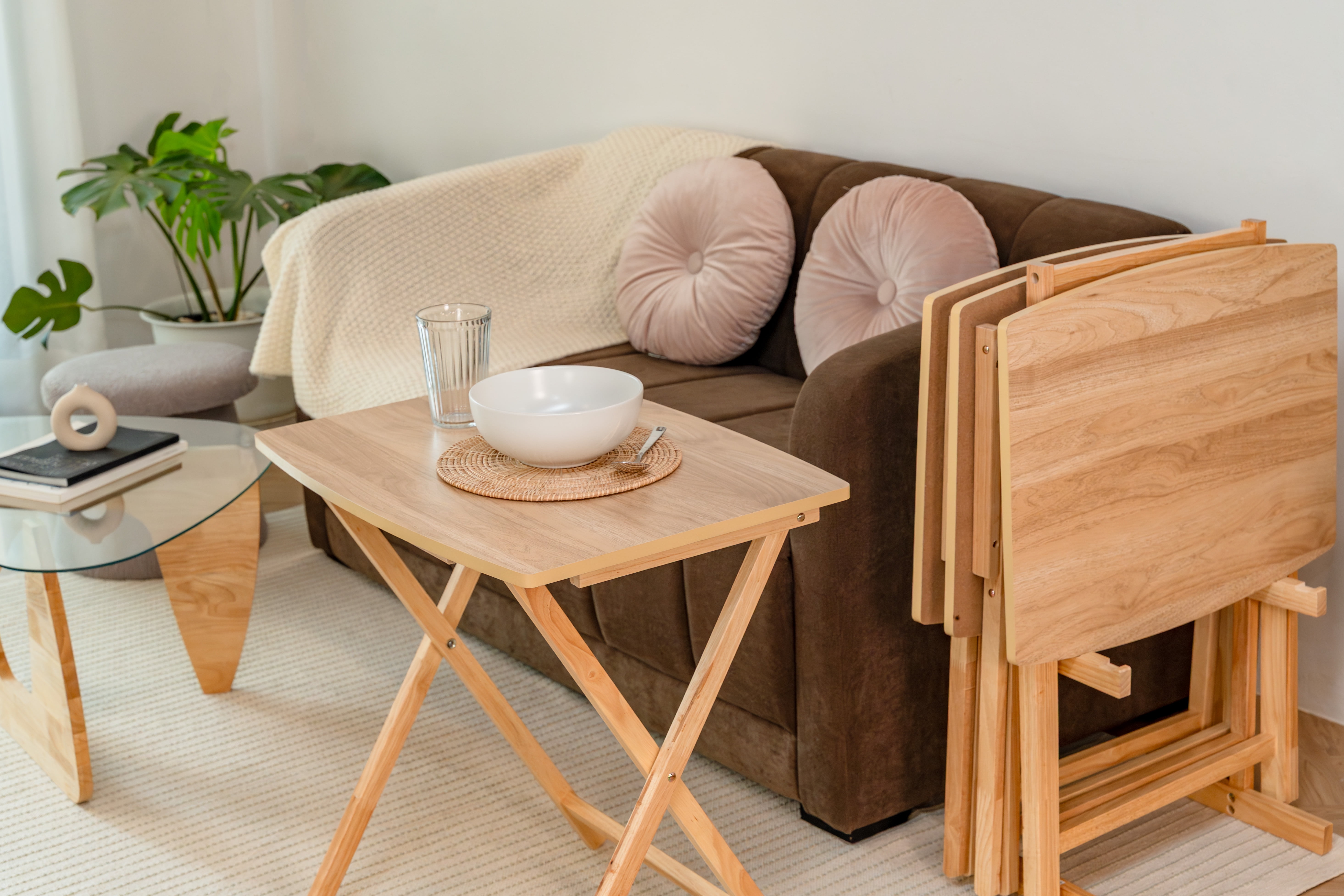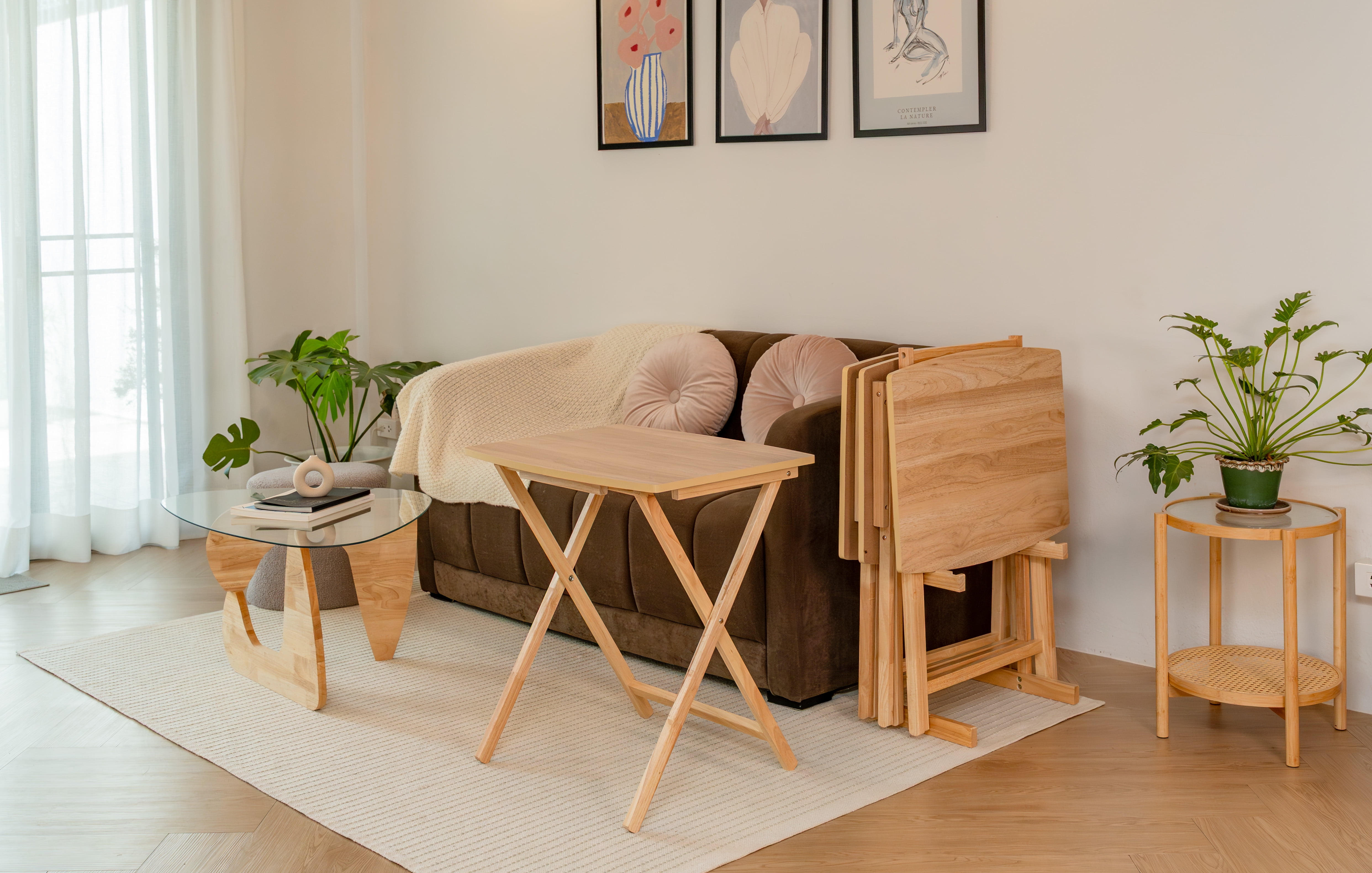 Mainstays 5 Pieces Indoor XL Oversized Tray Table Set The tables in this set feature an XL oversized design, providing ample surface area for a variety of activities, from dining to working or entertaining guests. Mainstays Tables Natural Finish: The Natural finish adds a touch of elegance to your living space, effortlessly complementing various interior styles. Mainstays Tables Sturdy Rubberwood Legs: Crafted with durable rubberwood legs, these tables offer stability and longevity, ensuring they withstand the test of time.