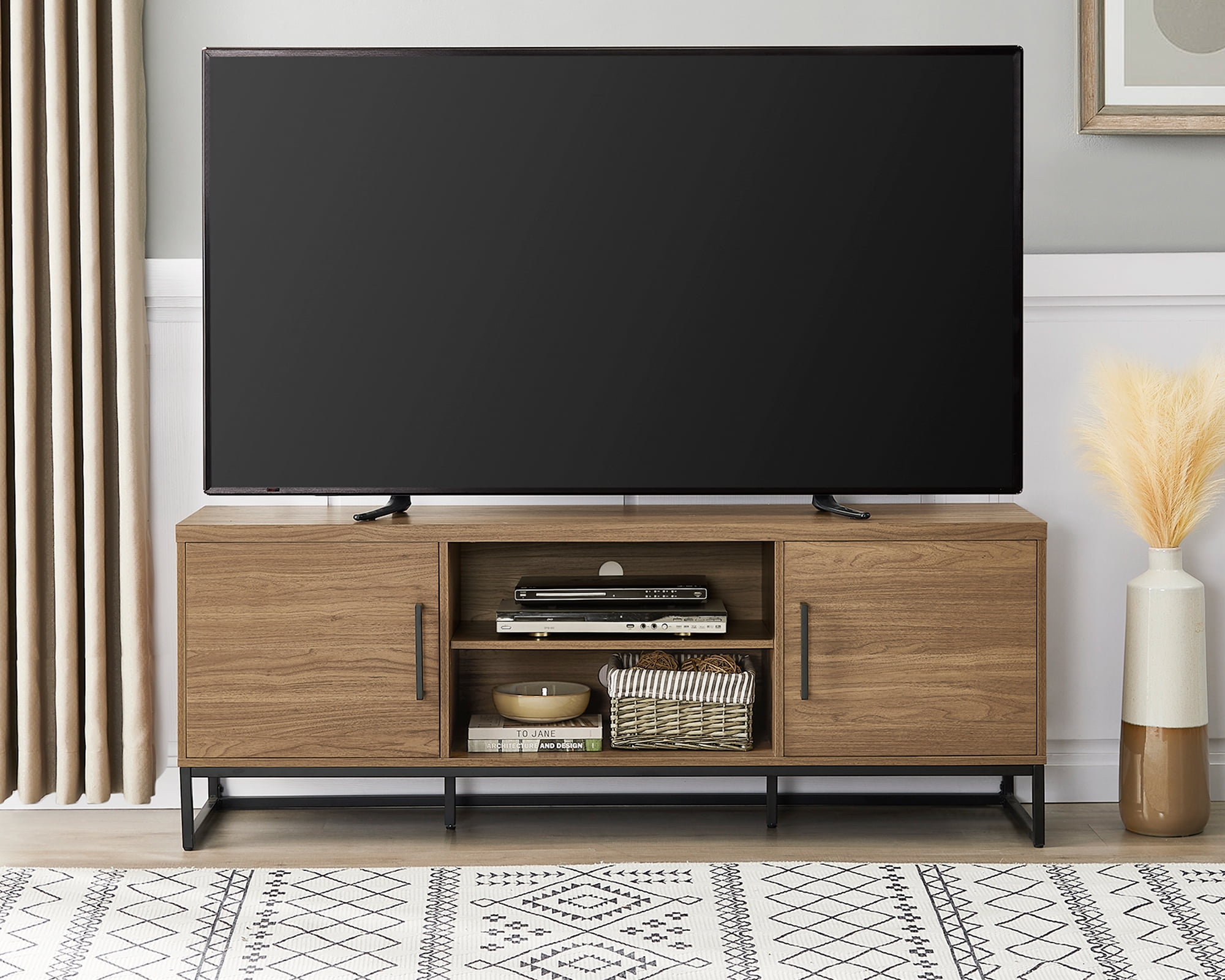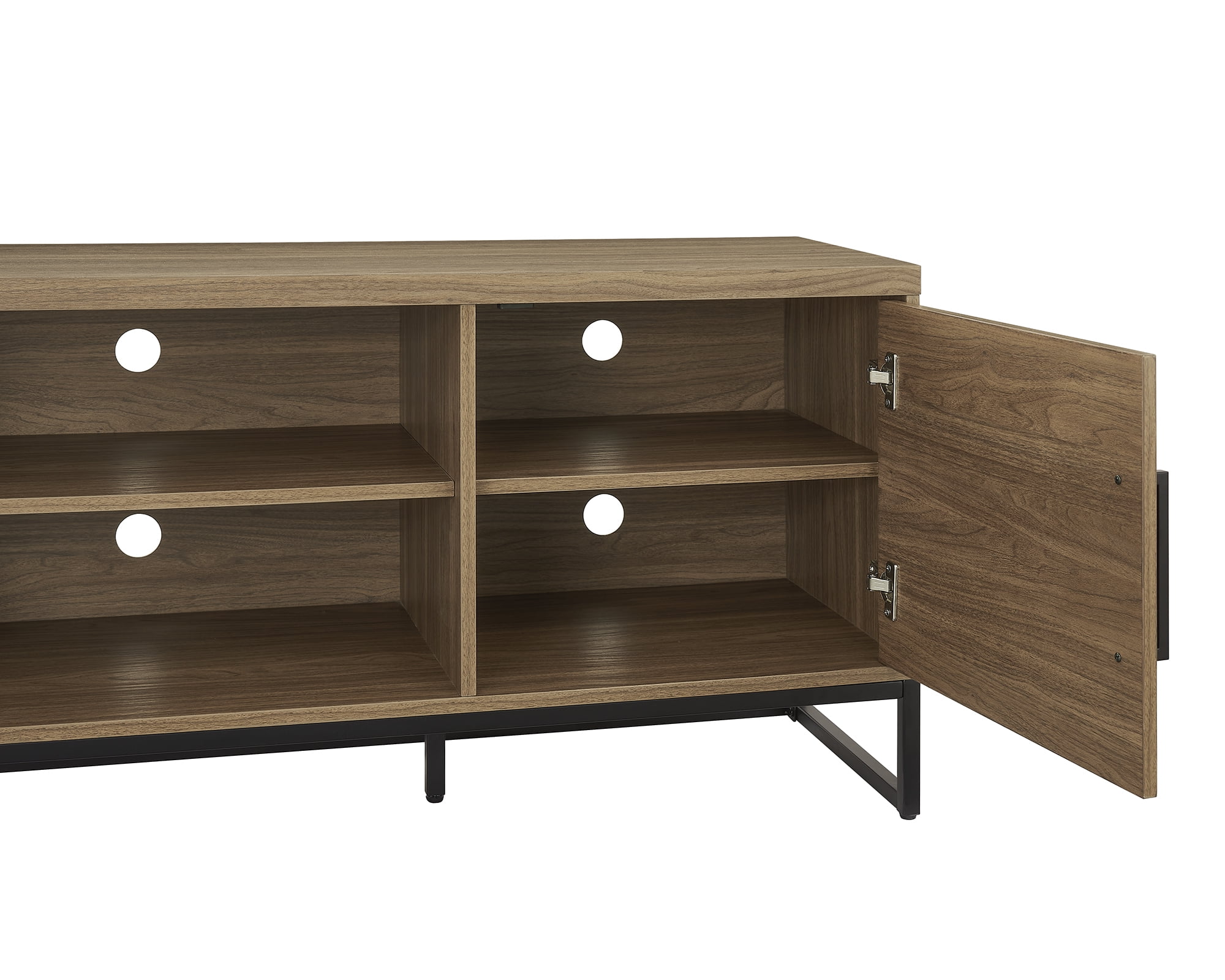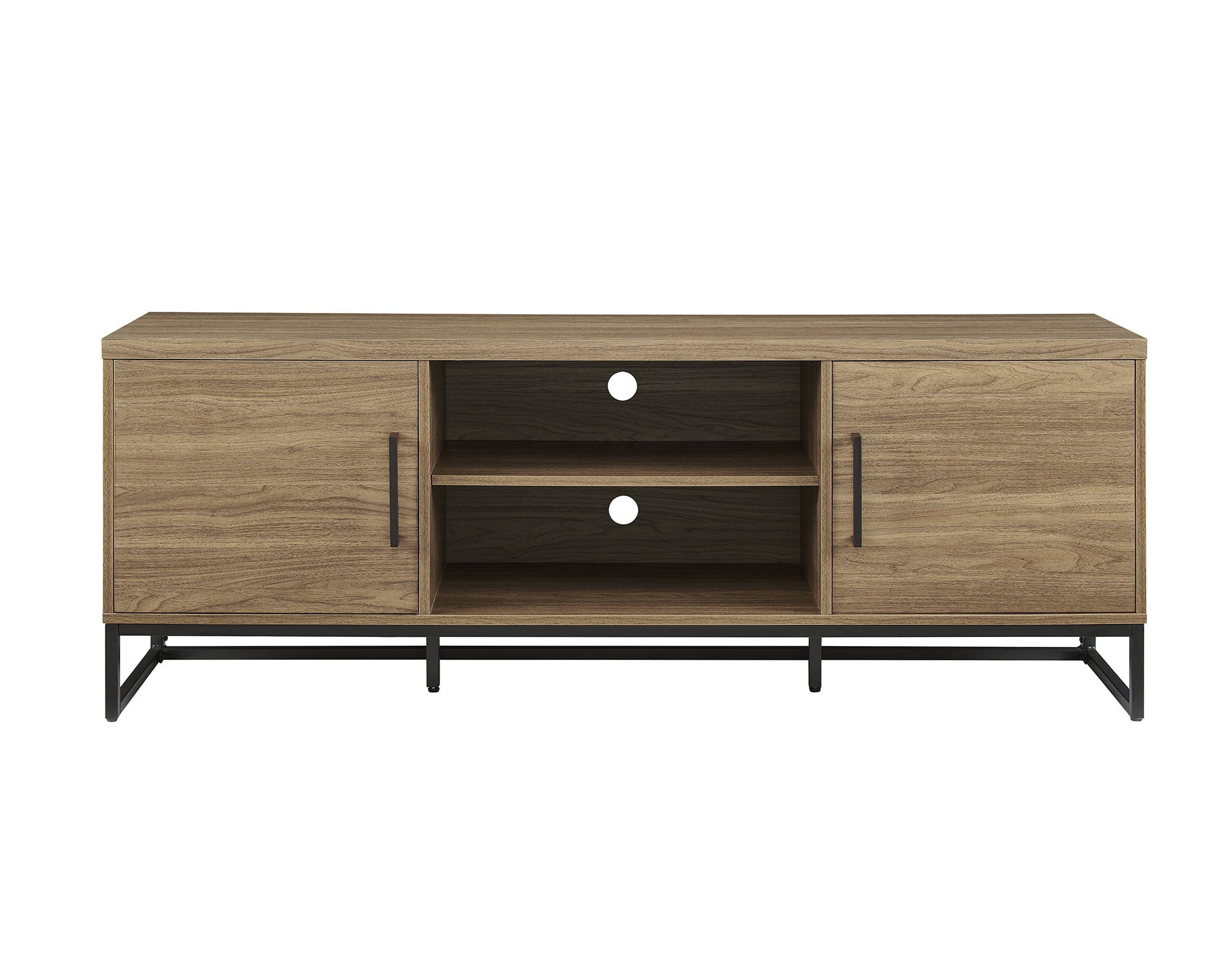 Color: Canyon Walnut Strong metal legs and door handles Accommodates most TVs up to 70″ Maximum weight: 135 lbs Wire management holes at the back of every shelf Comes with assembly tools & instructions for easy assembly Product Weight: 79.4 LBS G.W.: 89.3 LBS Assembled Product Dimensions: 63″W*15.5″D*23.4″H Packaging Dimensions: 66.9″W*18.1″D*6.1″H