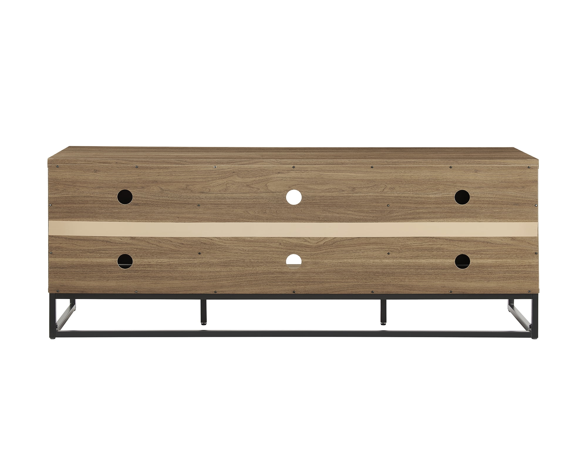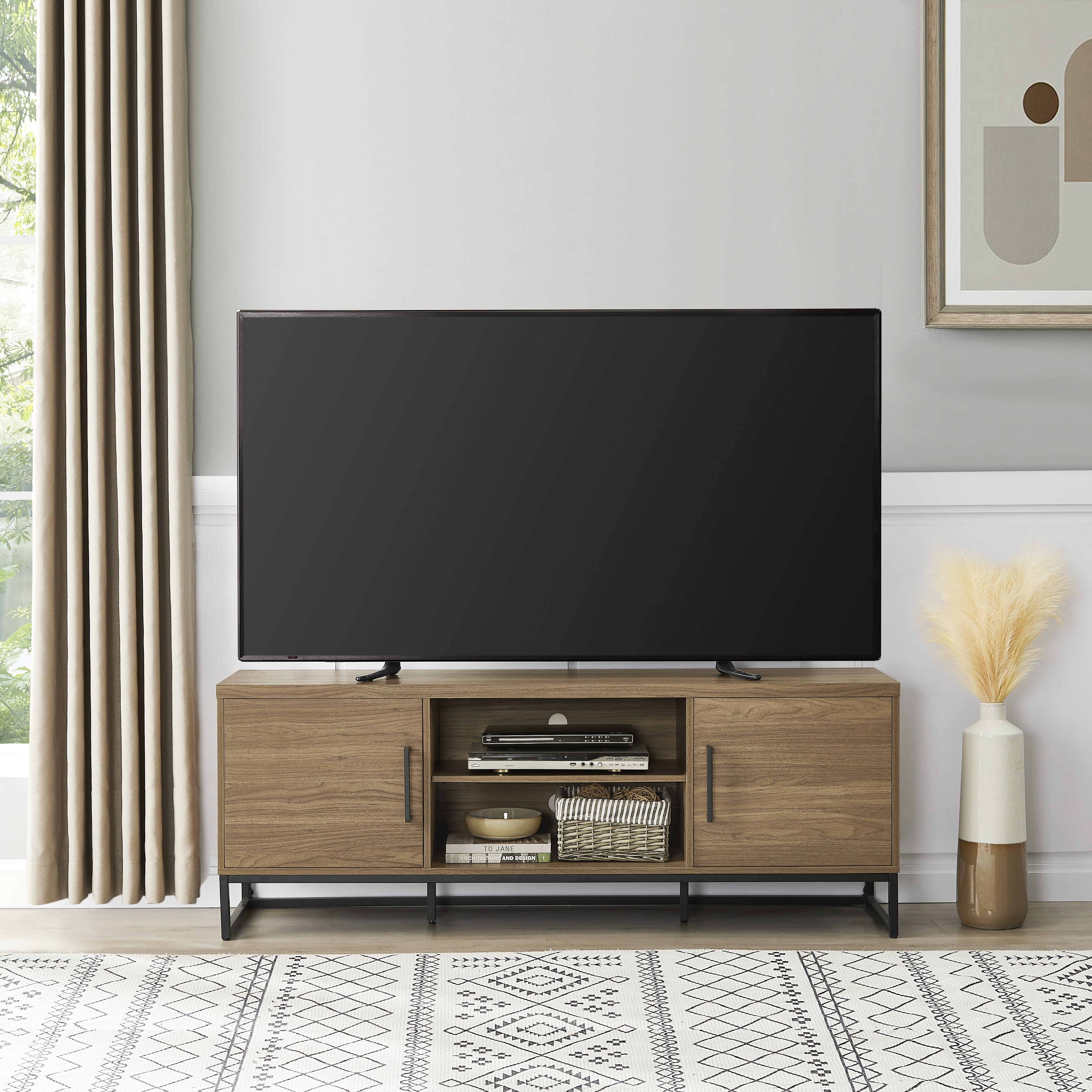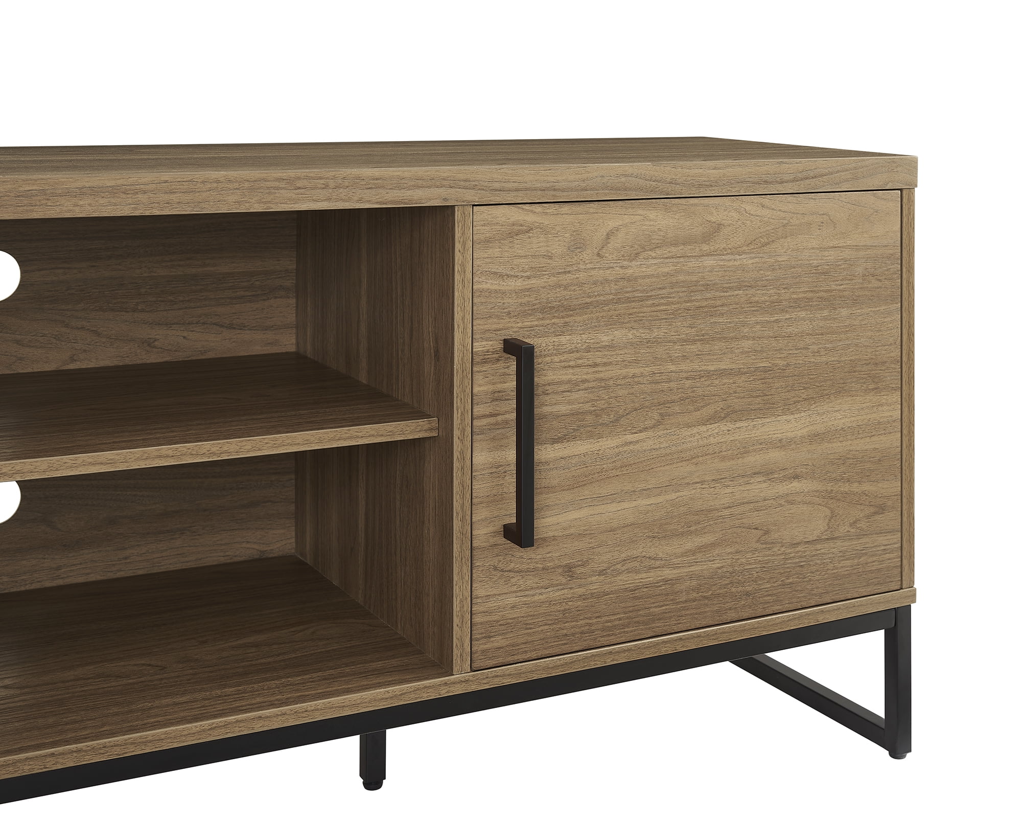 Color: Canyon Walnut Strong metal legs and door handles Accommodates most TVs up to 70″ Maximum weight: 135 lbs Wire management holes at the back of every shelf Comes with assembly tools & instructions for easy assembly Product Weight: 79.4 LBS G.W.: 89.3 LBS Assembled Product Dimensions: 63″W*15.5″D*23.4″H Packaging Dimensions: 66.9″W*18.1″D*6.1″H