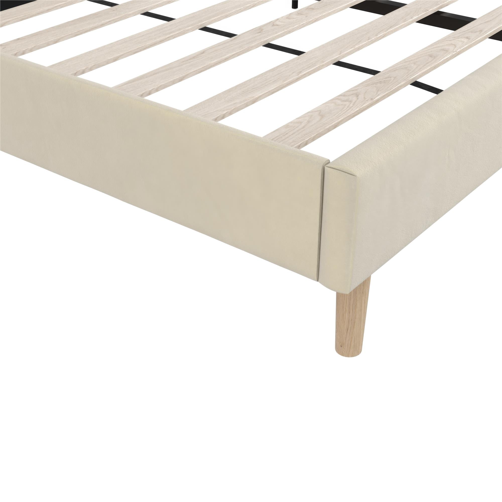 Fine-tune your style senses with the Mainstays Kelsey Upholstered Platform Bed Frame, where relaxation meets refined design. Our guestroom-worthy furniture showcases a magnificent channel-tufted wingback headboard with fully upholstered back legs and chic tapered solid wood front legs, making it a standout addition to your contemporary adult bedroom. The sturdy construction features a metal frame, rails, and inner support legs, complemented by convenient hook-and-loop fastened, pre-rolled wooden slats for exceptional stability. The premium velvet fabric material wraps the entire bed frame, offering padded sides, a cushioned footboard, and a lavish headboard for enhanced sleep comfort. Engineered for restful nights, this platform bed accommodates all mattress types (sold separately) and powerfully supports up to 1000 lbs. of weight, no box spring needed. The included ratchet tool and perfectly aligned parts guarantee an easygoing assembly process. Choose the Kelsey for your modern master suite–the perfect combination of elegance and ease, available in queen and king sizes.