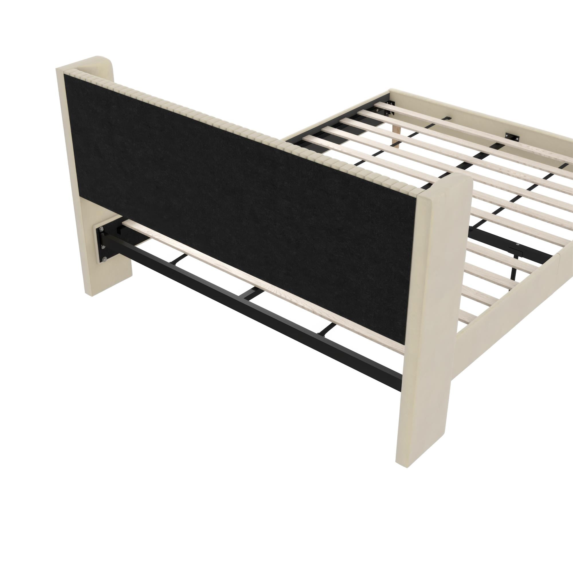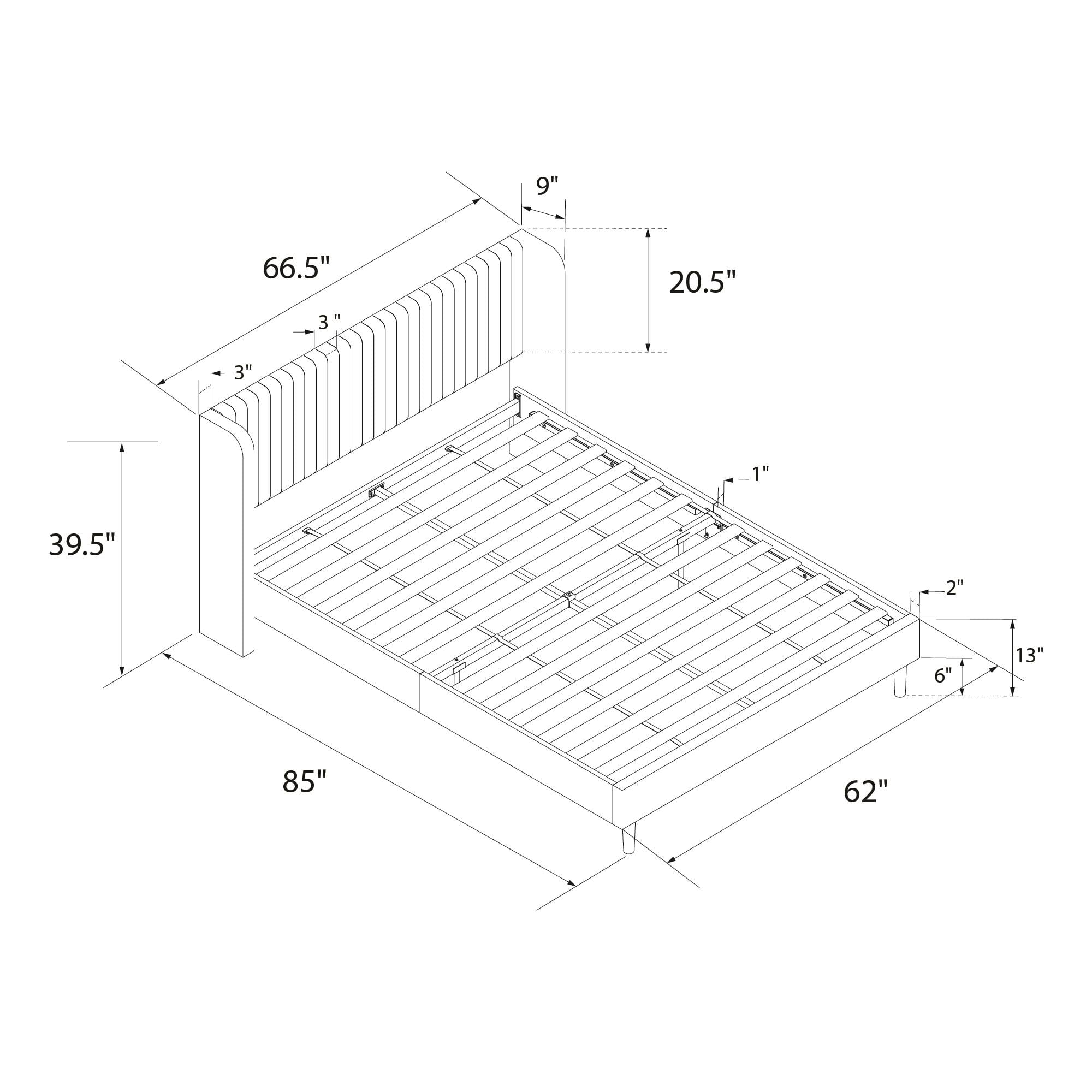 POWERFULLY CRAFTED STYLE: Available in queen and king size options, the heavy-duty metal bed frame, rails, and center legs combine to strongly support up to 1000 lbs., accommodating all mattress types (minimum 8″ depth suggested) with no box spring needed MASTER SUITE MASTERPIECE: Beautify your bedroom or guestroom with our modern upholstered platform bed frame, featuring a grand channel tufted wingback headboard with fully upholstered back legs and front, tapered solid wood legs for a polished touch CONTEMPORARY COMFORT REDEFINED: Revel in the plush velvet fabric material that adorns the cushioned side and footboard panels, as well as the padded headboard, crafting a snug space that ushers in restful sleep with a platform bed frame made for unwinding ENHANCED DESIGN QUALITY: Perfectly aligned parts, pre-rolled wooden slats with easy install hook-and-loop fasteners, and an included ratchet tool – all conveniently shipped in one box for your benefit – simplify the assembly process to ensure simple setup DIVINE BEDROOM BACKDROP: Queen size platform bed frame dimensions: 66.5″W x 85″D x 39.5″H. Net weight: 83.5 lbs. Benefit from a 1-year limited warranty against manufacturer defects. Queen size mattress sold separately. Spot clean with a lightly damp cloth