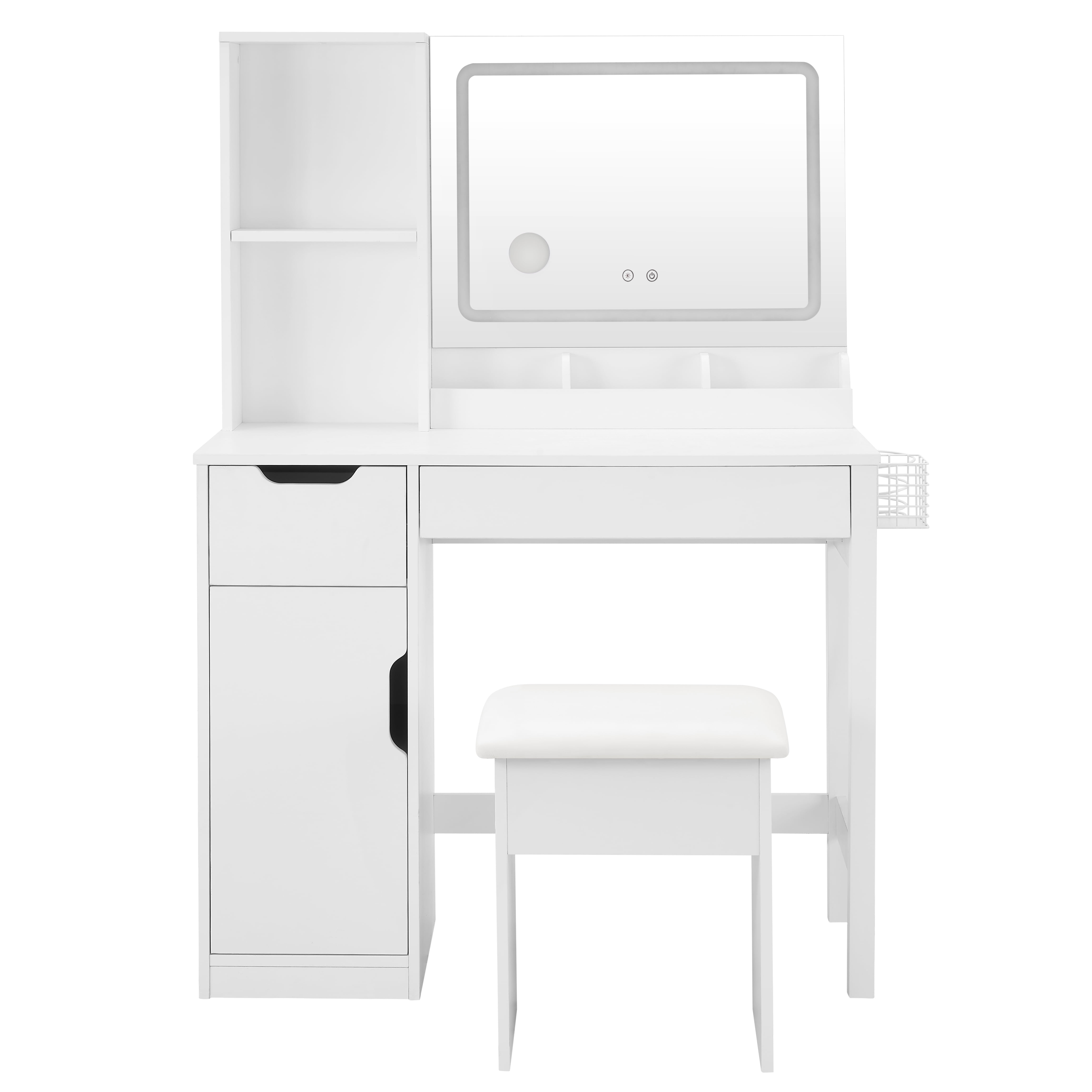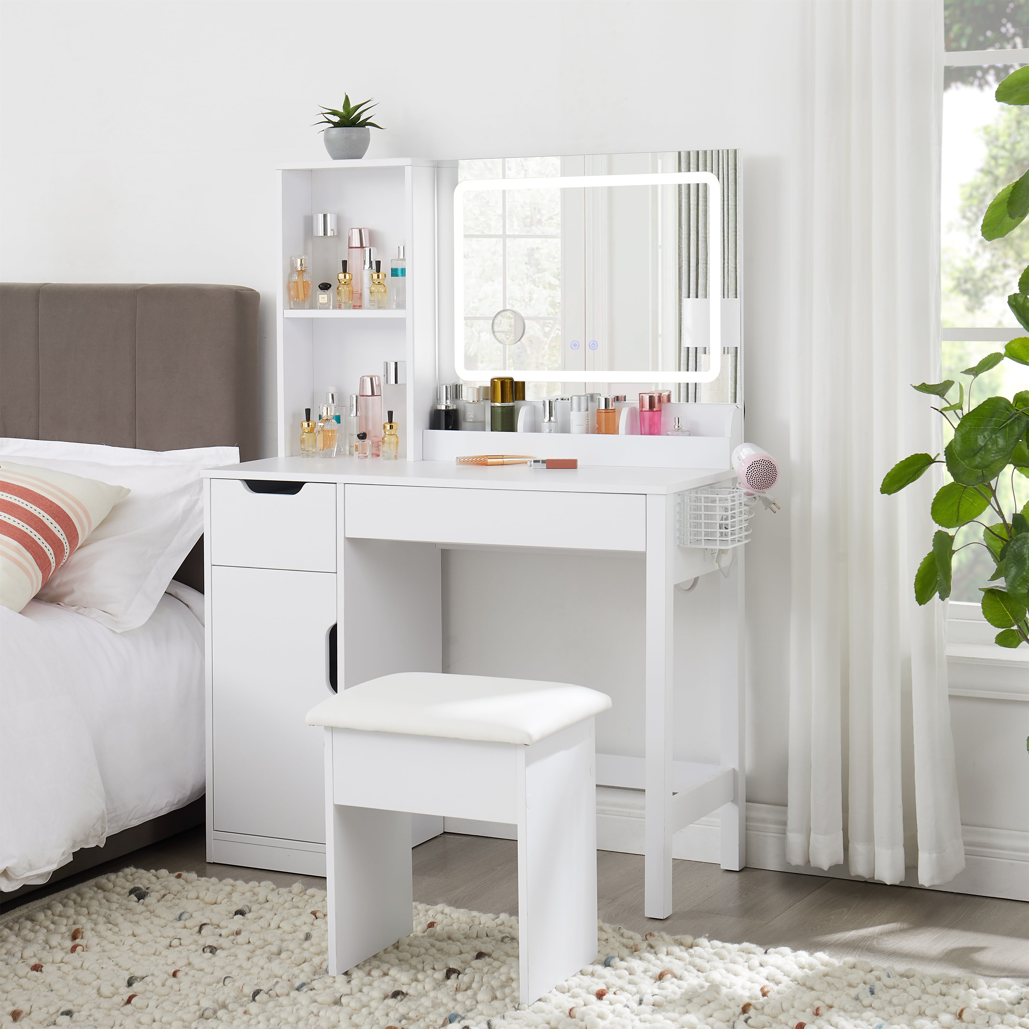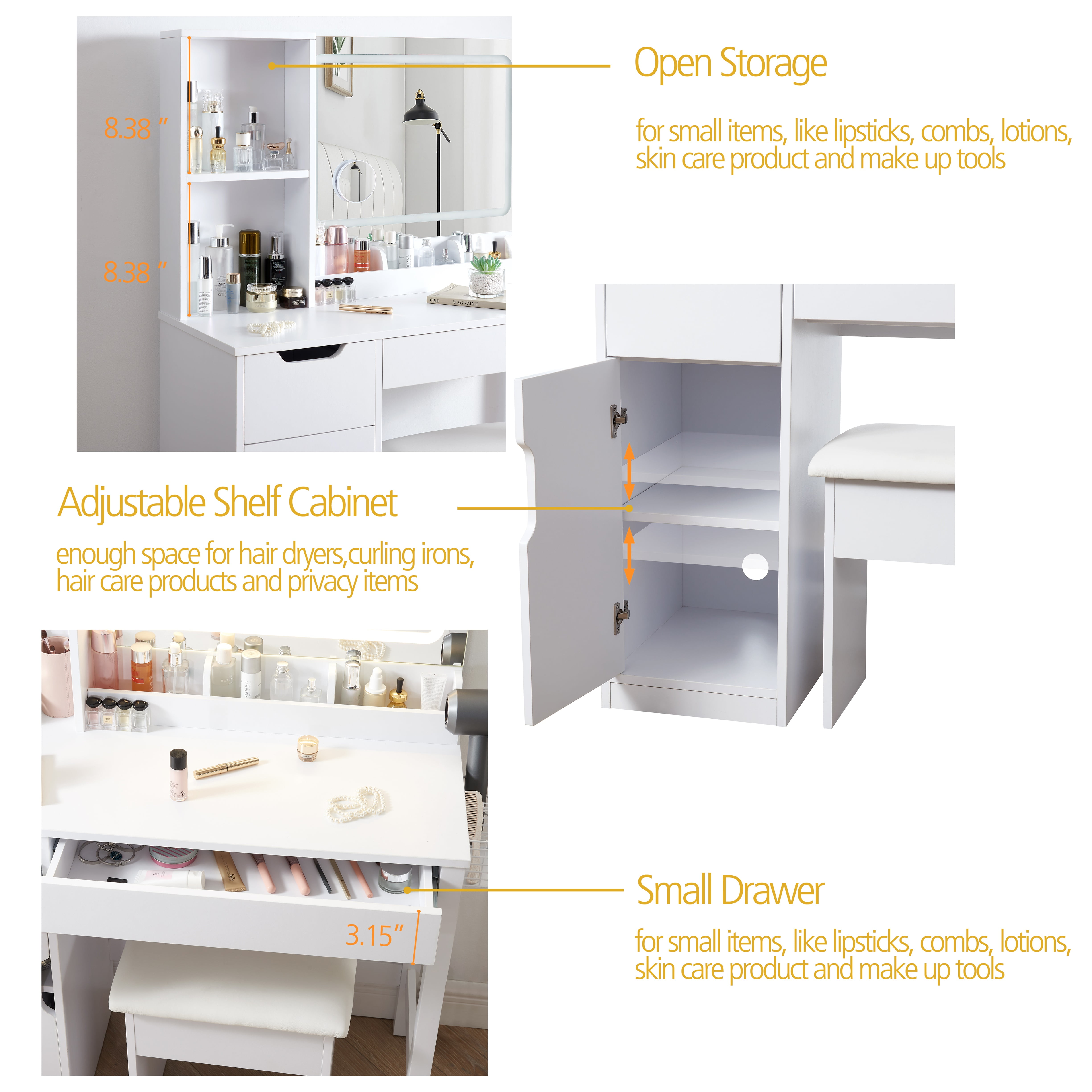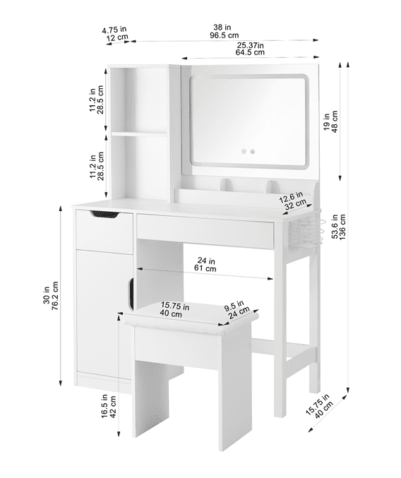 Vanity with Makeup Mirror & LED Light-with a Large HD mirror providing a wider field of view. LED light with 3 color modes allows you to customize your lighting scheme. Touch switch, lights can be switched with just a touch. The lightness will be adjustable if you press the button. You can do your makeup in different angle. It can accurately illuminate skin color and complexion during the day or at night, allowing you to enjoy every detail of makeup. Ample storage capacity- This Mainstays Kensington Vanity features a spacious tabletop and three small turnable drawers to keep small jewelry or accessories. While open Shelves on table top are a good place to showcase your picture frames, jewelry, flowers and more. Tiered storage in the cabinet makes items easy to find. Built with a drawer, a open shelf storage, and a cabinet, staying organized has never been so easy. Stylish and functional – This vanity table has a versatile look that complements a wide variety of room decor. A large table top is ideal for keeping all your makeup, perfumes and trinkets within an arm’s reach. Plush Comfort Seating – Elevate your makeup routine in comfort. Our padded vanity stool, complete with a luxurious PU cushion, ensures every application is a relaxing experience. Make Up Desk with Charging Station-The upgraded make up desk comes with a power outlet, two USB ports, and a hairdryer holder, allowing you to sit at the vanity and easily use your hair dryer or curling iron and charge your phone, tablet, etc. Specifications: Material: Medium Density Fiberboard (MDF) Color: White Overall Size: 38″W x 15.75″D x53.6″H Package Include: 1 x Dressing Table,1 x Dressing Stool,1 x Instructions,1 x Accessories Package