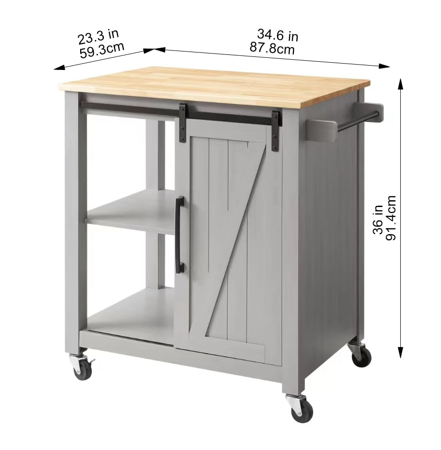 Perfect for adding extra workspace in your kitchen. Includes one drawer, a cabinet, and three open shelves for holding your cooking supplies, plates, bowls, and more. Thanks to the smooth-rolling wheels, you can move this kitchen cart anywhere. Two locking casters keep the cart in place during food preparation. A thick wood board provides spacious food preparation surface. It can also hold items and adds extra counter space Color: Natural Wood Countertop, Grey Stand Materials: MDF,PB, Metal Assembled Dimensions: 31.5″W*27.5D”*36″H Distance Between Shelves: 11” Item Weight: 80.47 lbs(36.5kg) 1 x Instruction
