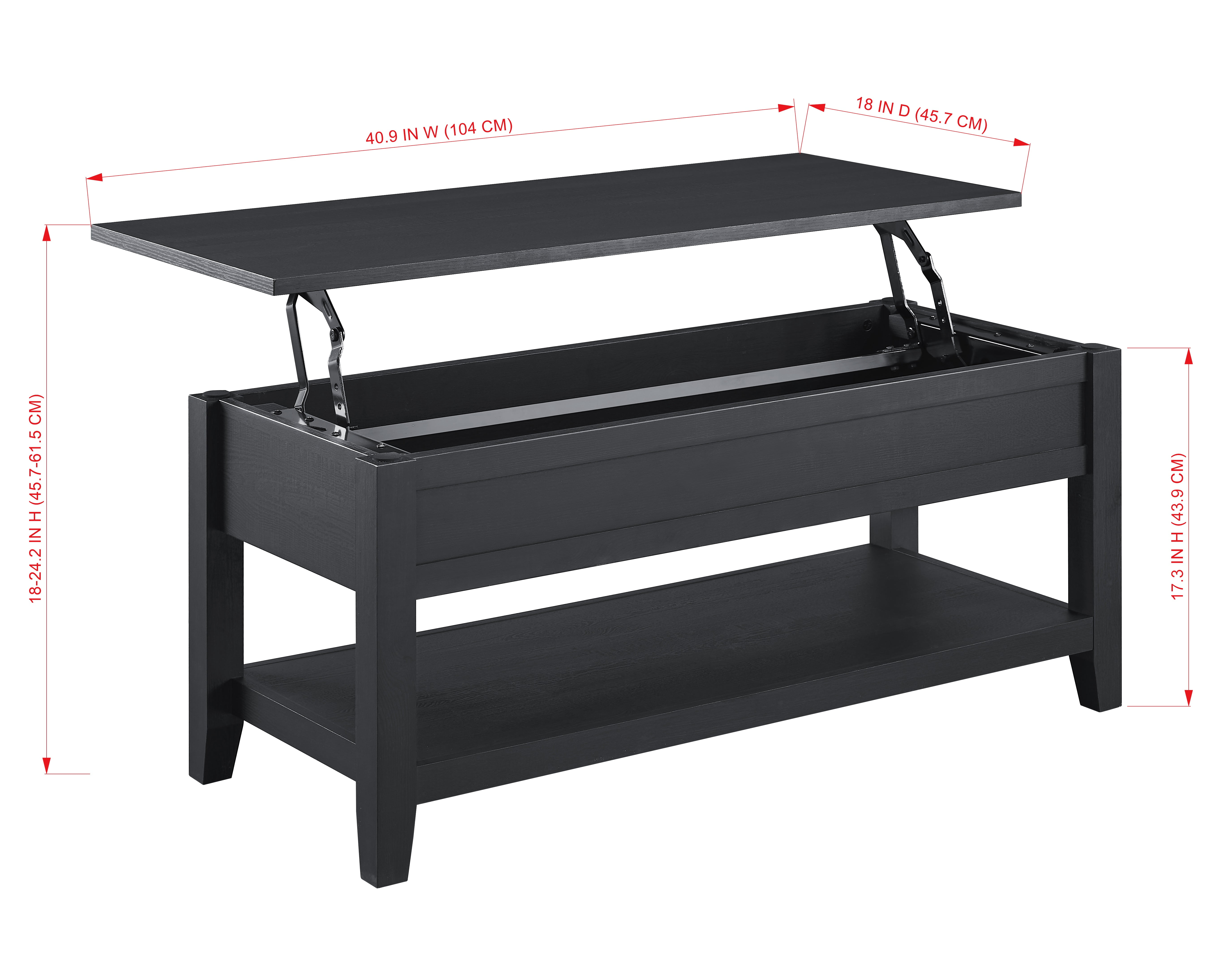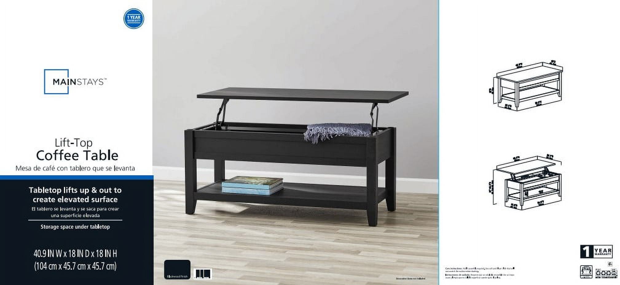 Mainstays Lift Top Coffee Table with Hidden Storage and Bottom Shelf, Square shape with Blackwood finish Made of high quality materials and built in a solid and durable structure, strong and sturdy for your everday use. Finish with Blackwood color Made of Engineered Wood with water-resistant powder coating, Iron and Hardware material Weight capacity: 22Kg/50lb N.W.: 24Kg/52.9lb G.W.: 29.3Kg/64.6lb Assemble Dimension: 40.9″W*18″D*18″H/104W*45.7D*45.7cmH Packaging Dimension: 45.1″W*20.8″D*7.9″H/114.5W*52.8D*20cmH Easy to assemble: All necessary hardware and instructions included