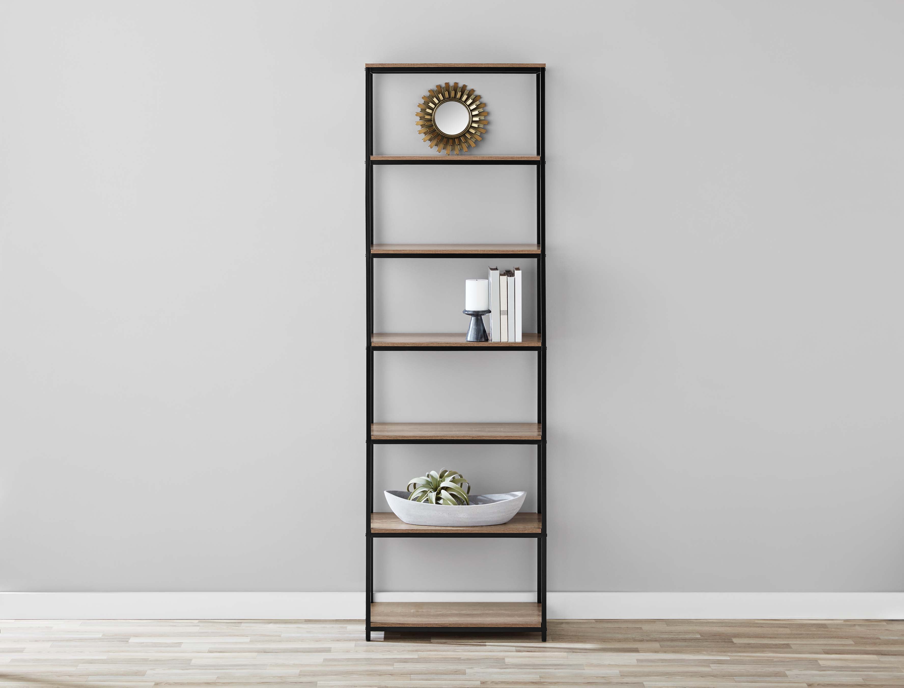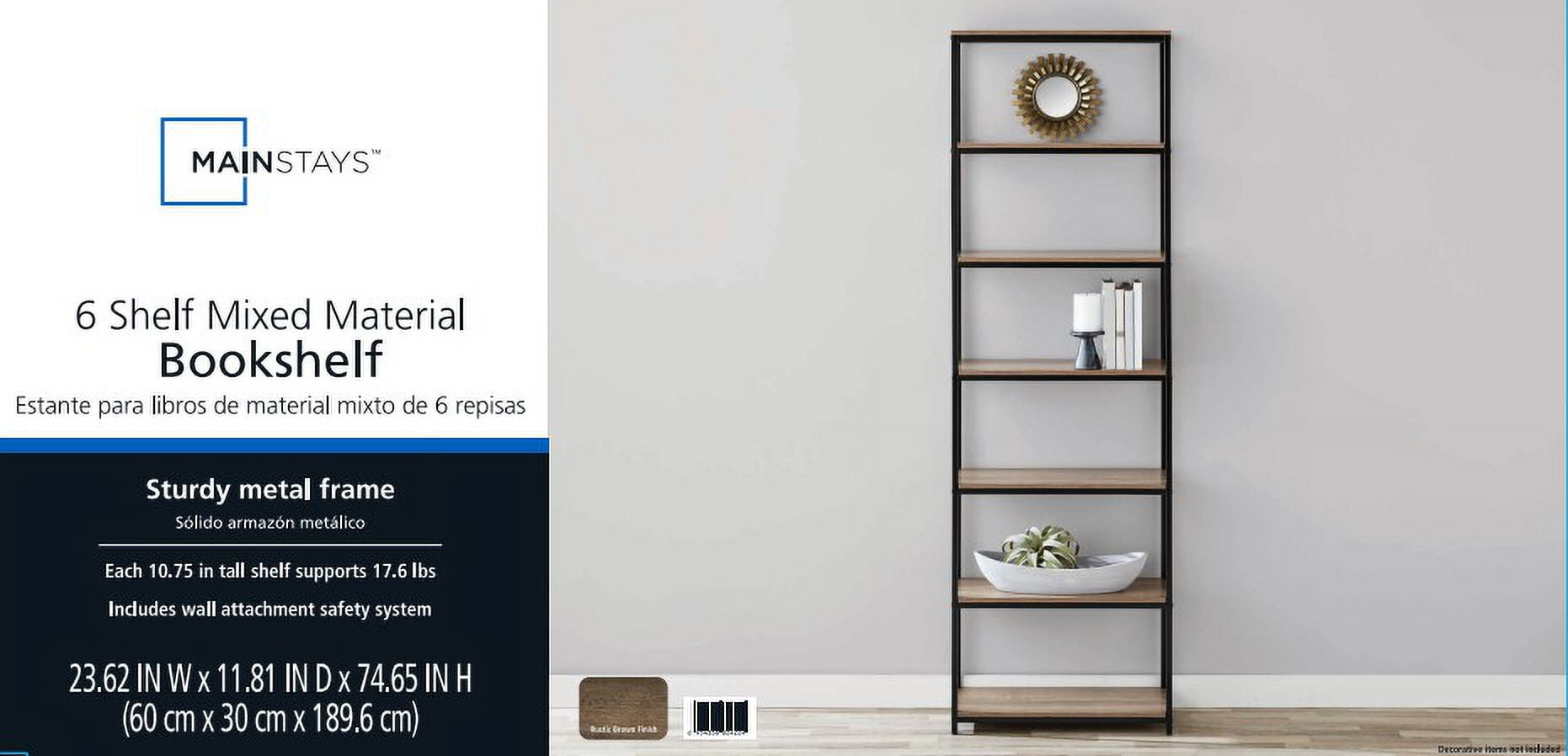 Mainstays 6-Shelf Metal Frame Bookcase, Rustic Brown Features six open shelves, providing ample storage and display areas for books, collectibles, photography, artwork and more Rich, rustic brown shelves and black metal frame for a distinctive, mixed materials look Open design allows for versatile placement almost anywhere in your home or apartment Classic look complements a variety of styles and decor Shelf height: 10.75″ Sturdy metal frame can support up to 17.6 lbs on each shelf; top panel not recommended for storage Dimensions: 23.62″ W x 11.81″ D x 74.65″ H Weight: 37.4 lbs Materials: 59% particle board, 41% iron Includes wall attachment system for safety Easy to assemble with included instructions and video assembly guide Tools required: hammer, Phillips head screwdriver Package dimensions: 42.28″ x 7.2″ x 14.65″ Package weight: 43.69 lbs