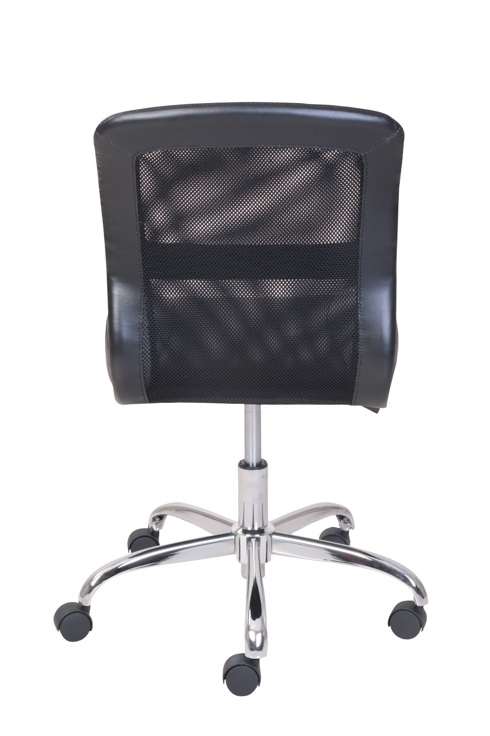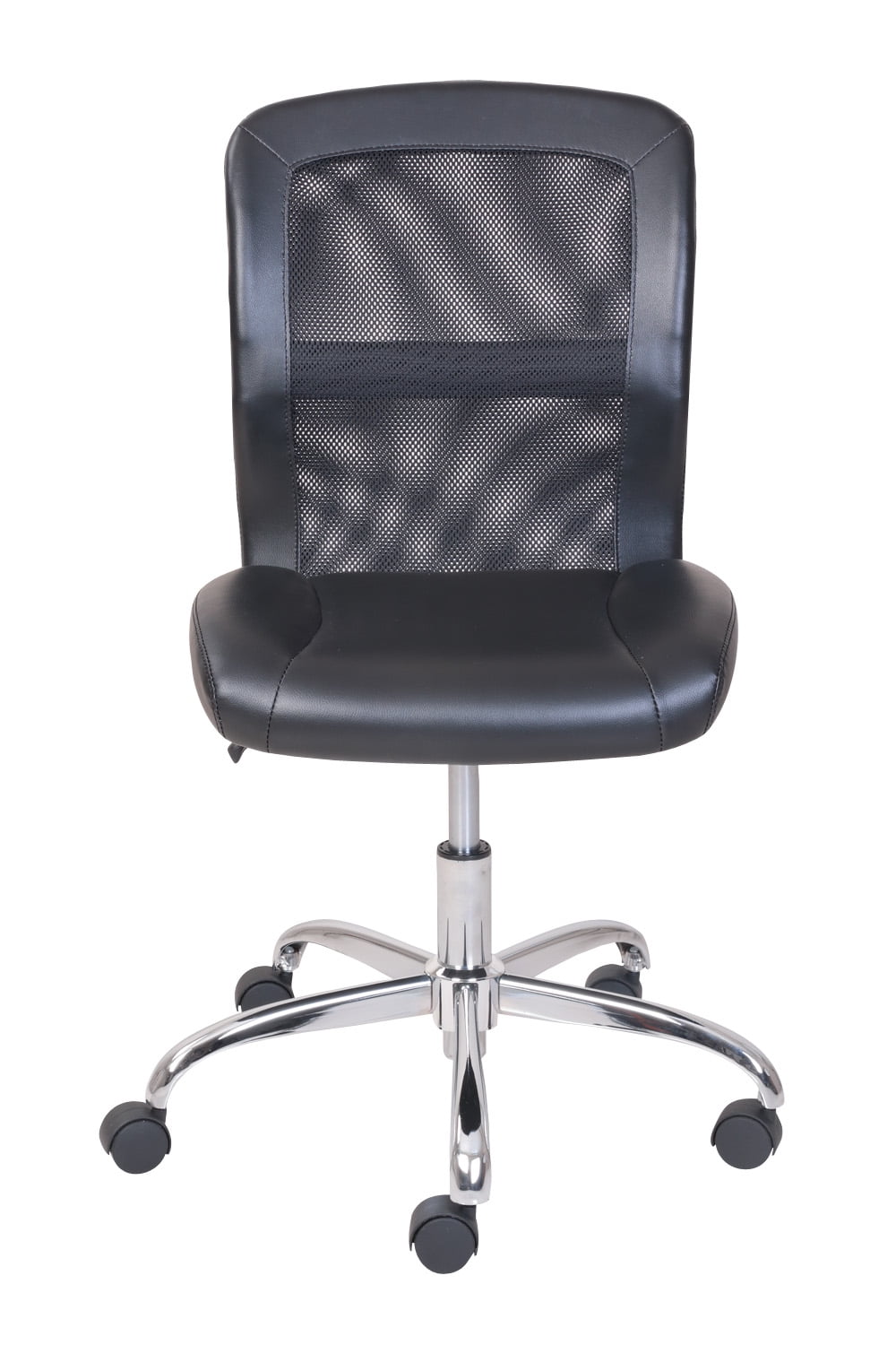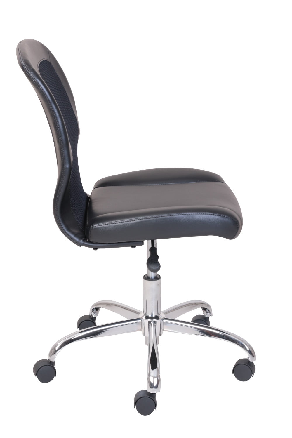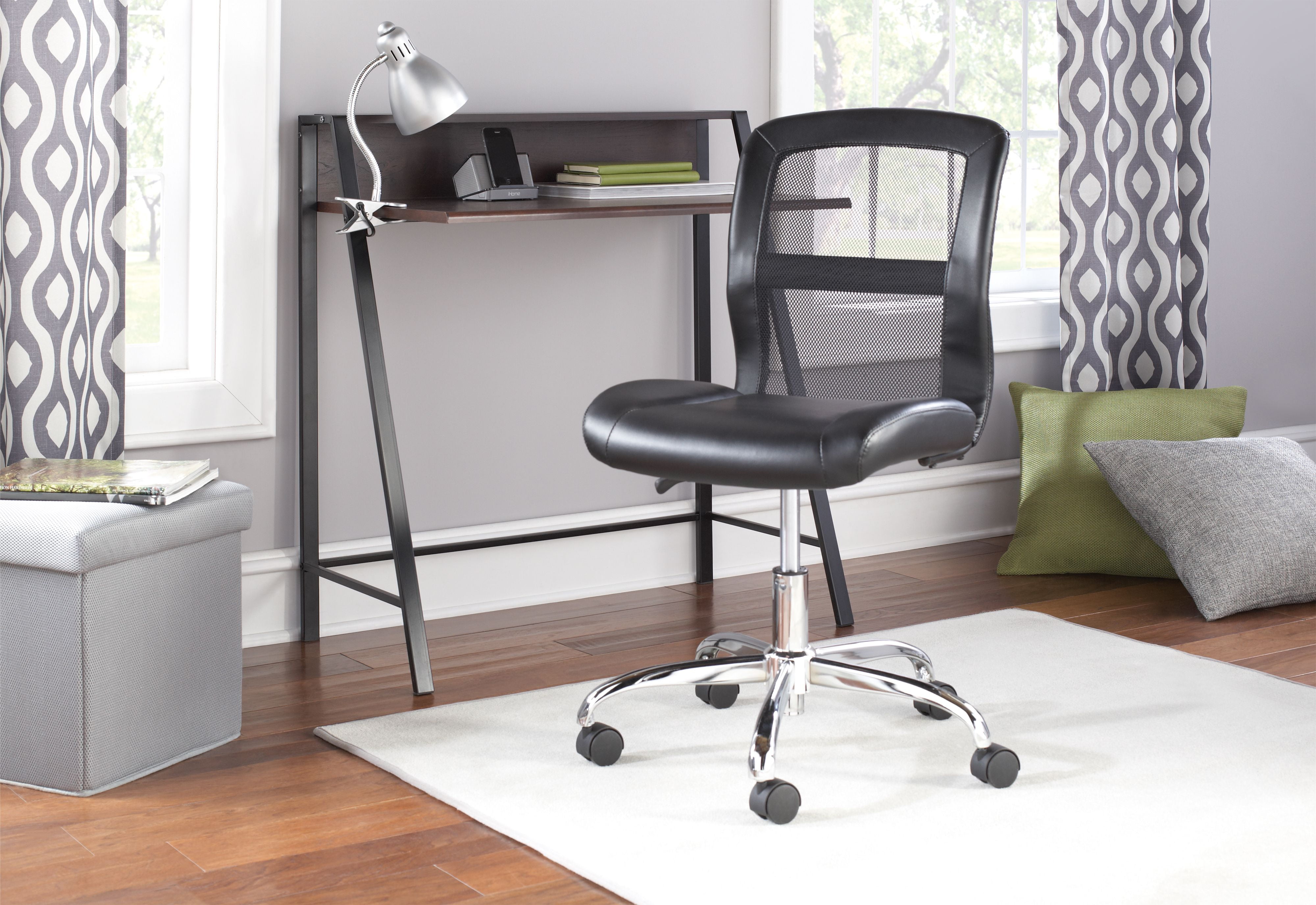 This contemporary vinyl and mesh Mainstays Office Chair is ideal for any home or office. The generously padded back and seat provide extra comfort, and the durable metal base provides additional stability, while the easy rolling casters allow smooth rolling and swivel movement in this deluxe seating for your office or study space. It is ideal for computer desks or gaming tables and the 1-touch pneumatic height adjustment allows for different desk and table heights. This sturdy chair supports up to 250 pounds and is covered by a 1-year warranty. It is available in multiple colors to coordinate with most any interior decor or furniture style. It can be used in your adult office, study area, den or as extra seating in most any room in your home. From executive to student to professional gamer, everyone will love this sleek and modern Mainstays Office Chair that combines the best of comfort and function.