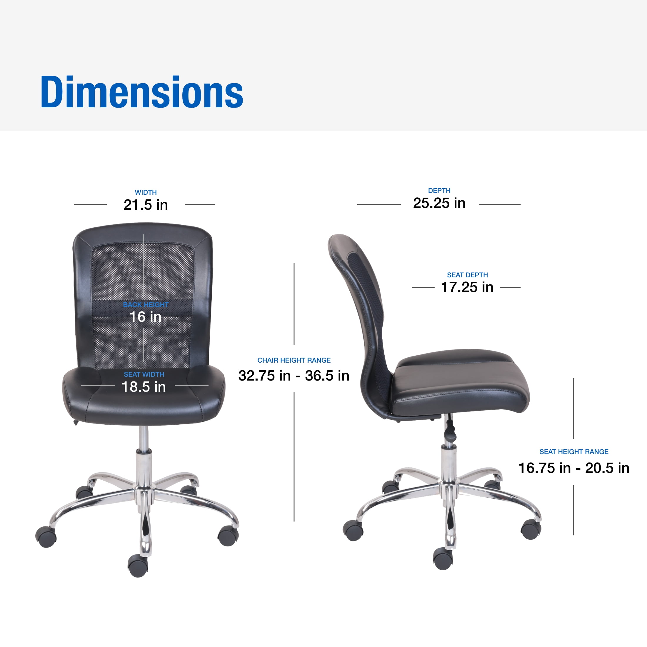 Mainstays Mesh 16.75 in Task Chair with Swivel, 250 lbs, Black: Sleek and modern chair is ideal for computer desks and adult gaming tables Generously padded back and seat makes this chair extremely comfortable Features easy rolling caster wheels for smooth rolling and swivel movement Durable metal base with 1-touch pneumatic height adjustment 1-year warranty Supports up to 250 lbs 3D interactive assembly guide available through free BILT app (Download from the app store or Google Play) Dimensions: 18-1/2″W x 23″D x 32-3/4″-36-1/2″H Product Weight: 17.64 lb (8 kg) Packaging Dimensions: 22.5″L X 9″W X 23.75″H Packaging Weight: 21.54 lb (9.77 kg) Model #s: MS55-018-039-23. 47077, 47078, 47468