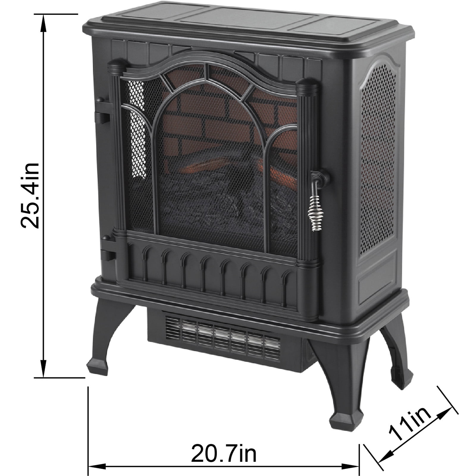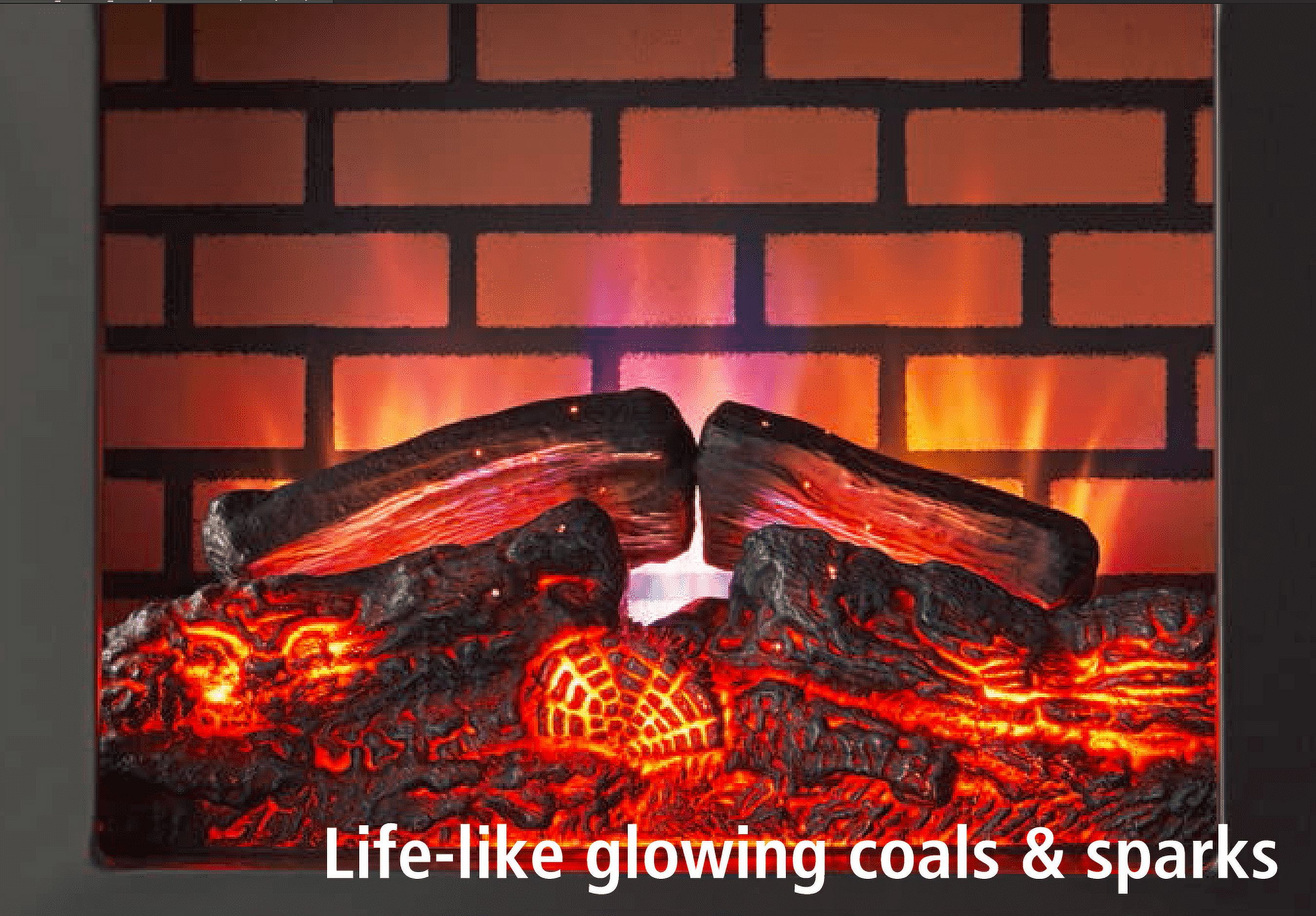 Life-like glowing coals & sparks Overheat protection 2 Heat settings Adjustable flame brightness Flame effect with or without heat Adjustable thermostat Durable metal construction Functional screen door Easy to assemble, no tools required Cool touch exterior Product dimensions: 20.7 in x 25.4 in x 11 in Product weight: 18 lbs