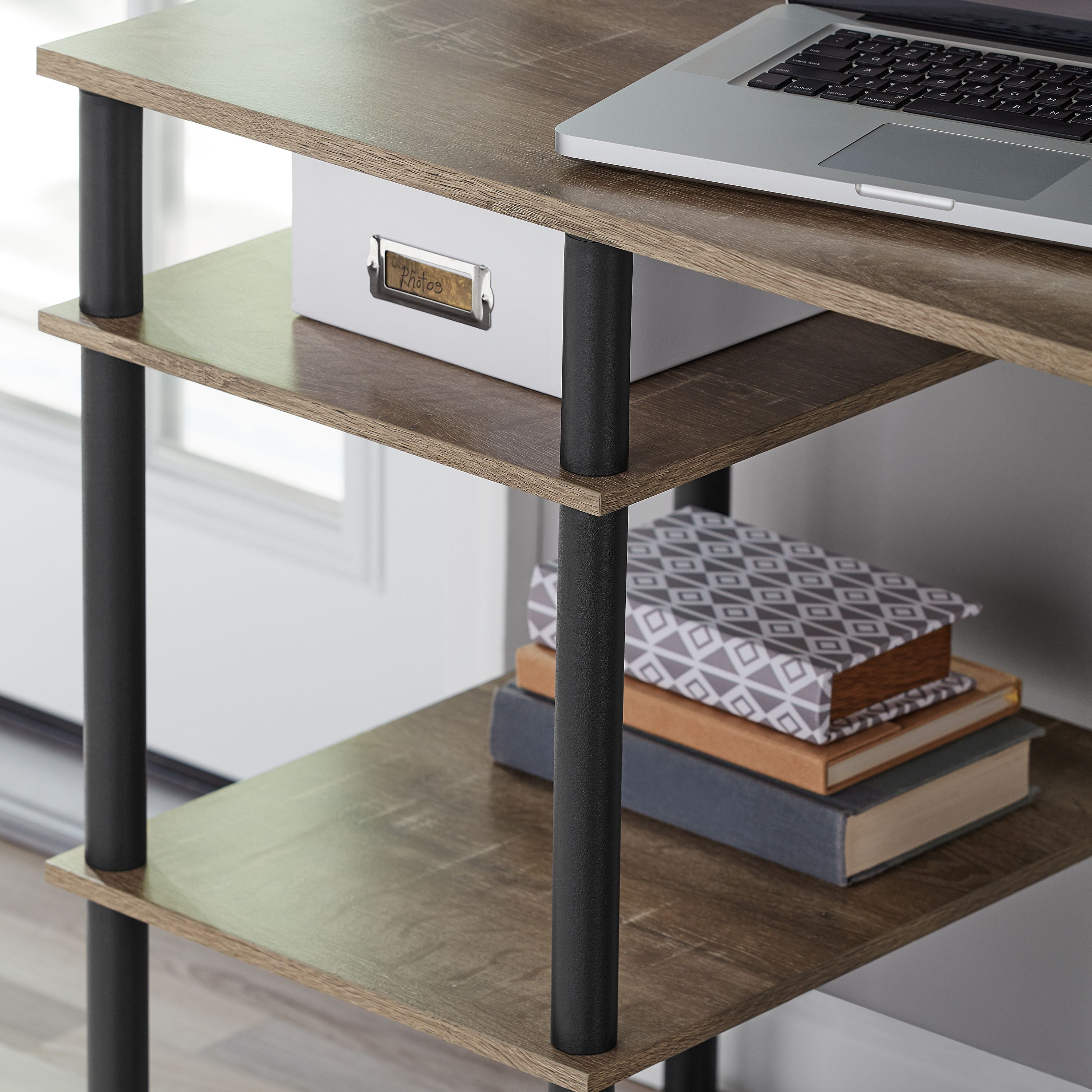 Assembling the Mainstays No Tools Computer Desk could not be easier. This desk is ready for business with its simple screw-in dowel and panel construction design. Crafted with a rustic brown finish, the desk provides six shelves capable of supporting up to 15 pounds each while the top work surface can support up to 22 pounds of work supplies, computer equipment, lighting, and more. Lightweight enough to move easily wherever it may be needed, this has a small footprint and an open design enabling it to be placed in a variety of areas in home offices, dens, living rooms, family rooms, guest rooms, and more.