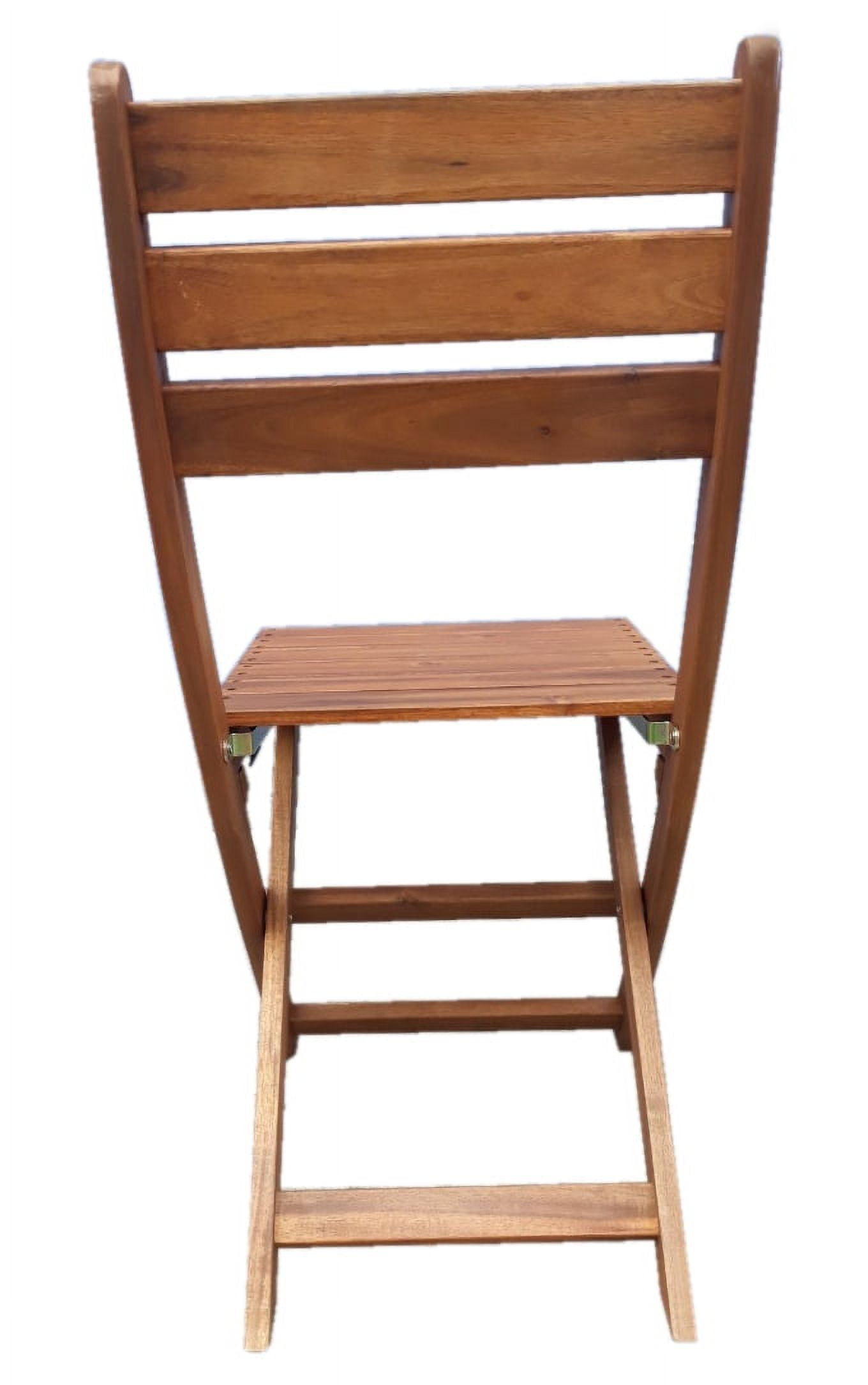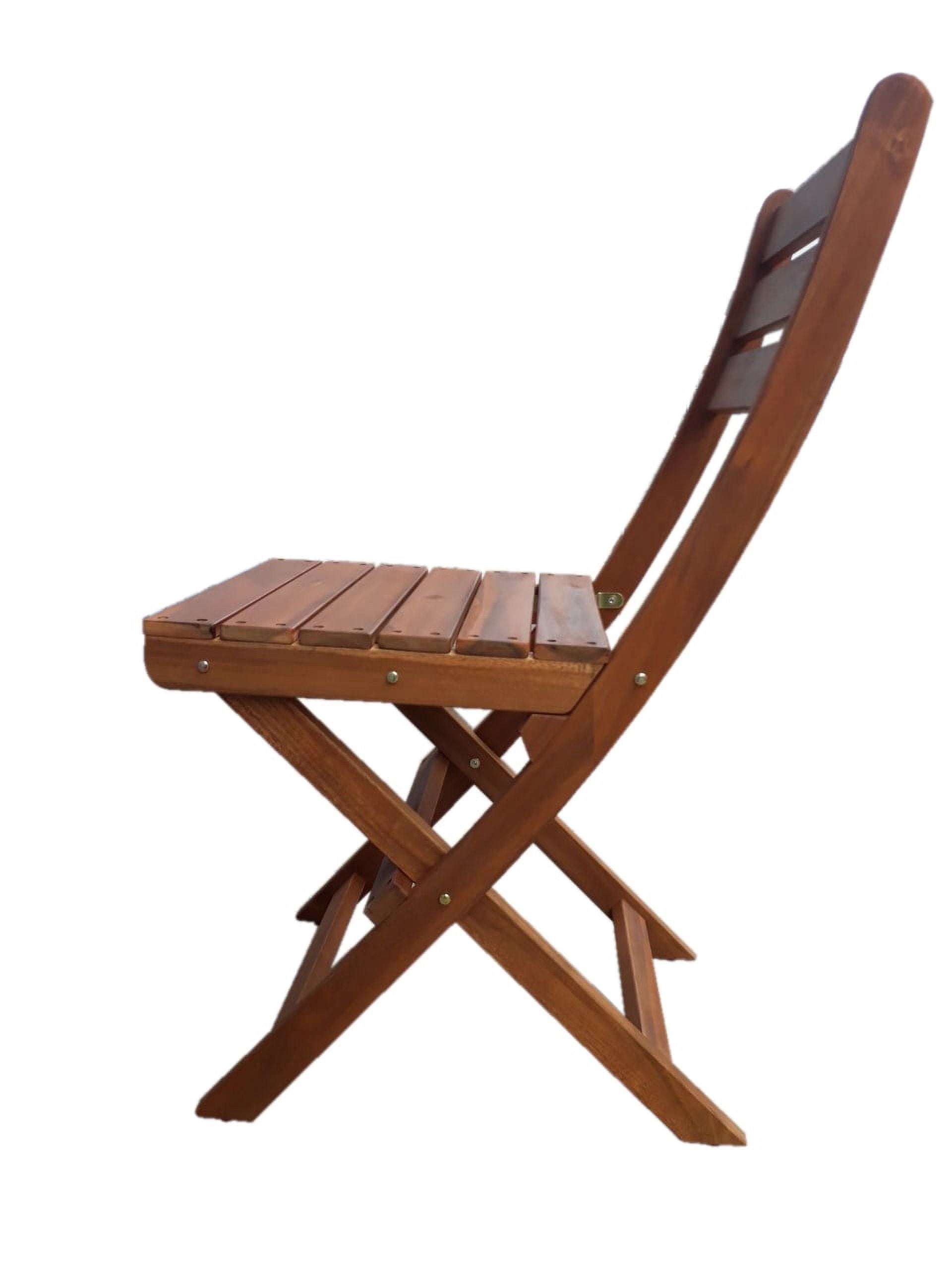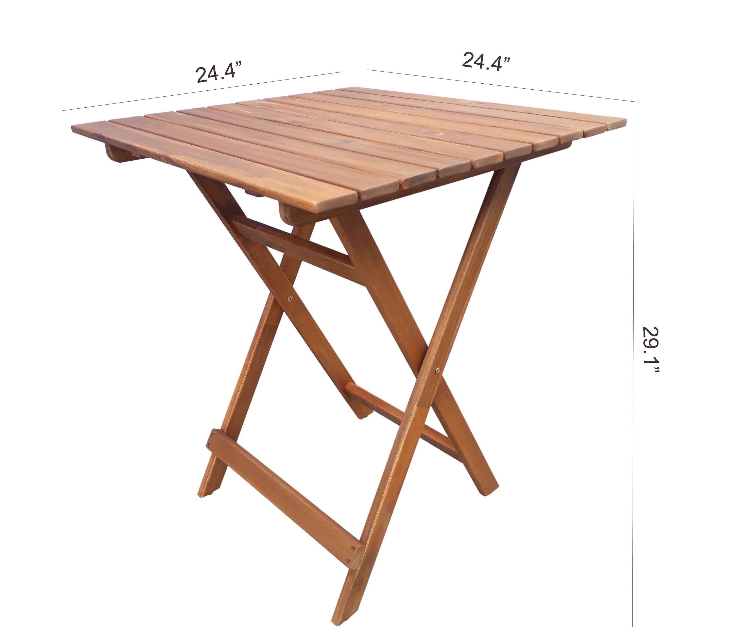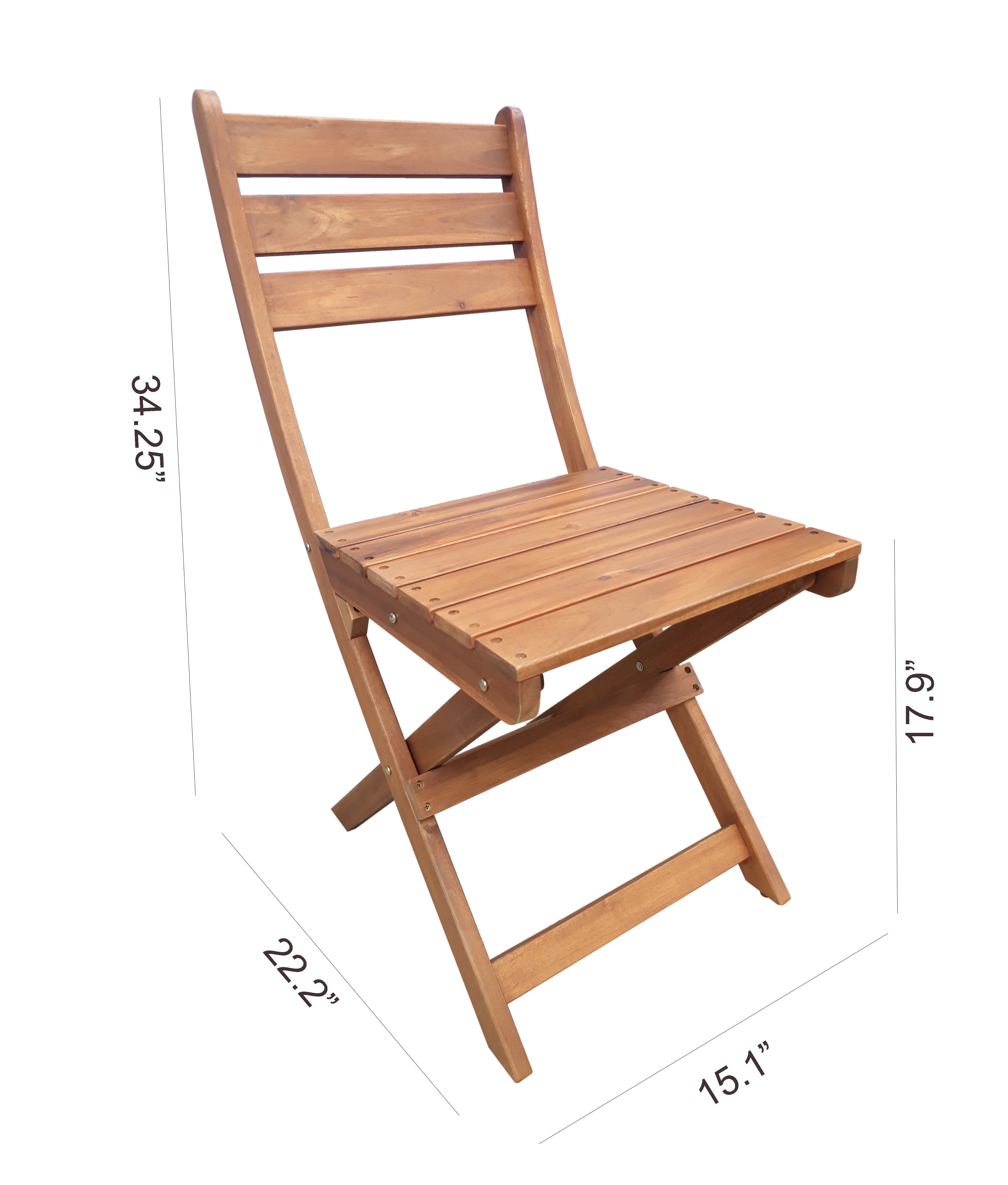 Table dimension: 24.4 in (D) x 29.1 in (H) Chair dimension: 15.1 in (W) x 22.2 in (D) x 34.25 in (H), with a 250lb-weight capacity Table and Chairs fold flat for easy storage and portability No Assembly required FSC certified solid Acacia hardwood, with weather resistant finishes Ideal for use in covered outdoor areas such as porches, patios, balconies, or indoor If used in an unprotected area, constant exposure to the elements will accelerate the weathering process Tested and in compliance with CPSC requirement for lead content 1 Year limited frame warranty