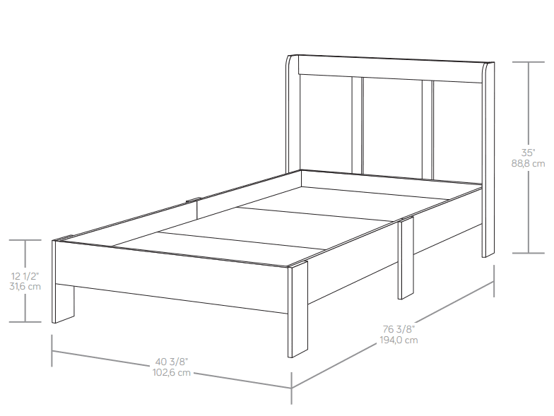Assembled Dimensions: 76.38″ L x 41.02″ W x 33.31″ H Fits most twin size mattresses Integrated headboard Cobblestone finish Model #: 420455 Box Dimensions: 46.63″ L x 27.5″ W x 4.25″ H For additional questions or any issues, please contact the manufacturer at 1-800-523-3987. Be sure to check out the Mainstays Parklane collection for more great items!