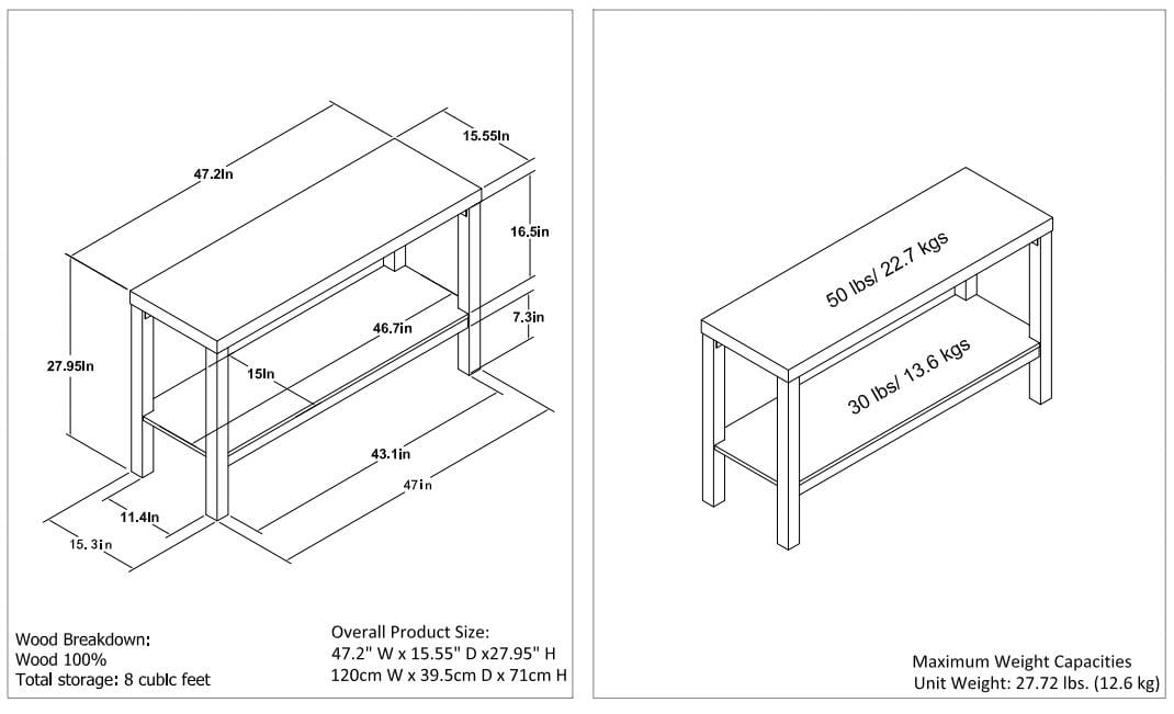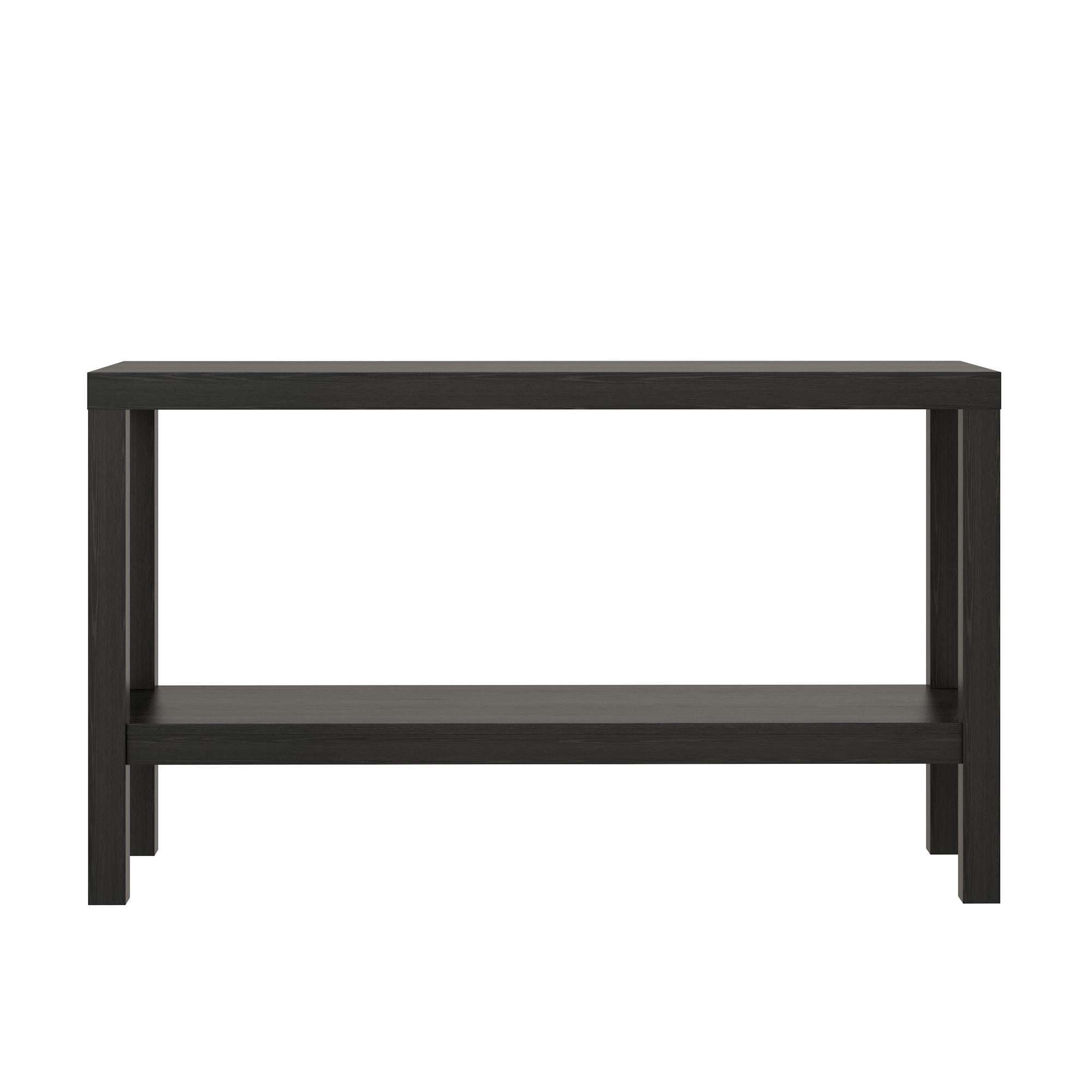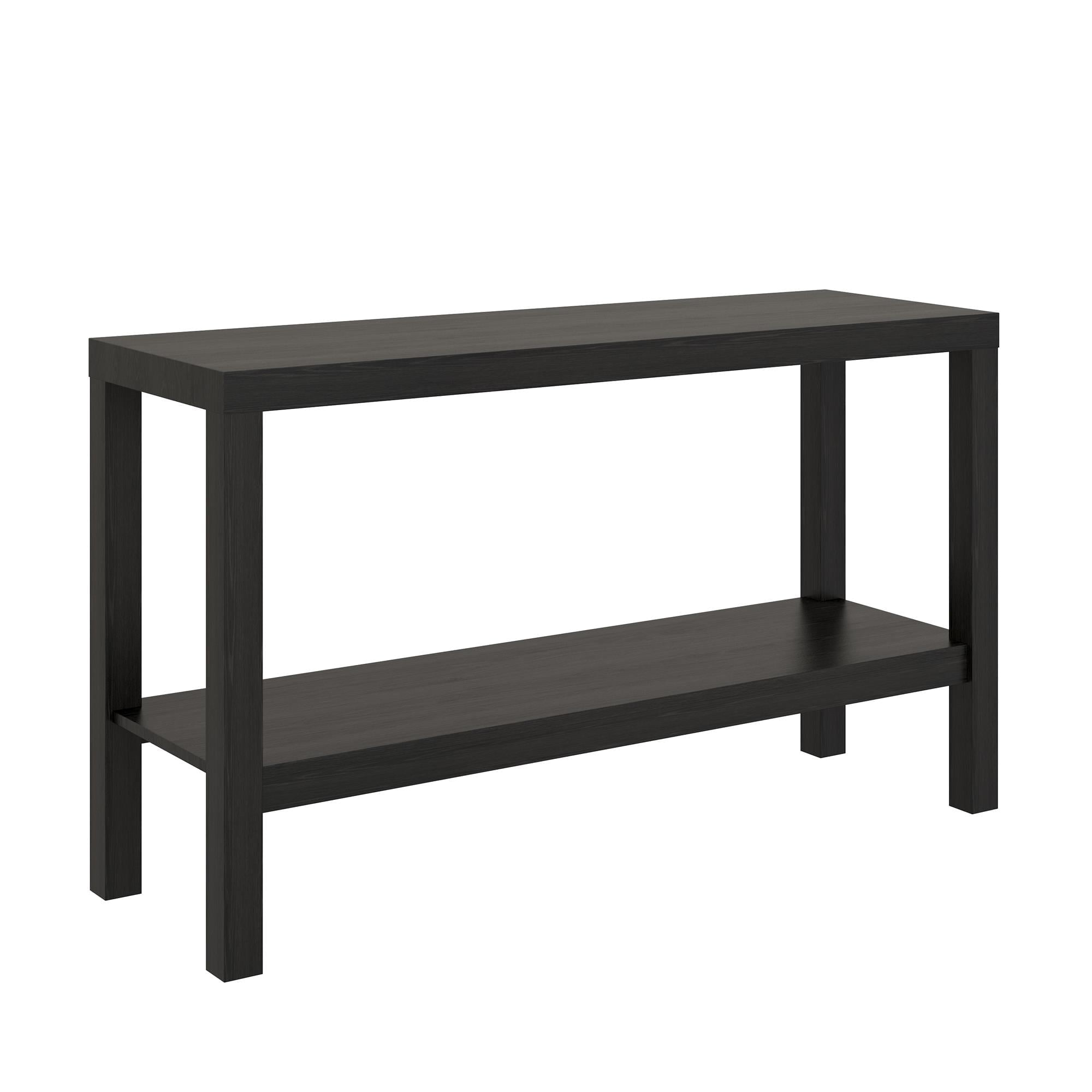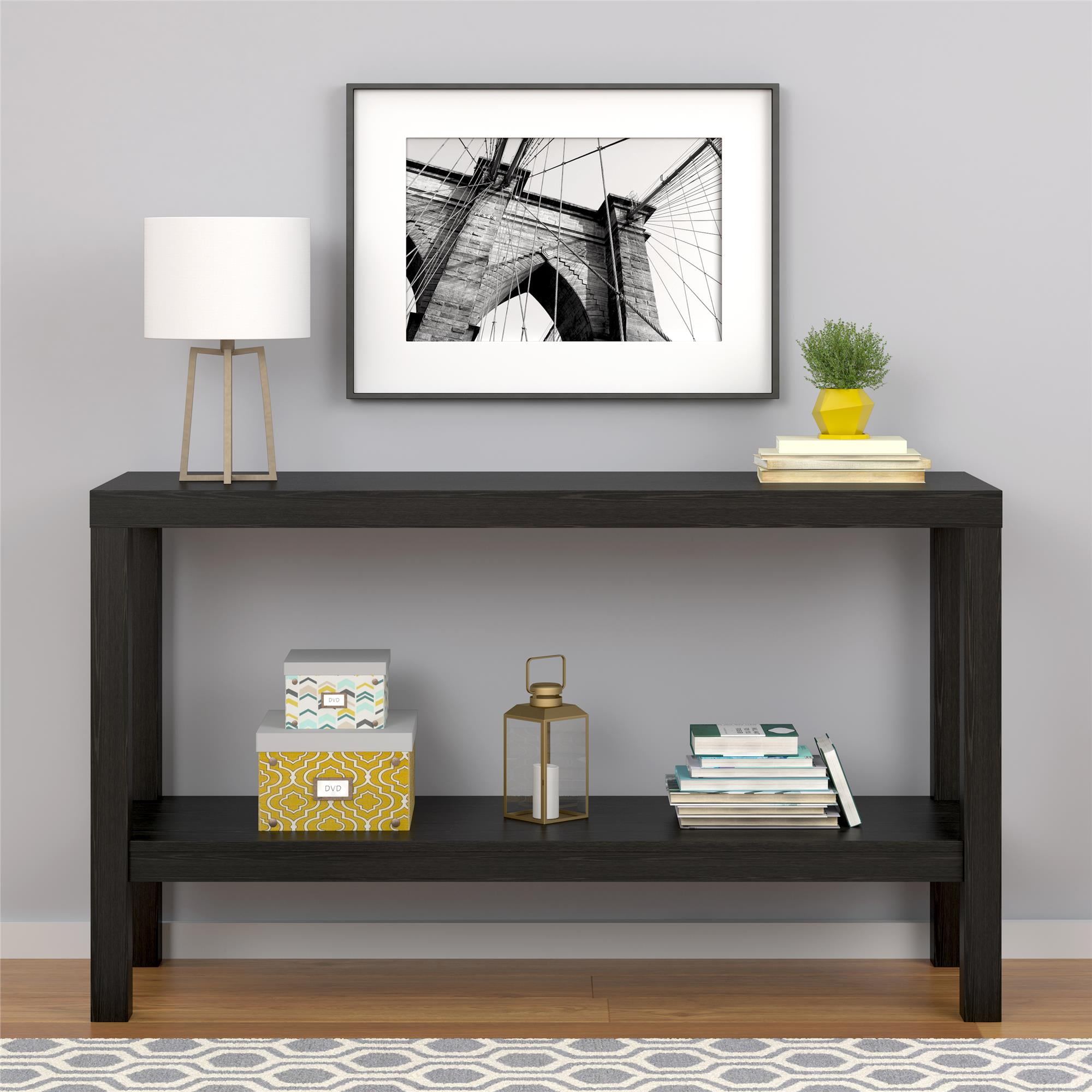 Use as an entry table or sofa table Open storage options True Black Oak finish The decorative Mainstays Parsons Console Table fit perfectly into your home with its diverse use of an entryway table or sofa table Console Table combines sturdy hollow core and a black laminated finish together for a sleek design that will fit into your personal style The open storage of the top and bottom shelf make it easy to keep your on-the-go accessories like a purse, wallet or keys readily available or use shelves to decorate with flowers, vases, books and collectibles Each Console Table ships flat to your door and needs to be assembled upon opening. Top shelf holds up to 50 lbs. and the bottom shelf holds up to 30 lbs. Assembled dimensions 27.95″H x 47.2″W x 15.55″D. Two adults are recommended for proper assembly