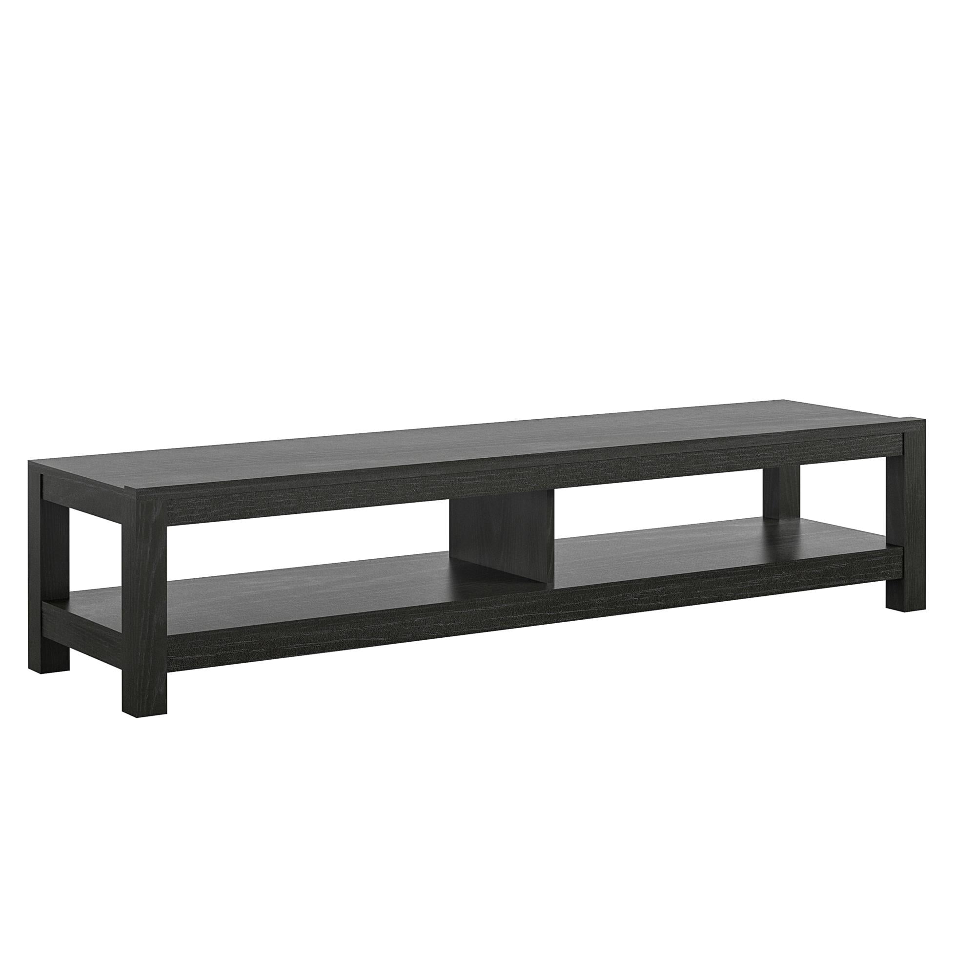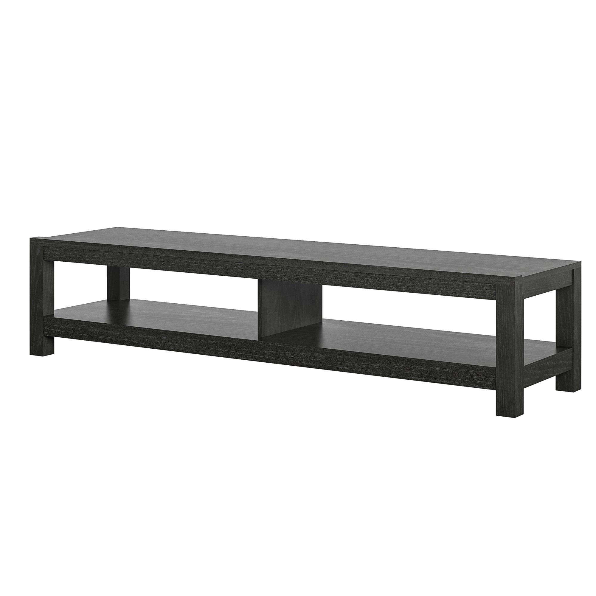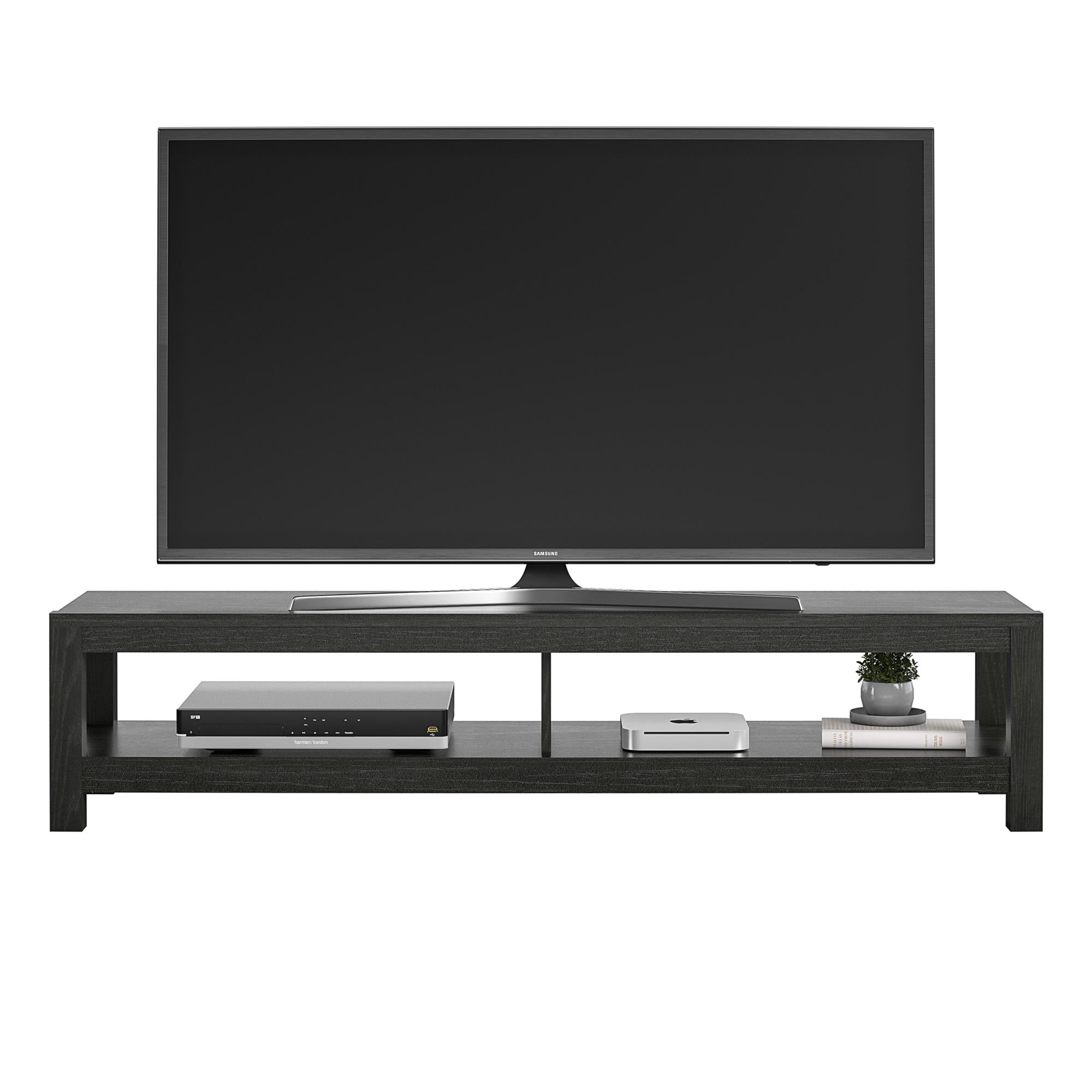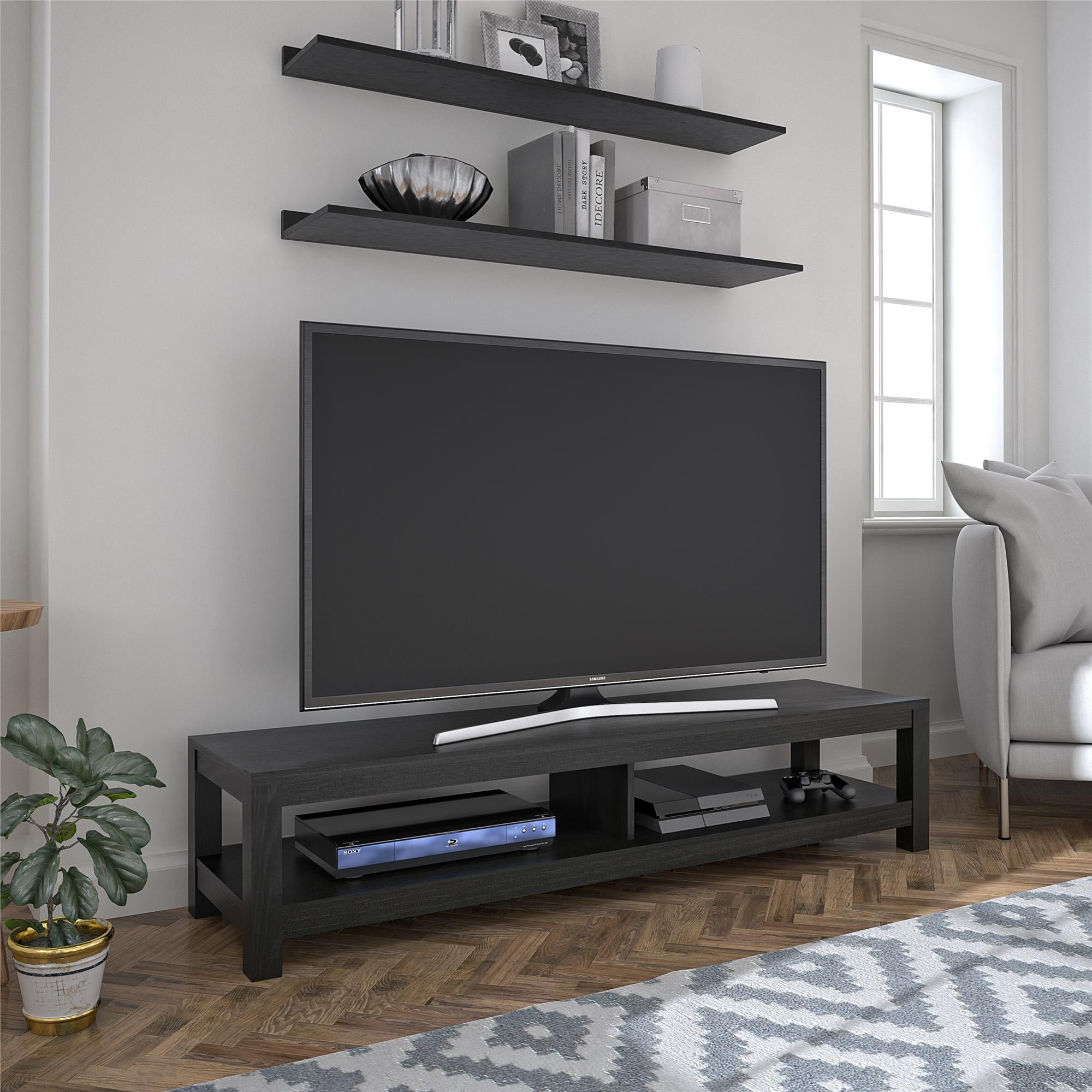 Mainstays Parsons TV Stand for TVs up to 65″, Black Oak The low profile of the Mainstays Easy Assembly TV Stand is perfect for small spaces Made of laminated hollow core and particleboard, the black oak woodgrain finish pairs with any style and décor Large open shelf can organize all of your video components such as a DVD player, cable box, and audio equipment. The open concept allows proper air flow and gives easy access to outlets Coordinate your space with other items from Mainstays (each sold separately) The TV Stand ships flat to your door and 2 adults are recommended to assemble. The Stand can hold a TV up to 65? wide or 120 lbs. The lower shelf can hold up to 40 lbs. Assembled dimensions: 12.4?H x 60?W x 15.8?D 1 year limited warranty is included