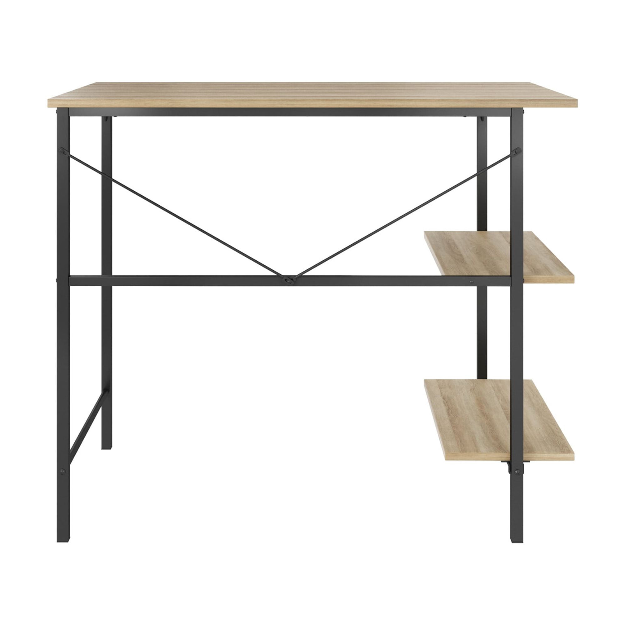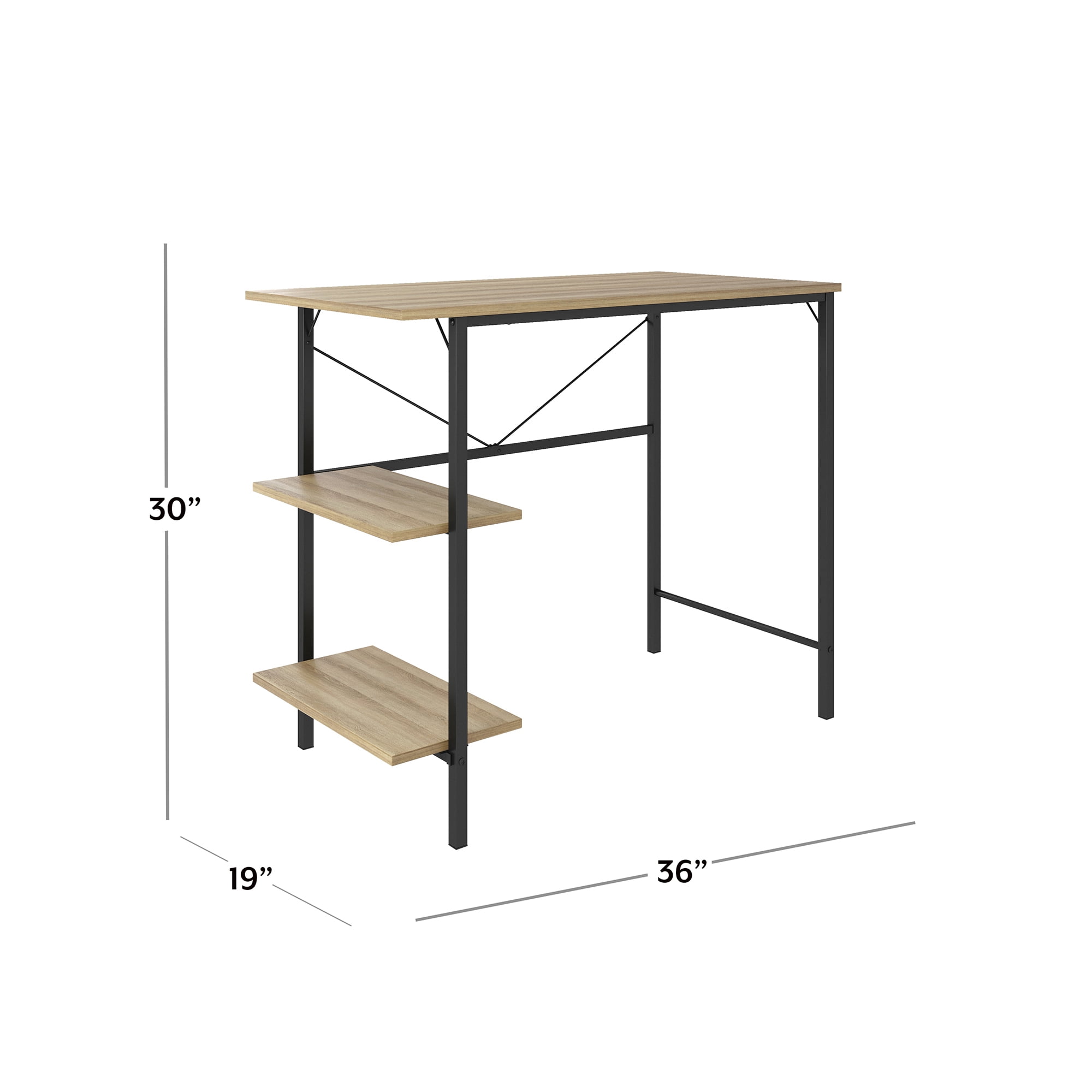 Dimensions: 35.98″ W x 18.90″ D x 30″ H This casual, compact adult desk features a wooden desktop and metal base The wooden desktop and shelving units feature a natural wood grain finish, and the metal frame is finished in black Side shelves provide extra storage to maximize space Assembly required Ships in one box Online only Residential use only