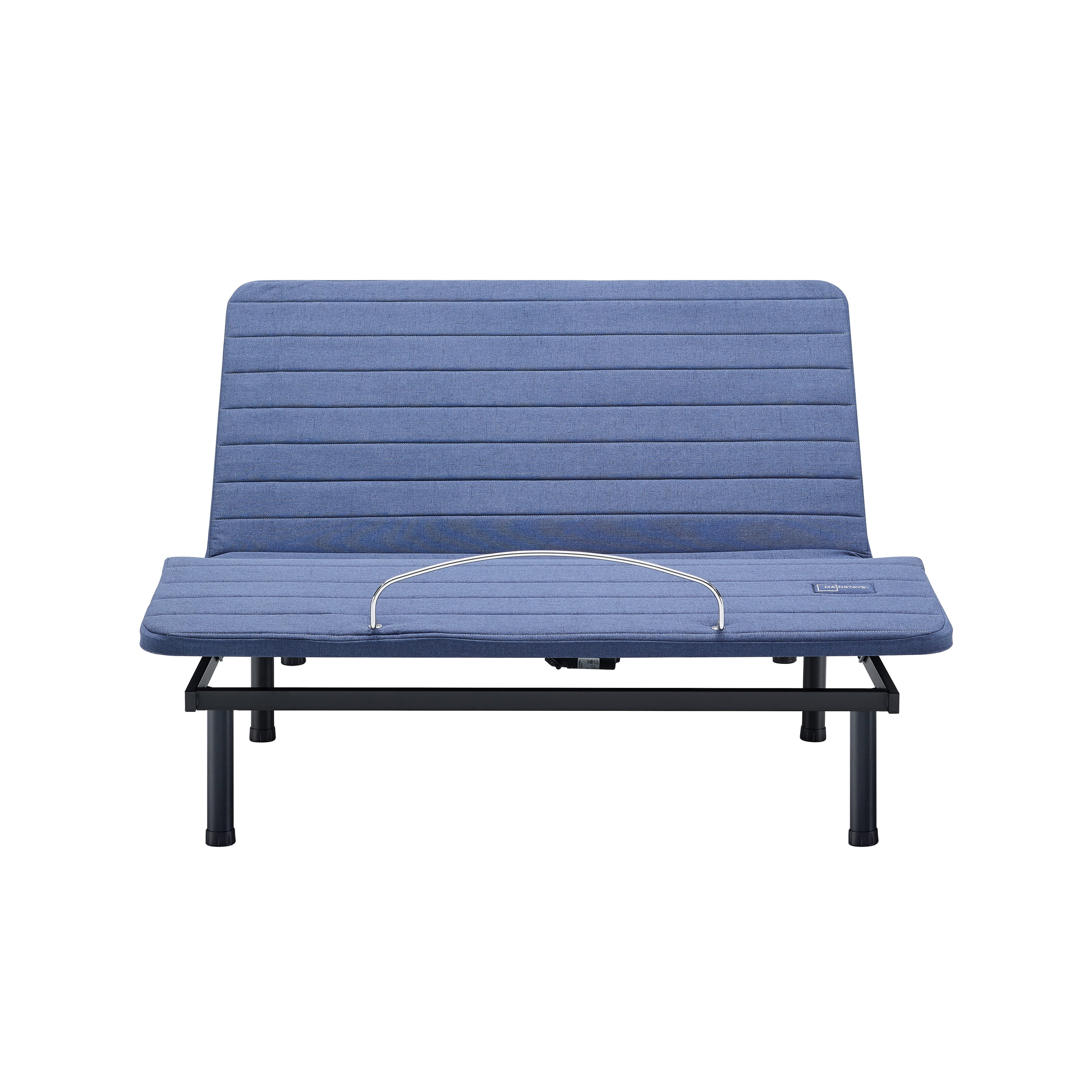 Mainstays Steel Storage Adjustable Bed Frame, Adjustable, Blue/Black: Works with any mattress. Mattress sold separately Foldable power bed frame creates the perfect position for relaxing, reading, watching TV, sleeping, and more 8-button wireless remote controls head elevation up to 70 degrees and foot elevation up to 40 degrees to improve circulation, reduce back pain, and ease stress Our remote allows you to operate head and foot controls individually or together to raise or lower frame position Converts to the flat position with the touch of one button Backlit wireless remote features a flashlight Easy Assembly Motors and cables come pre-assembled for easy no-tools set-up 6 steel legs lift the bed to 14″ high for underframe storage Quilted padded surface Features a mattress retention rail Two Twin XL Frames will make a King Size Bed, two remotes can be linked to allow one remote to control both twin beds at the same time or can have individual controls for each side of the bed Twin XL weight capacity 600 lbs. Queen weight capacity 1200 lbs. Assembled Product Dimensions: Twin XL measurements: 80″L x 39″ W x 14″ H – Weighs: 84.2 lbs. Queen measurements: 80″ L x 60″ W x 14″ H – Weighs: 110.5 lbs. Shipping Product Dimensions: Ships in one box Twin XL shipping dimensions: 39″x41″x8.7″ – Weight: 90 lbs. Queen shipping dimensions: 60″x41″x8.7″ – Weight: 120 lbs.