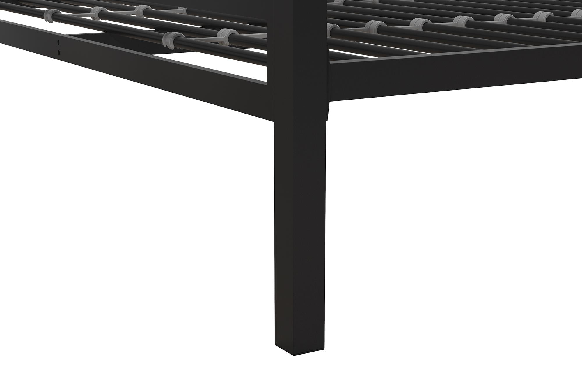 Solid and sturdy metal construction. Great for a girl and boys bedroom Easy to climb secured and angled ladder and 12.5″ high full length guard rails 22 metal slats spaced 3″ apart and a center support rail for ample mattress support Can be used with a standard twin size and full size mattress (not included) No box spring or mattress foundation required 11″ of under bed clearance for storage Available in black, gray, white, blue and pink metal Product dimensions: 78″W x 56.5″D x 63″H Ships in 1 box: 79″L x 16″W x 6″H and comes with a 1 year limited warranty Top bunk weight limit of 200 lbs, bottom bunk weight limit of 450 lbs