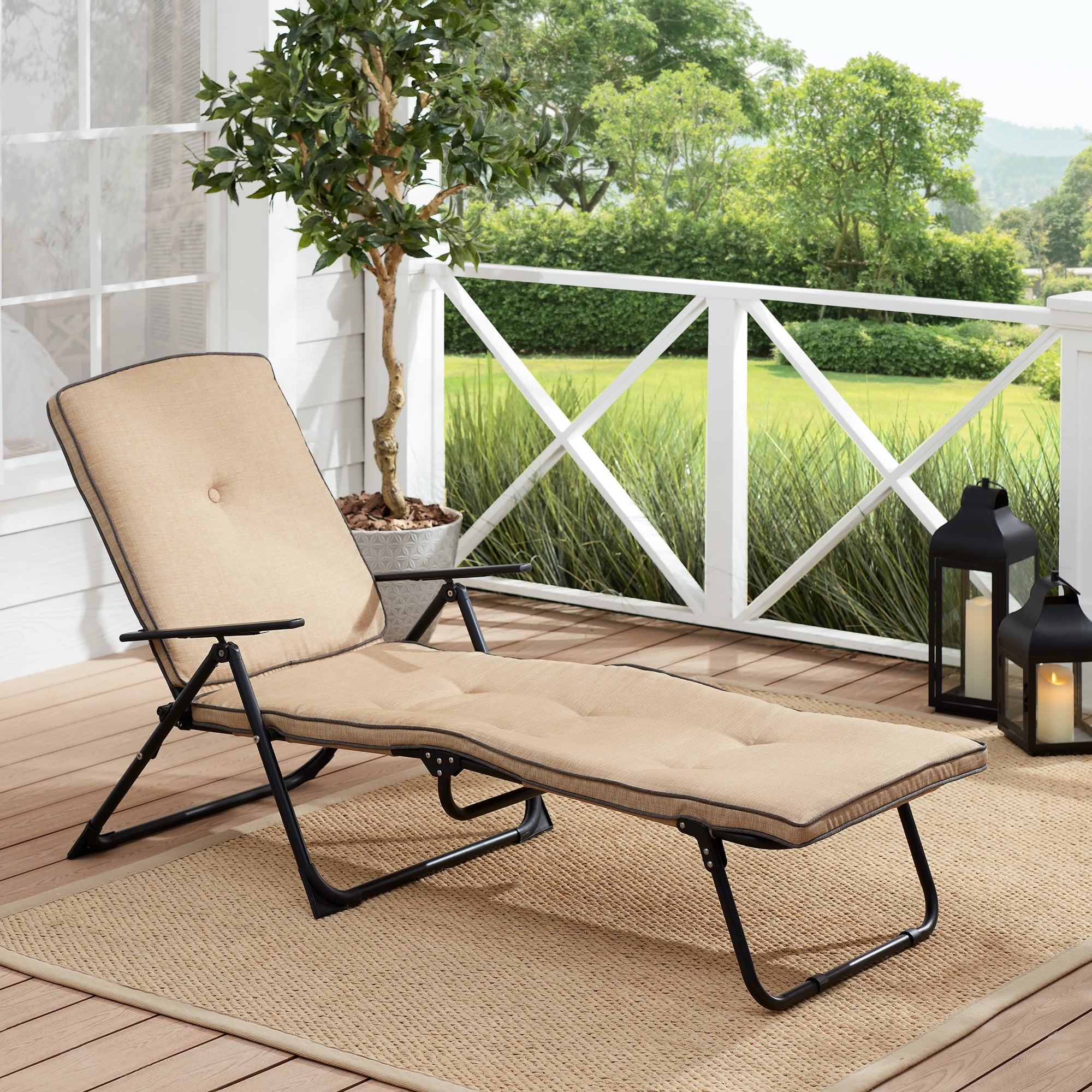 Mainstays Sand Dune Folding Padded Outdoor Chaise Lounge Comfy reclining chaise lounge Features a full-length cushion Reclines to 5 positions and lays flat Durable powder-coated steel frame for a long life Folds up for easy storage and transport 1 part of the entire Mainstays Sand Dune collection of outdoor furniture (other pieces sold separately) Easily assembled with the included instructions Chaise dimensions: 59″ x 57.1″ x 36.2″; 23.14 lbs Chaise weight capacity 250 lbs Easy to care for: simply wipe down with soapy water as needed and allow to air dry. Site to Store Pickup Note: Arrives in 1 box Shipping dimensions: 29.13″ x 9.25″ x 34.25″; 28.66 lbs This item is packaged in 1 large box that may not fit in a standard-sized vehicle. Please make sure you have a large car or truck for store pickup Imported