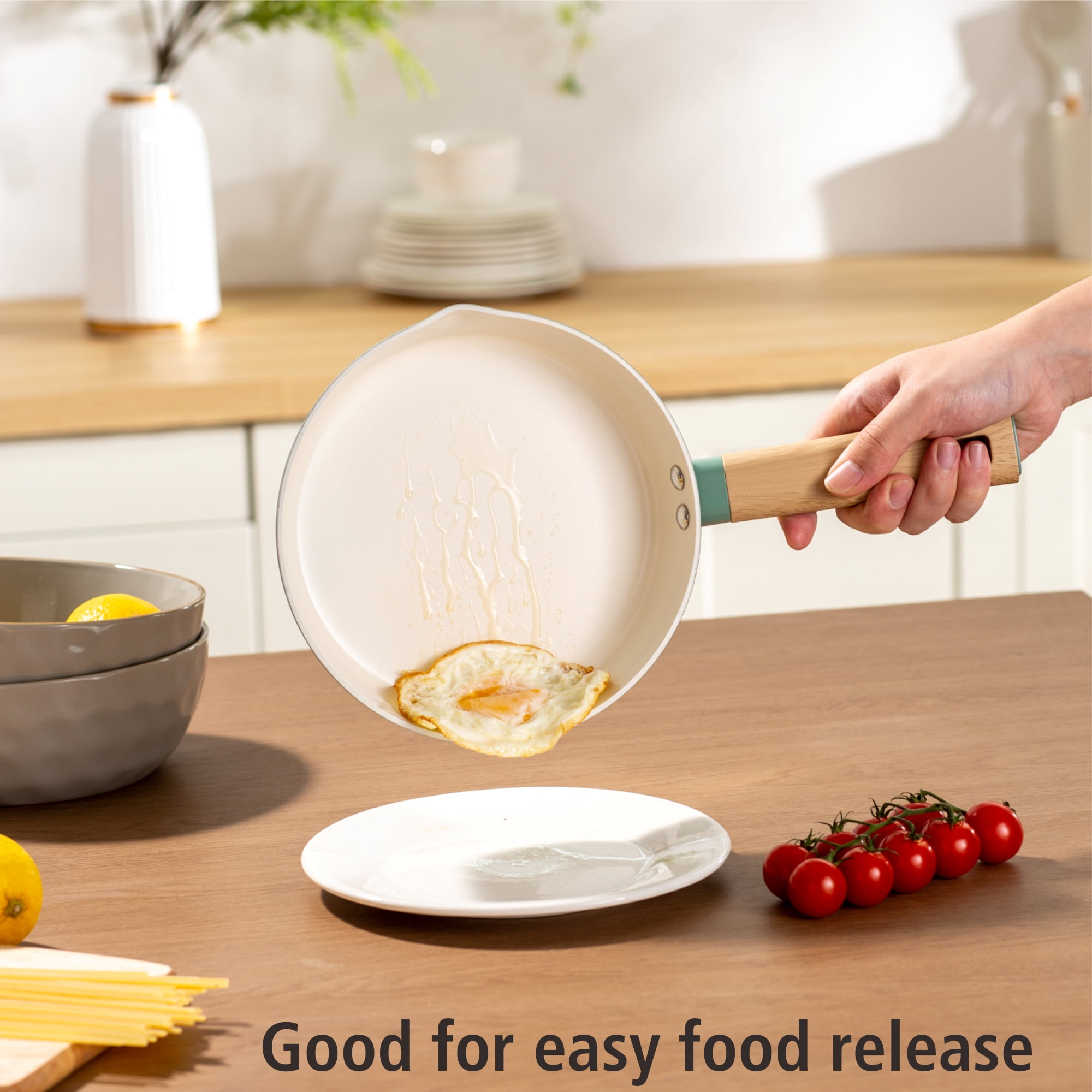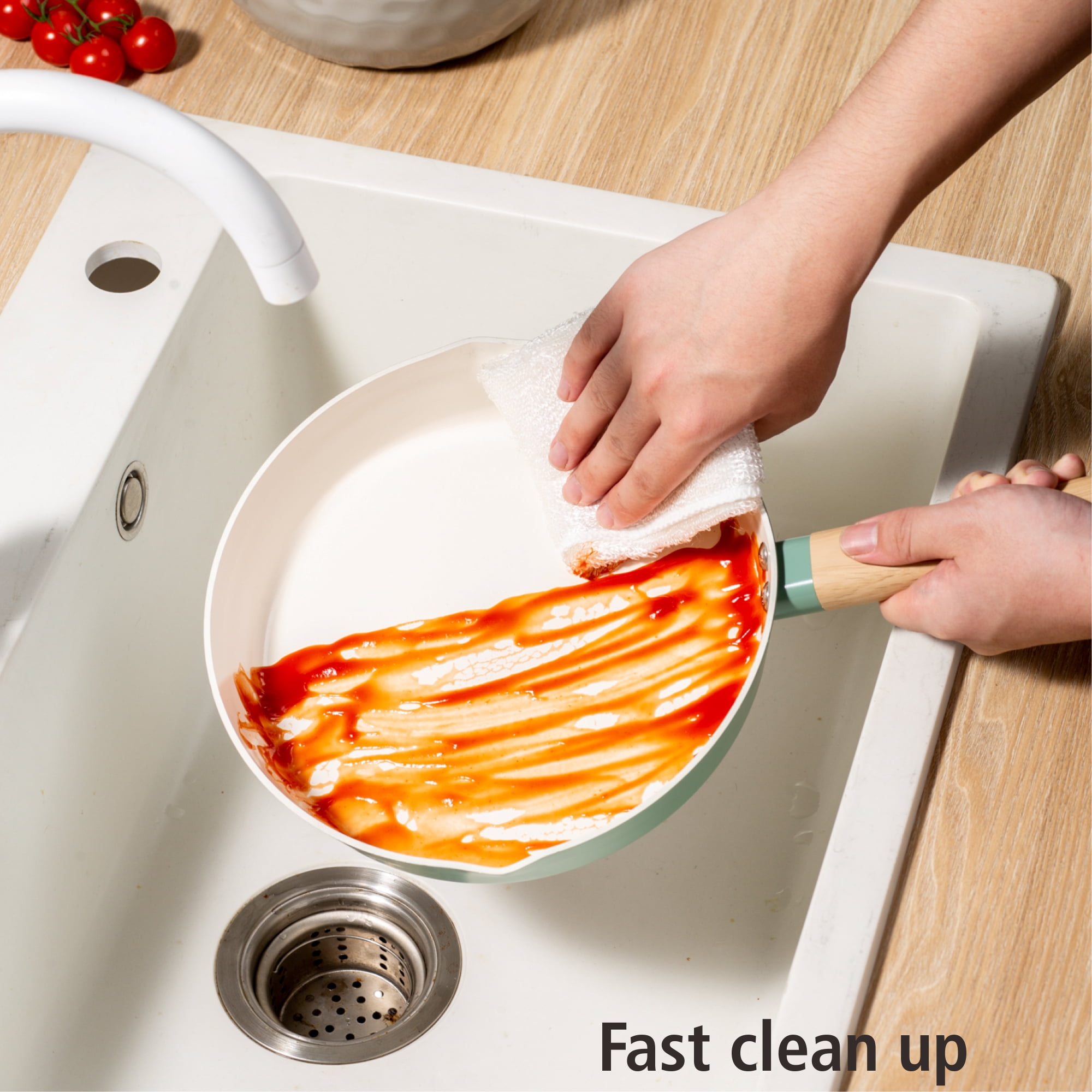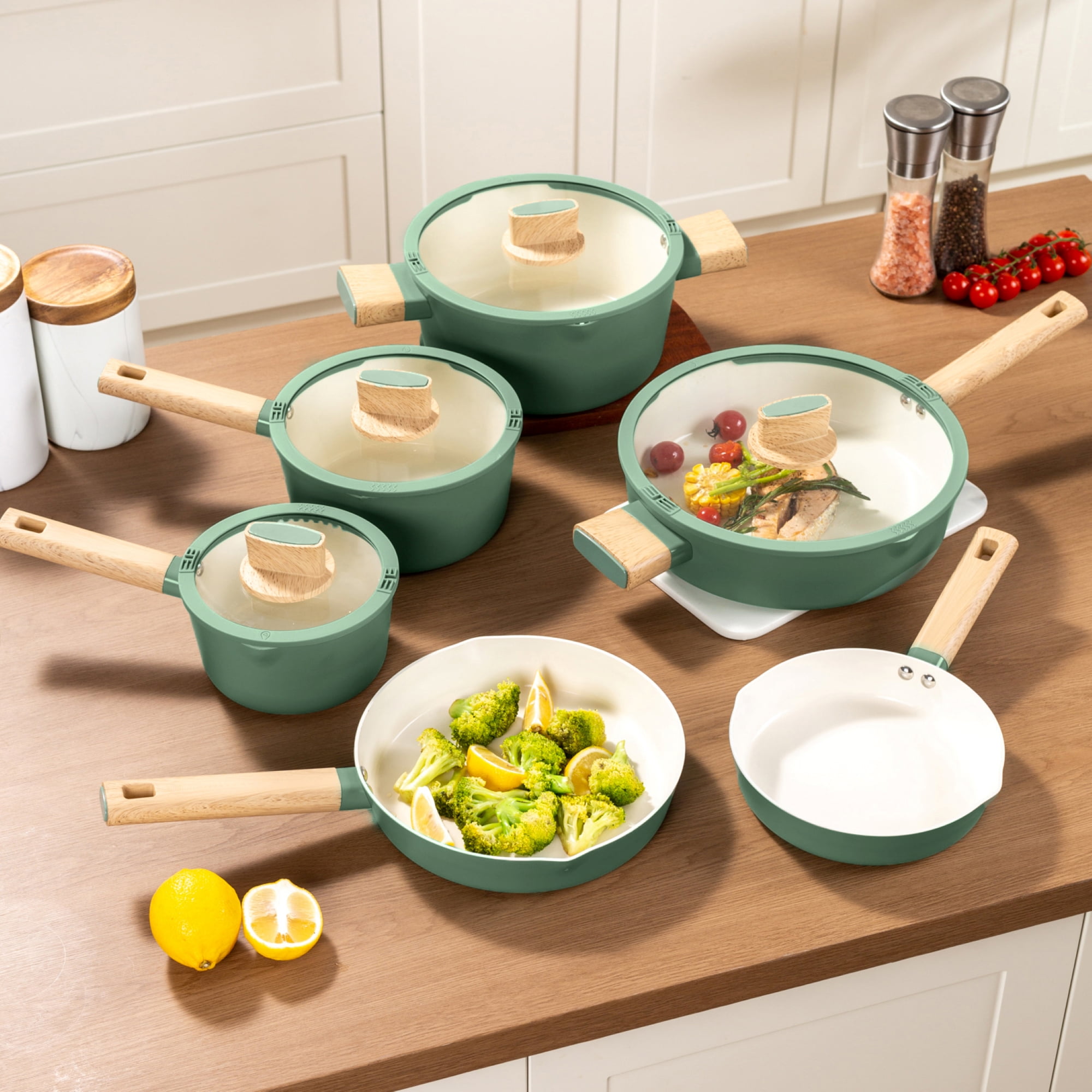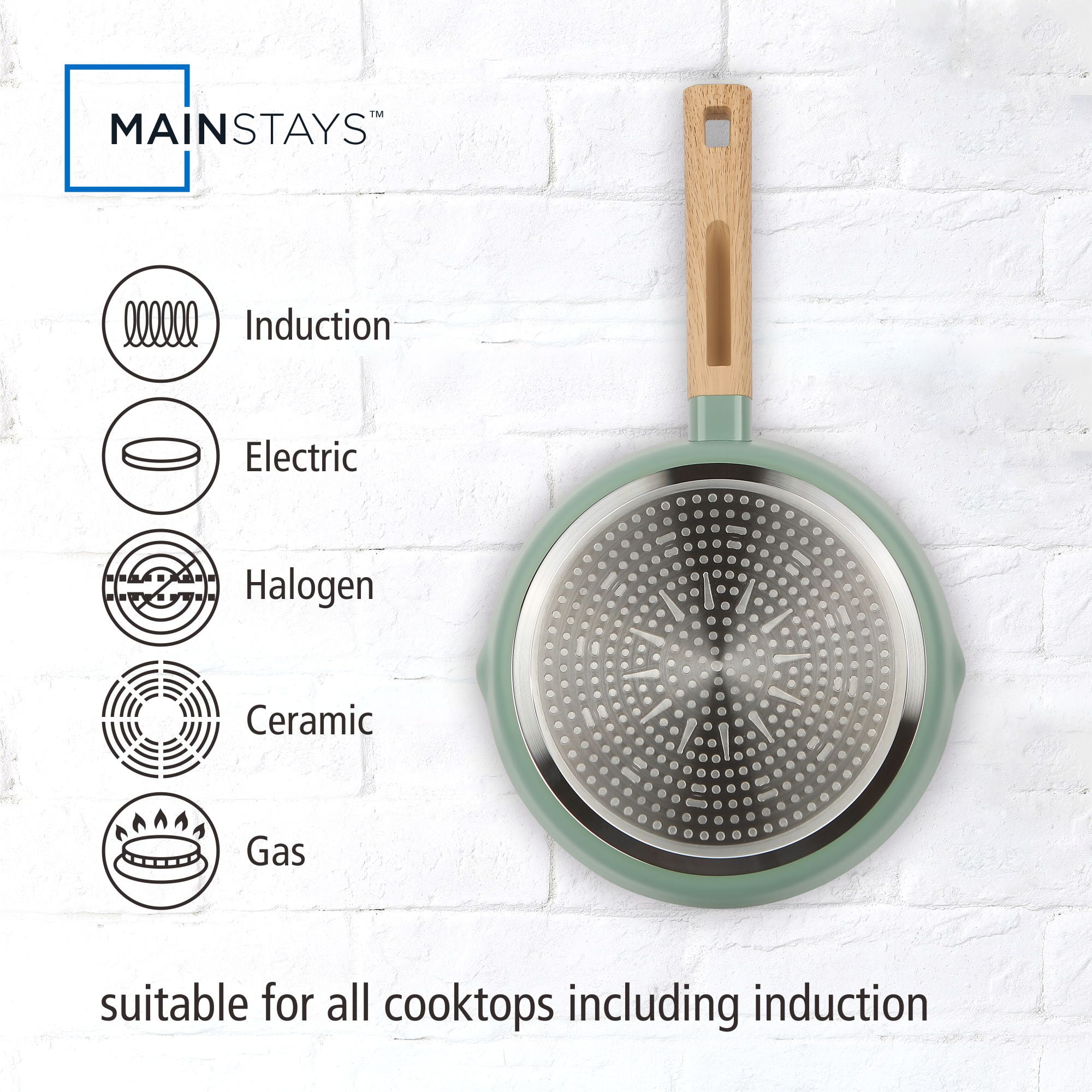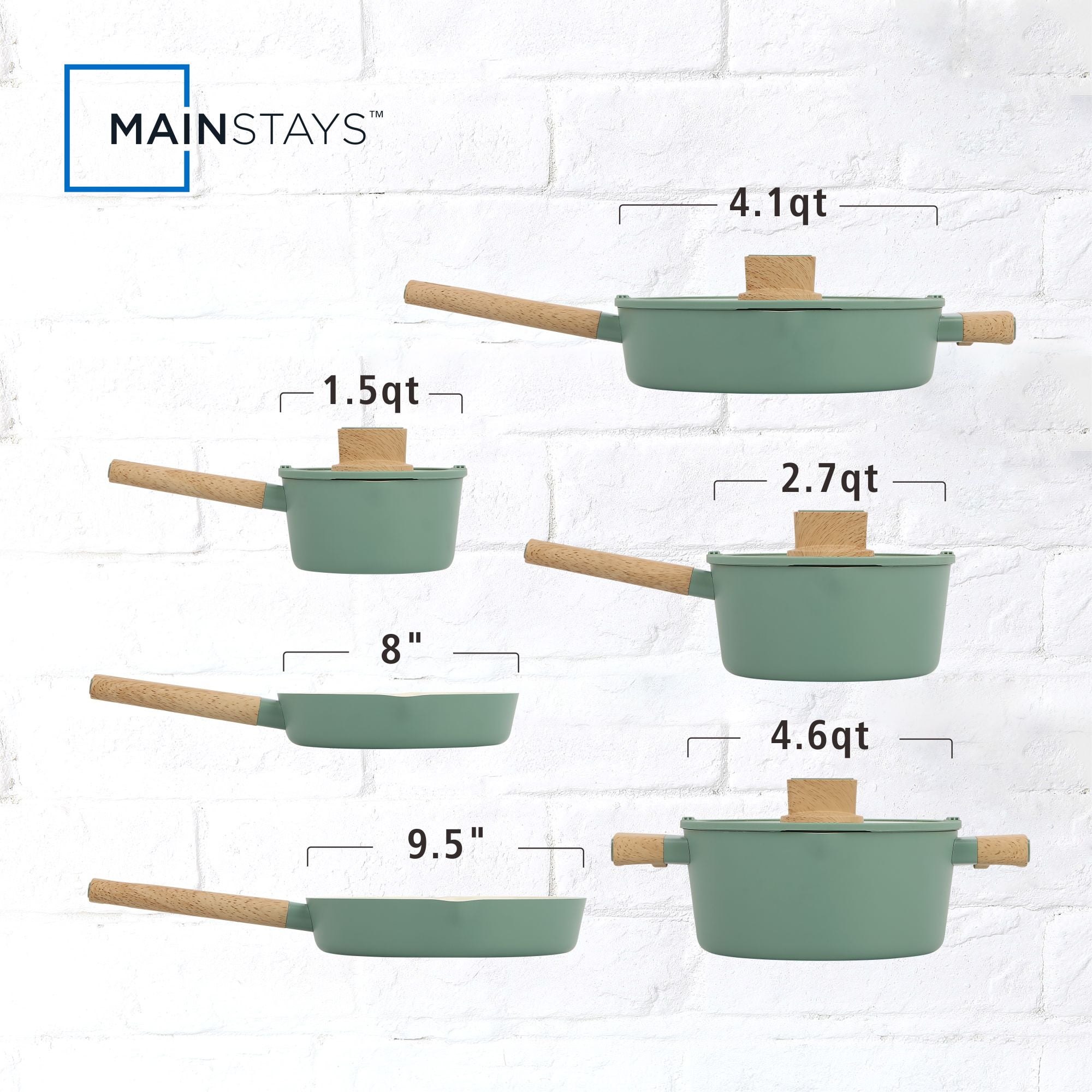 Aluminum body for fast and even heating Riveted handles for strong connection Suitable for all cooktops including induction Mainstays Simplicity 10 Pcs Aluminum Nonstick Ceramic Cookware Set Green Sage Dishwasher Safe