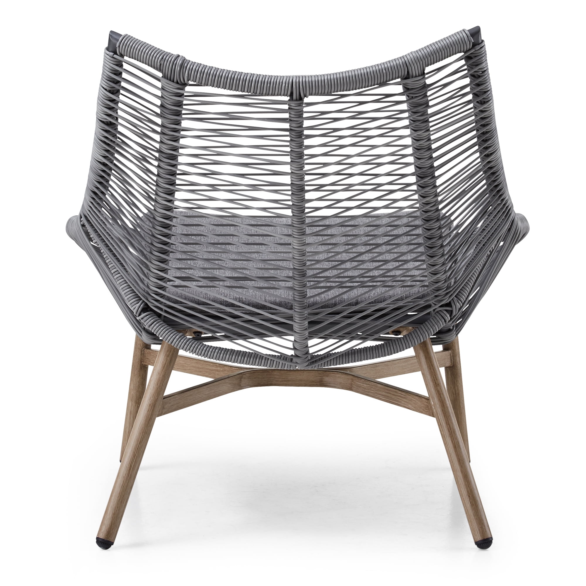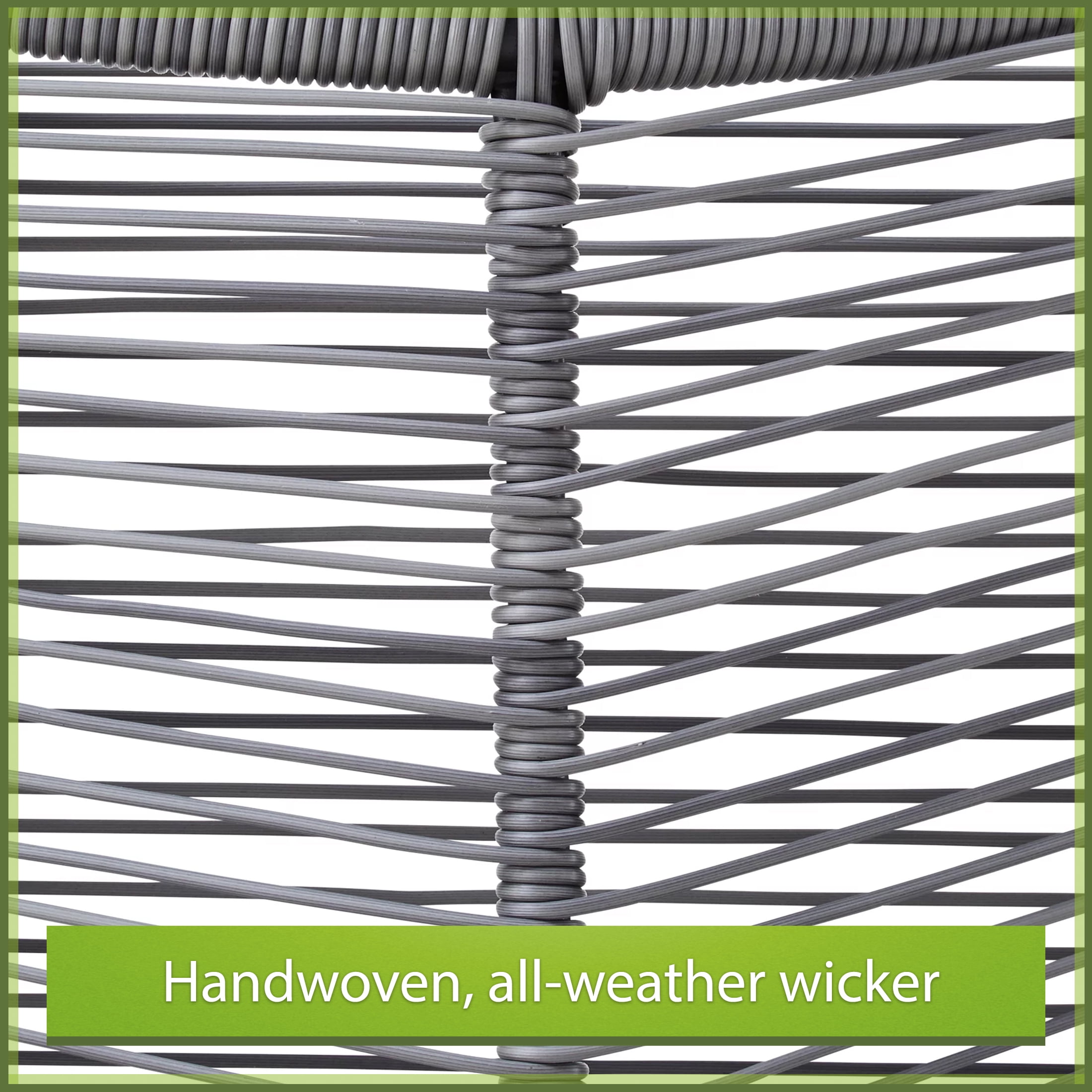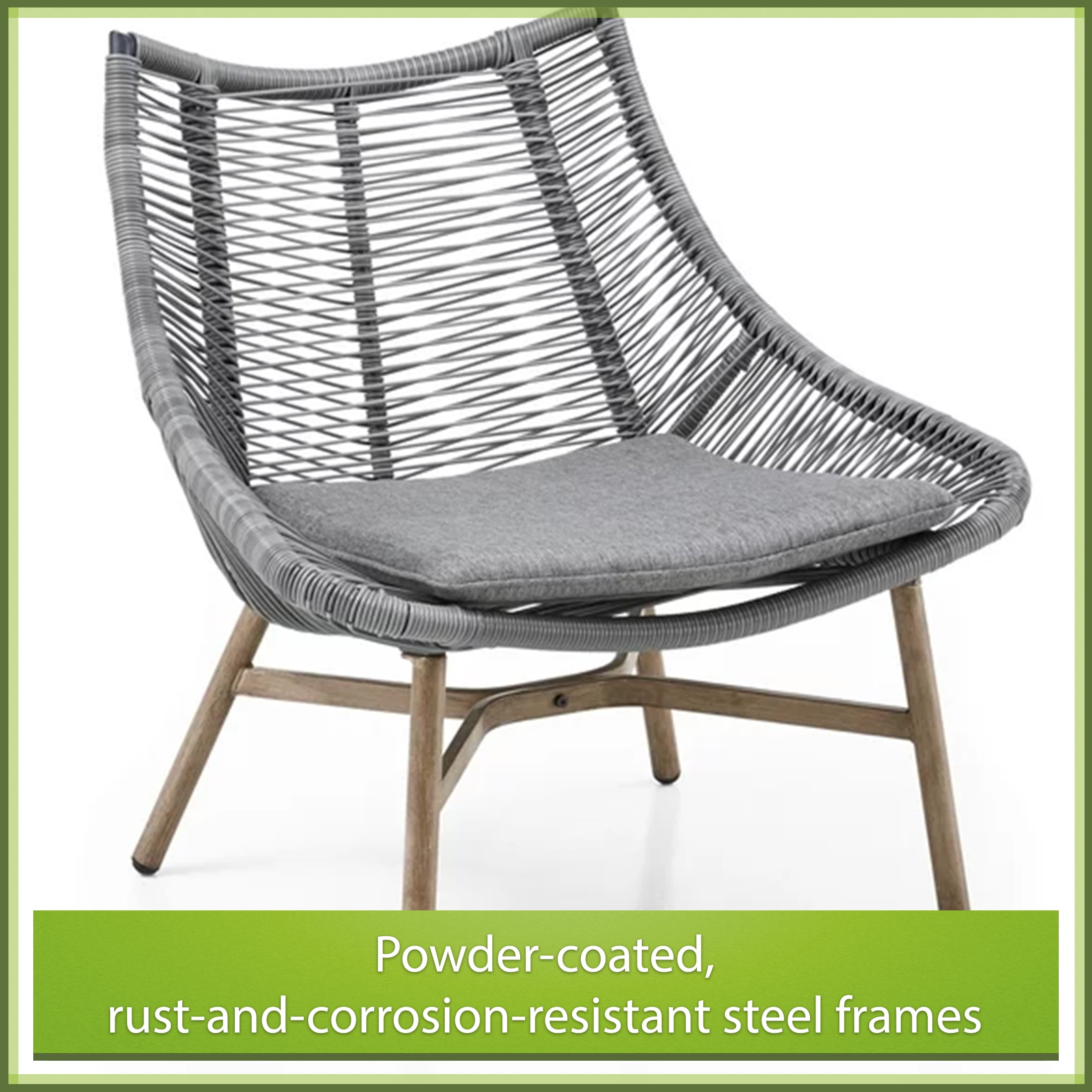 Mainstays Skyler 3-Piece Rope Chat Set, Grey Set includes 2 chairs and 1 side table Grey steel frames are e-coated and powder-coated to resist rusting, staining, and peeling in any weather Handwoven, all-weather wicker Cushions constructed of fade-resistant olefin fabric Chairs can support up to 250 lbs. Recommended for outdoor use Care: Clean with a soft cloth and mild soap Assembled product dimensions: Chair: 31.1” (D) × 32.68” (W) × 34.65” (H); Table: 22.44” (D) × 16.93” (H) Package dimensions: 33.07″ x 20.08″ x 27.95″, 66.08 lbs. Easy assembly required Product weight: Chair: 21.14 lbs.; Table: 11.03 lbs. Product materials: Steel, wicker, olefin fabric Color: Grey Model #: MSS236157386001