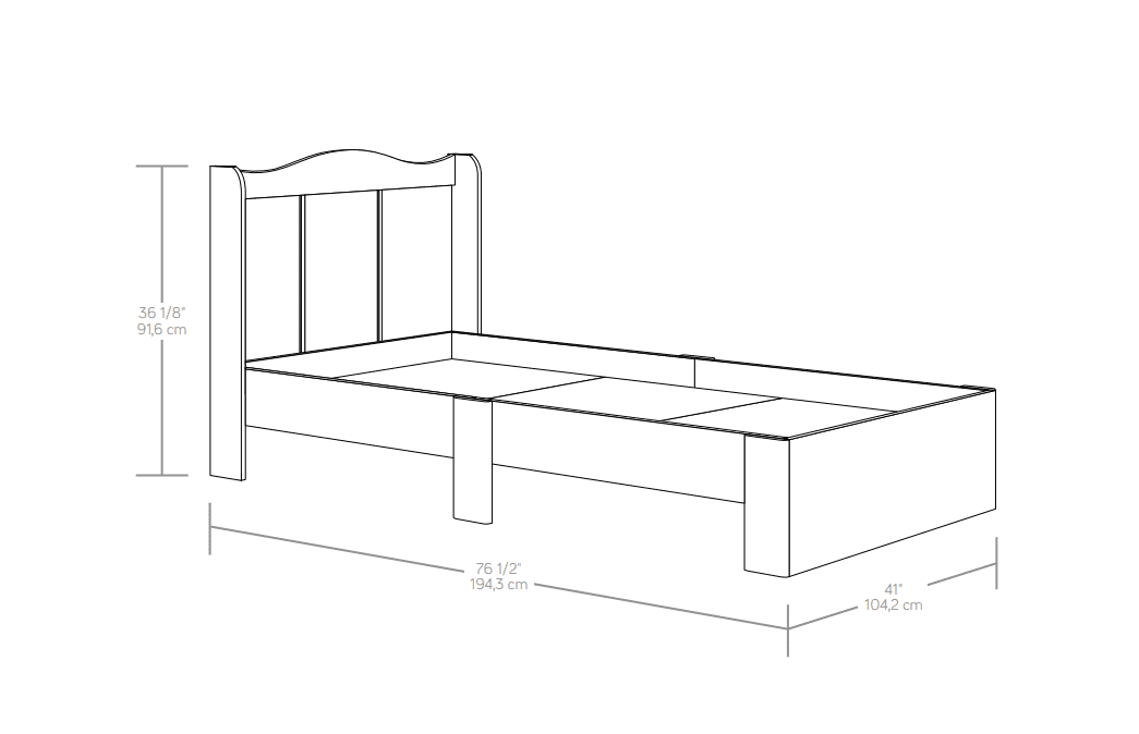 Assembled Dimensions: 41.02″ L x 76.5″ W x 36.06″ H Integrated headboard Accommodates most twin-sized mattresses Soft White finish Model #: 416546 Box Dimensions: 46.25″ L x 25.87″ W x 4.87″ H For additional questions or any issues, please contact the manufacturer at 1-800-523-3987. Be sure to check out the Mainstays Storybook collection for more great items!