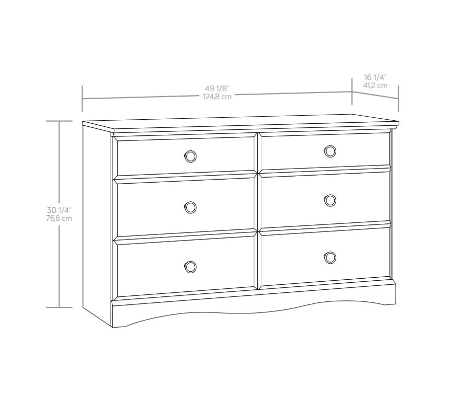 Mainstays Storybook Soft White Dresser, 49.13″ L x 16.22″ W x 30.24″ H Assembled Dimensions: Measures 49.13″ L x 16.22″ W x 30.24″ H, providing a compact yet functional size for various spaces Model Number: Identified as Model #420456, ensuring easy reference for purchasing or inquiries Box Dimensions: Comes in a box measuring 55.63″ L x 16.94″ W x 5.75″ H, making it manageable for shipping and storage Space-Efficient Design: The dimensions are ideal for fitting in smaller rooms or areas while still offering ample functionality Versatile Use: Perfect for use in living rooms, bedrooms, or home offices, blending seamlessly into any decor