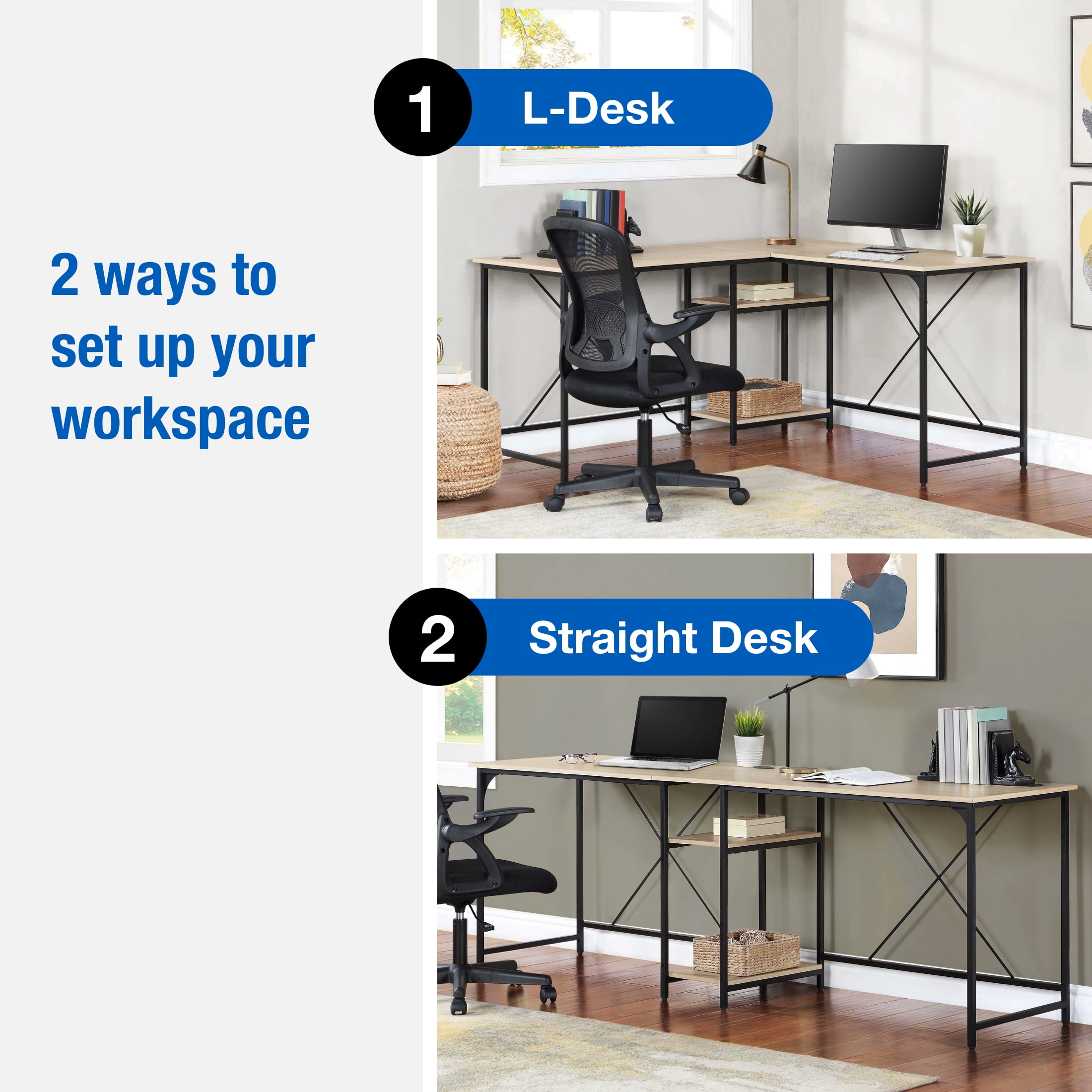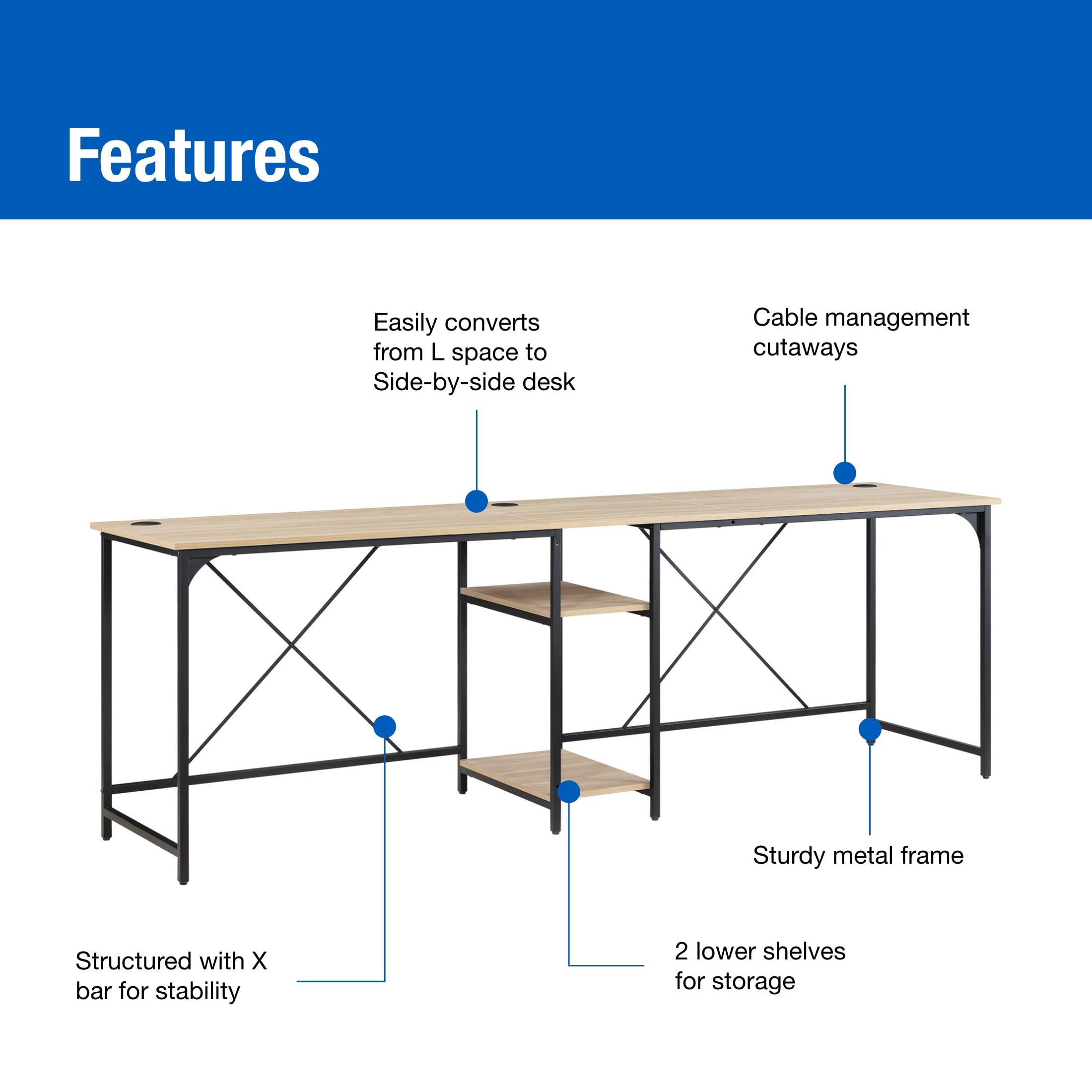 The two-way convertible Desk will be a great fit for your home office or commercial workspace. The multi-functional rectangle design allows you the flexibility to position the desk however you need, whether it’s used as a desk space for two with the side-by-side configuration or set up as one large L-shaped desk. The desktop surface is nice and large so you can spread out. Below the desk are 2 open shelves for storing books, devices or other accessories. The sturdy metal frame is structured with X bars for added stability. The desktops also provide options for managing wires and cables in an organized fashion. The clean lines of the sleek black frame and the variety of finish options make this desk a great fit for a variety of home decor styles. Whether you are looking for something modern, contemporary, transitional or anything in between, the Mainstays Convertible Desk will be a great centerpiece.