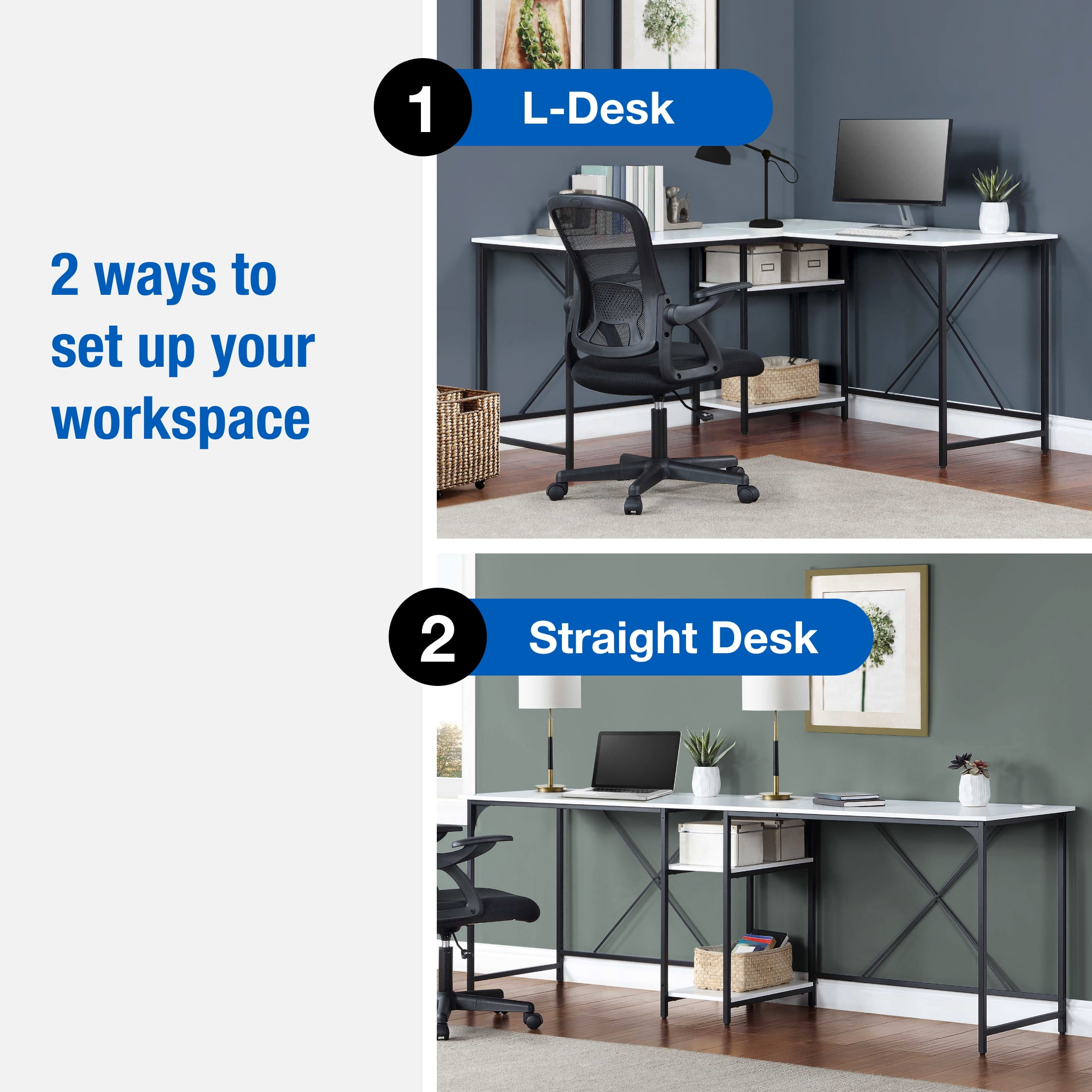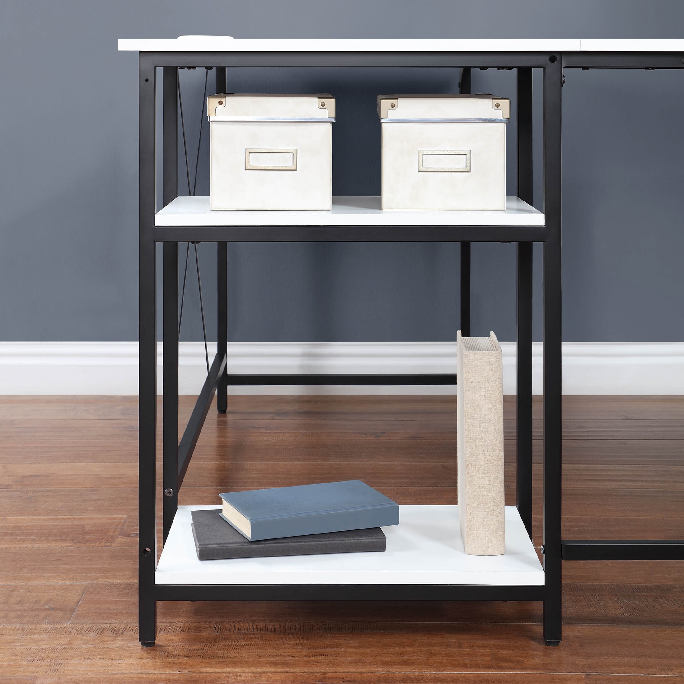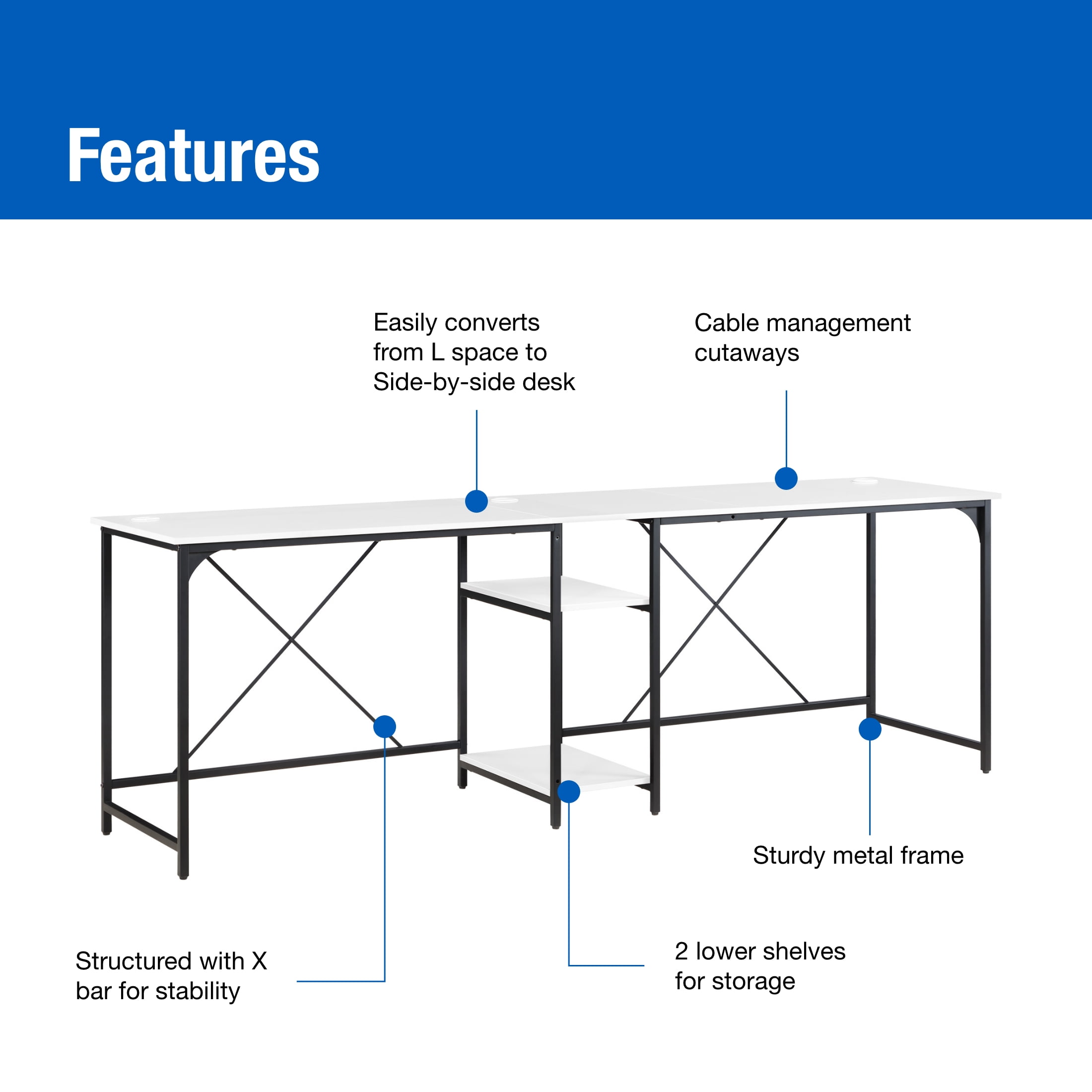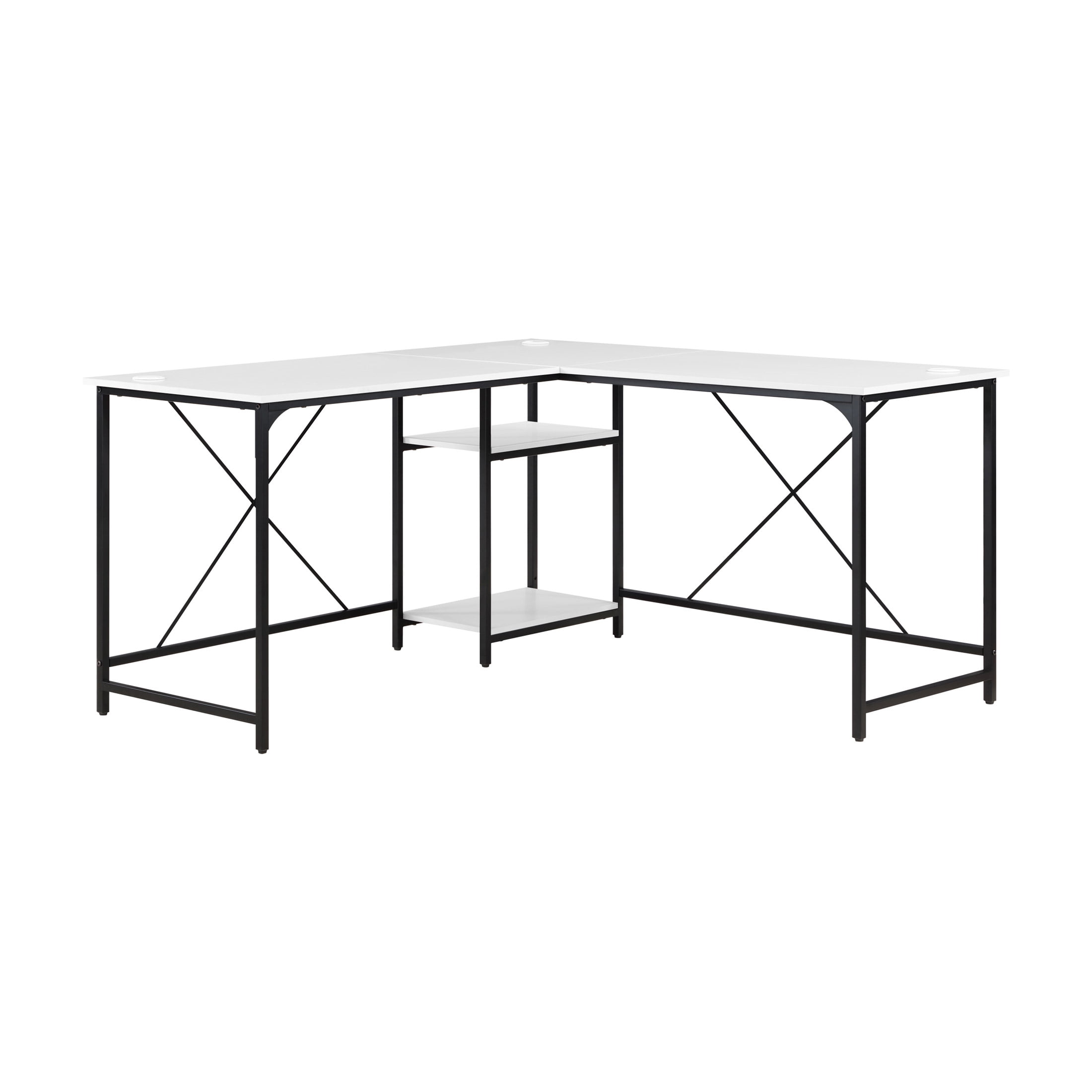 Easily converts from L space to Side-by-side desk Large desktop for working on projects, paying bills or doing homework 2 lower shelves for storing accessories, books and more Sturdy metal frame Structured with X bar for stability Wire management for organizing computer cords or charging cables The two rectangle shaped desks fit together in a corner or straight across to fit your needs Available Finishes: Black, Canyon Walnut, White, and Natural L-Desk Dimensions: 59” W x 53.7” D x 29.75” H (149.9cm x 136.4cm x 75.6cm) Extended Desk Dimensions: 90.7” W x 22” D x 29.75” H (230.4cm x 55.9cm x 75.6cm) Packaging Dimensions: 43.375 W x 24.625 D x 6.5” H Model# MS62025004001, MS3325004710003, MS3325004710002, MS3325004710001