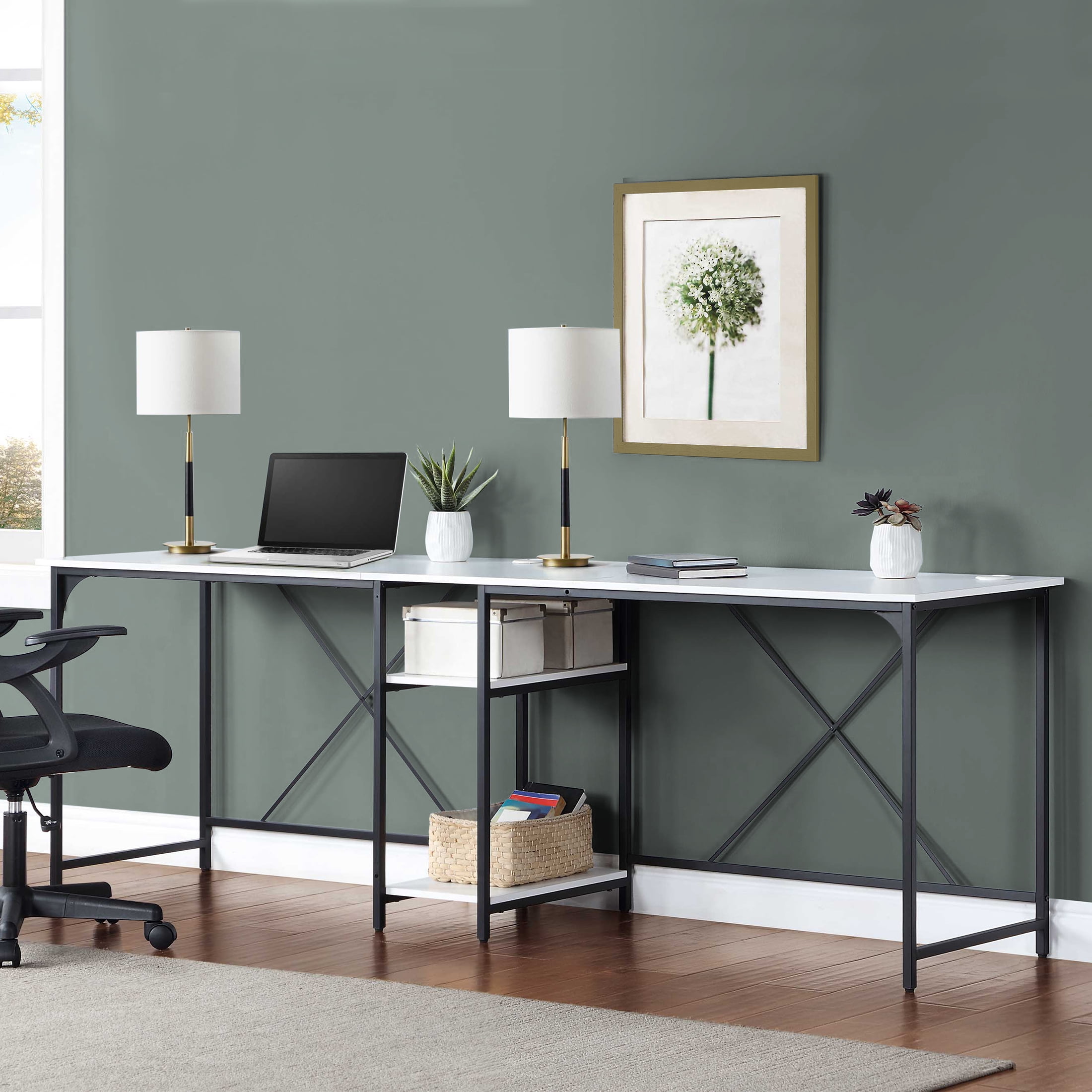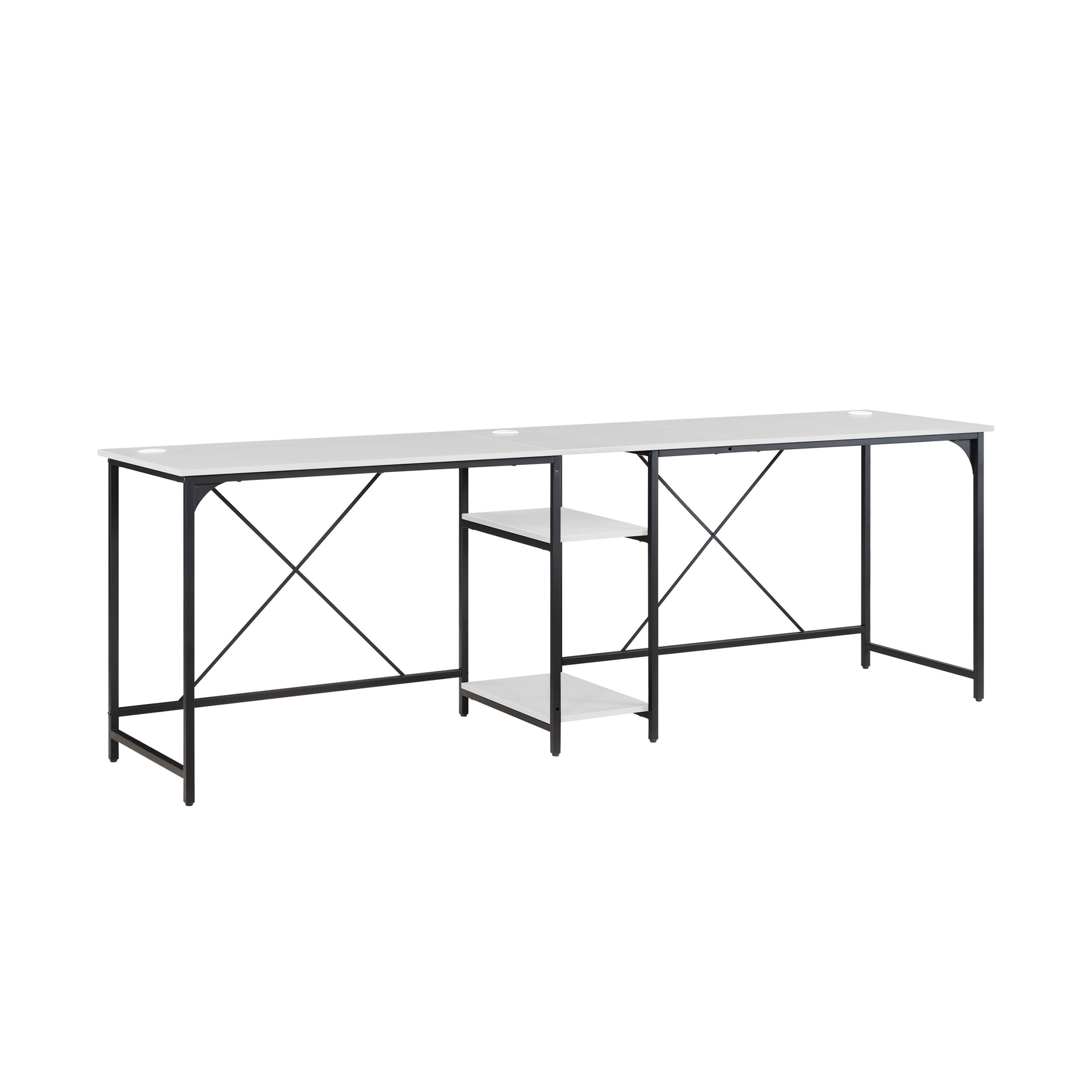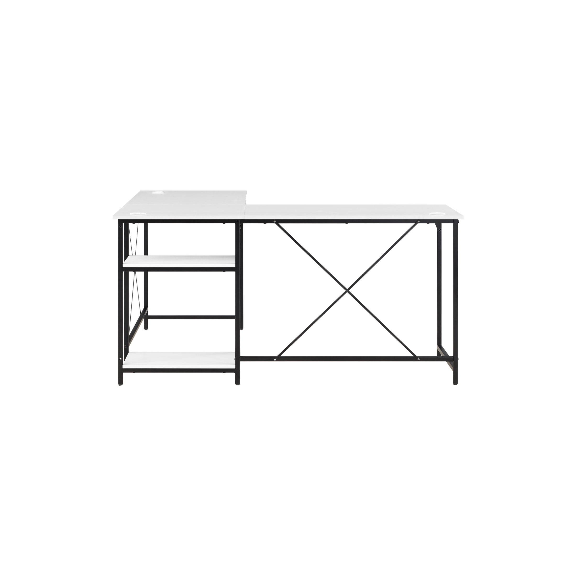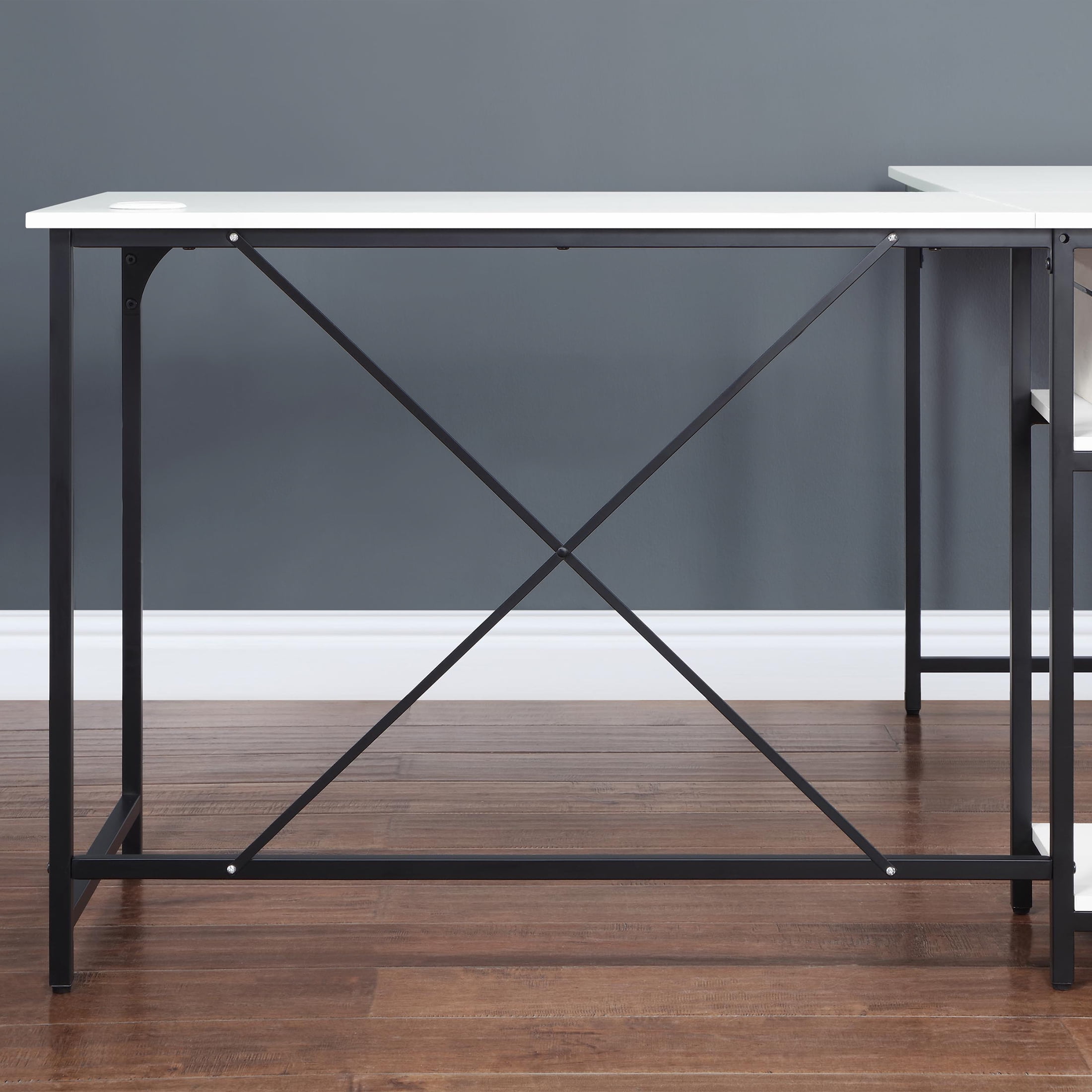 Easily converts from L space to Side-by-side desk Large desktop for working on projects, paying bills or doing homework 2 lower shelves for storing accessories, books and more Sturdy metal frame Structured with X bar for stability Wire management for organizing computer cords or charging cables The two rectangle shaped desks fit together in a corner or straight across to fit your needs Available Finishes: Black, Canyon Walnut, White, and Natural L-Desk Dimensions: 59” W x 53.7” D x 29.75” H (149.9cm x 136.4cm x 75.6cm) Extended Desk Dimensions: 90.7” W x 22” D x 29.75” H (230.4cm x 55.9cm x 75.6cm) Packaging Dimensions: 43.375 W x 24.625 D x 6.5” H Model# MS62025004001, MS3325004710003, MS3325004710002, MS3325004710001