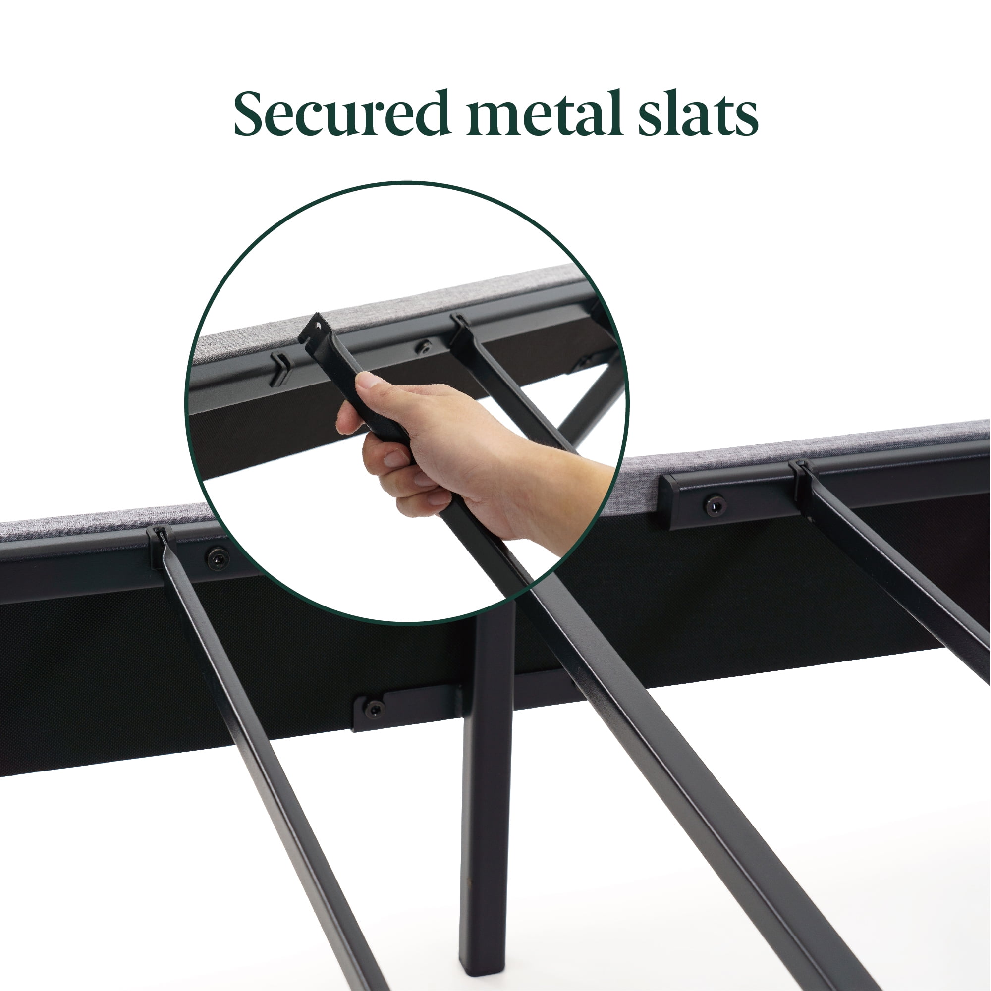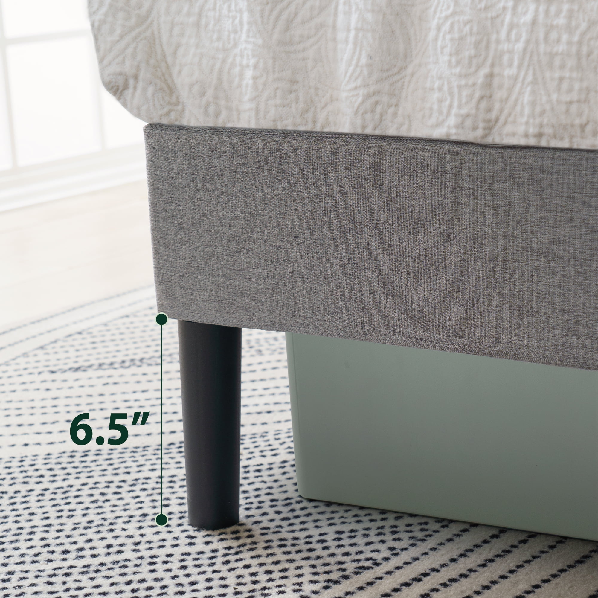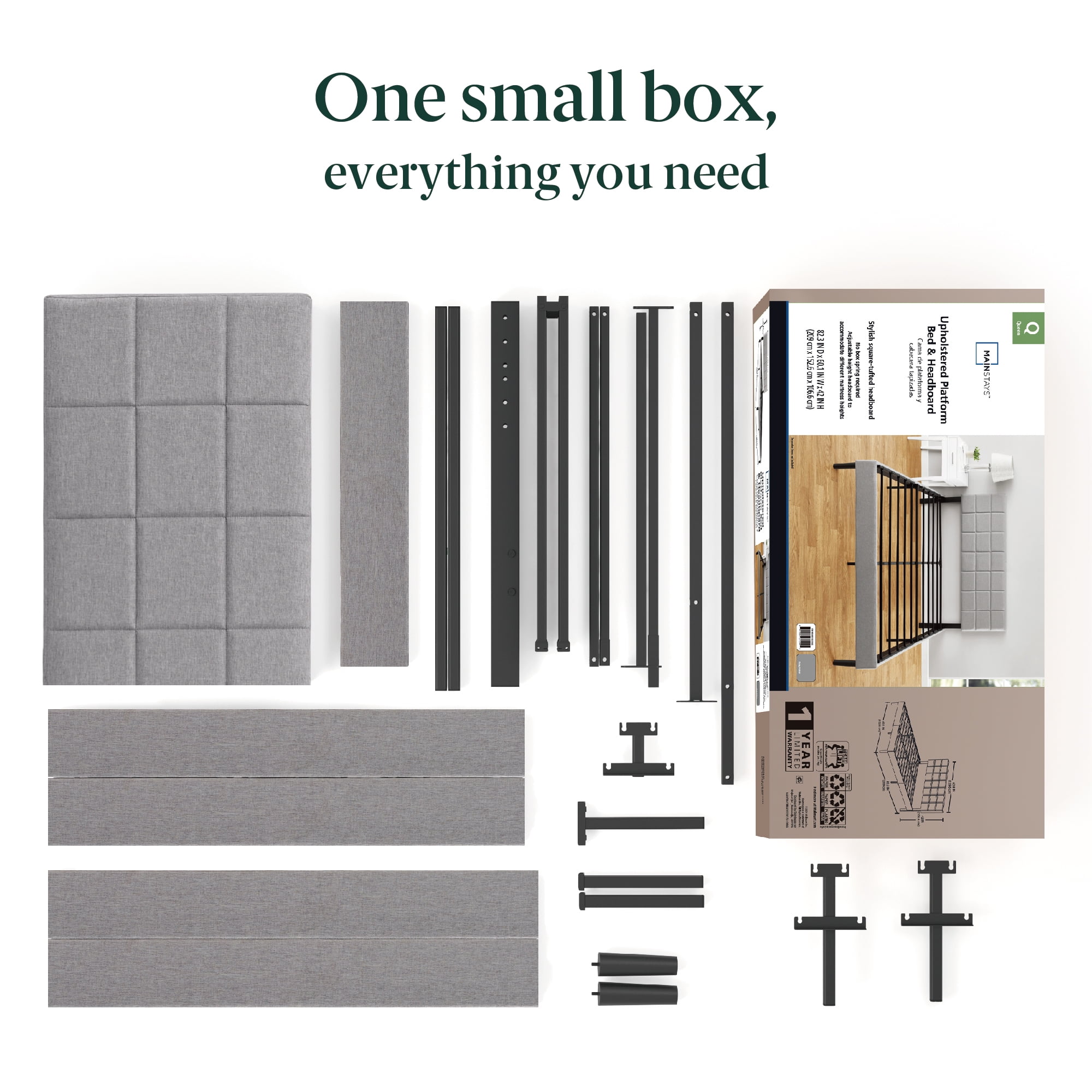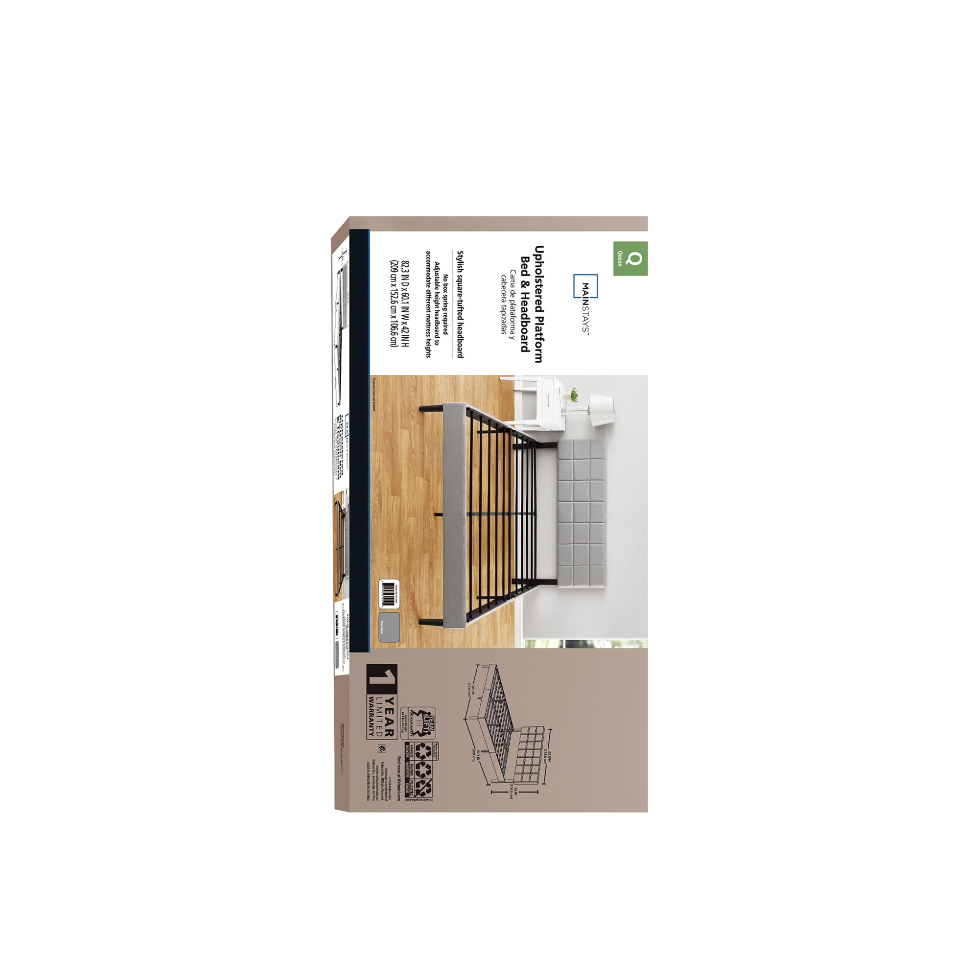 Mainstays Upholstered Platform Bed, Queen DURABLY DESIGNED – Interior steel framework and dense foam padding add comfort and longevity NO BOX SPRING NEEDED – Durable metal slats support and extend the life of your latex, memory foam or spring mattress without the need for a box spring HEIGHT ADJUSTABLE HEADBOARD – From 38″ to 42″ height for different mattress thickness All parts, tools and instructions you’ll need to build the bed Queen size supports a maximum weight capacity of 700 lbs 82 L x 63 W x 42 H Inches Age Group: Adult, Universal. Mattress sold separately